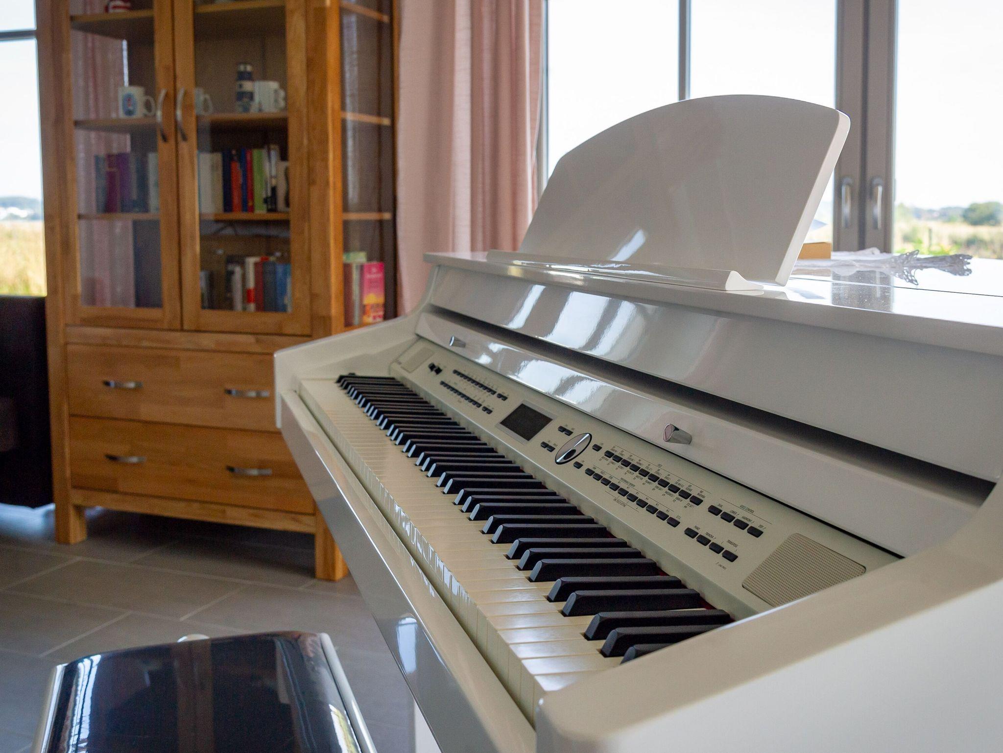 Herzstück des Hauses ist der große, offene Wohnbereich mit bequemen Sitzmöbeln, Smart-TV, Kaminofen, Esstisch, Küche und der vorgelagerten Sonnenterrasse. Alle Musikfreunde werden sich besonders über das E-Piano freuen, das nicht nur sehr dekorativ ausschaut, sondern für das auch die passenden Notenbücher in reicher Auswahl vorhanden sind.