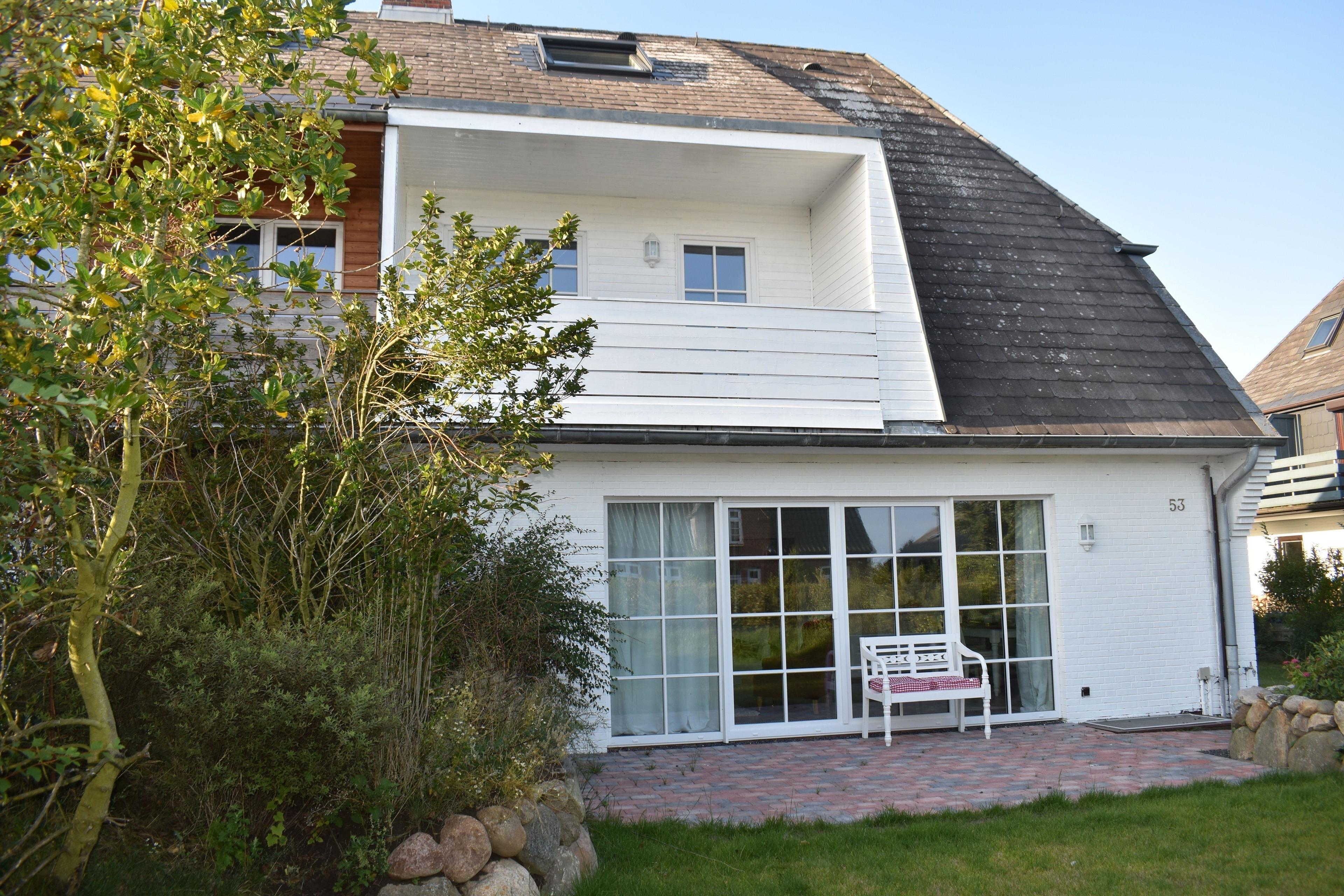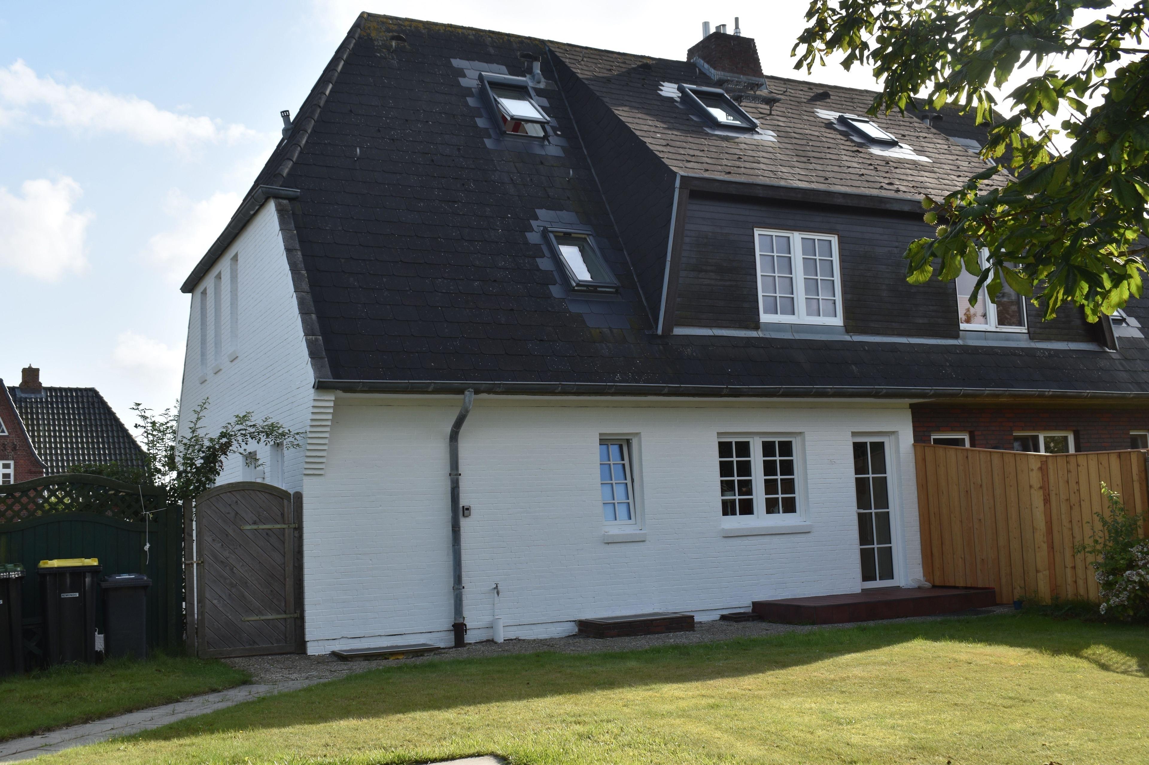 Das Haus wird von einem rund 600 Quadratmeter großen eingewachsenen Garten umgeben. Vom Balkon an der Südseite kann man den Weitblick bis zum Deich genießen. Vom Küchenessplatz blickt man auf den Garten.