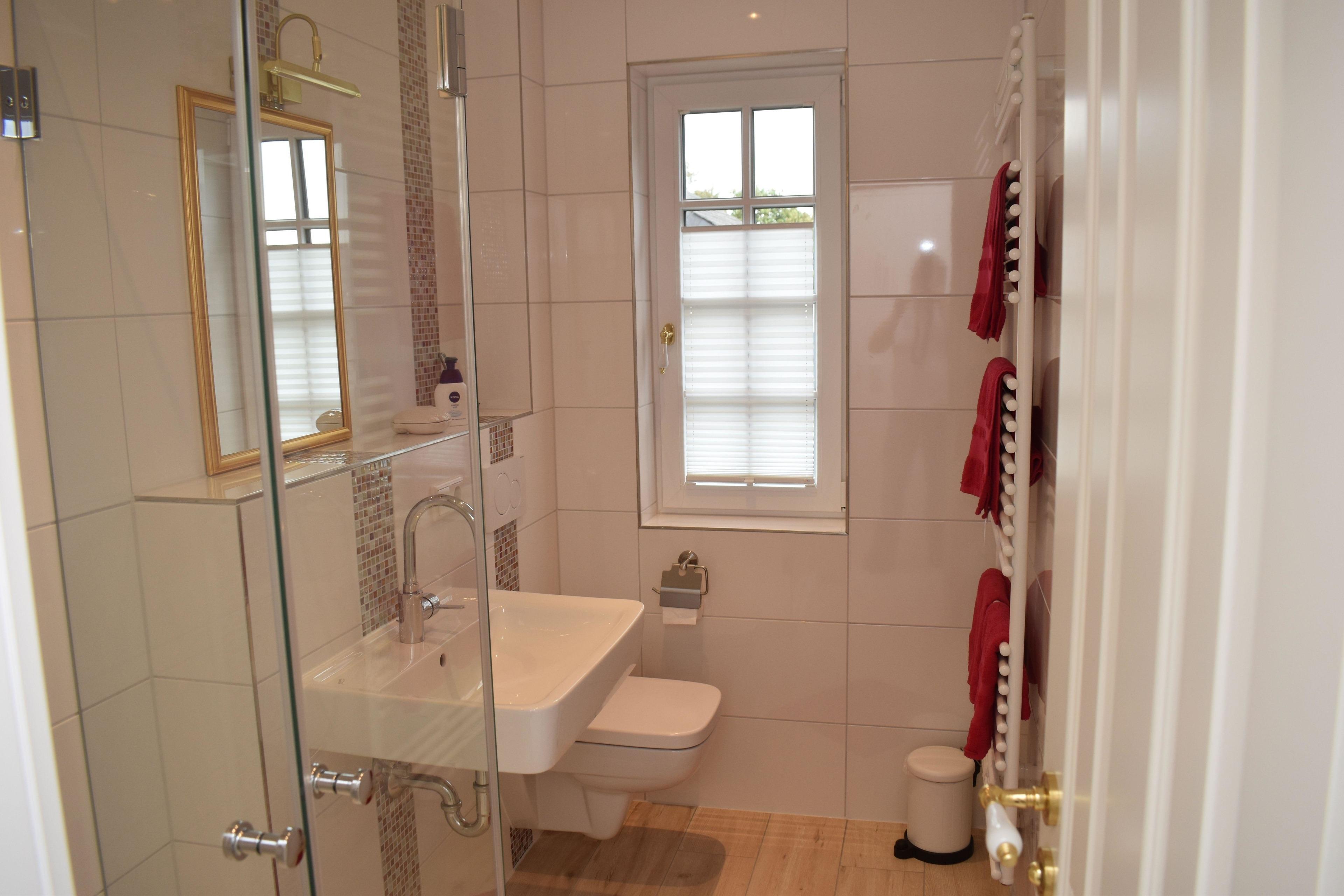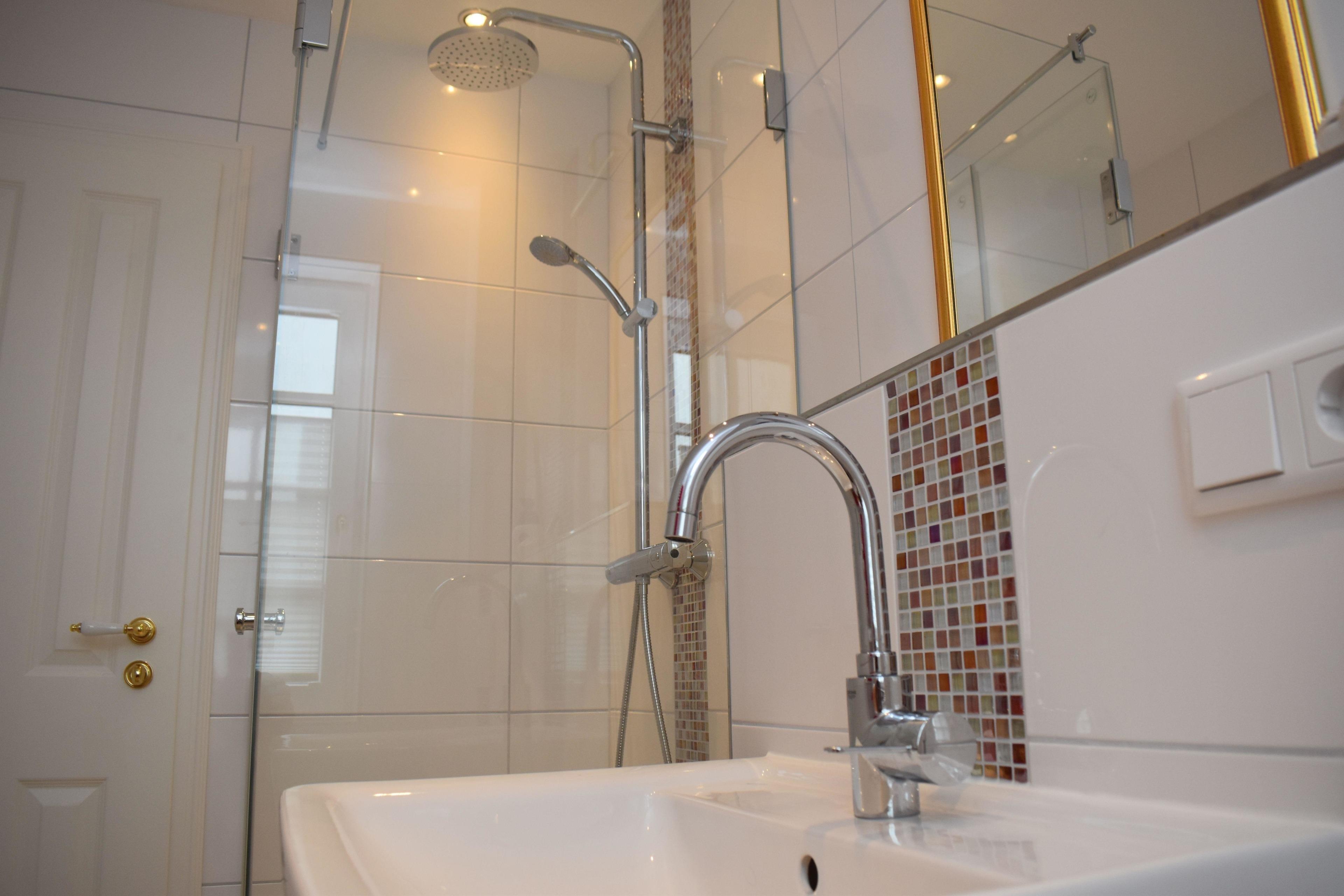 Im komplett neu gestalteten Bad kann man sich in einer fast barrierefreien Dusche (2 cm Brausetasse) erfrischen.
