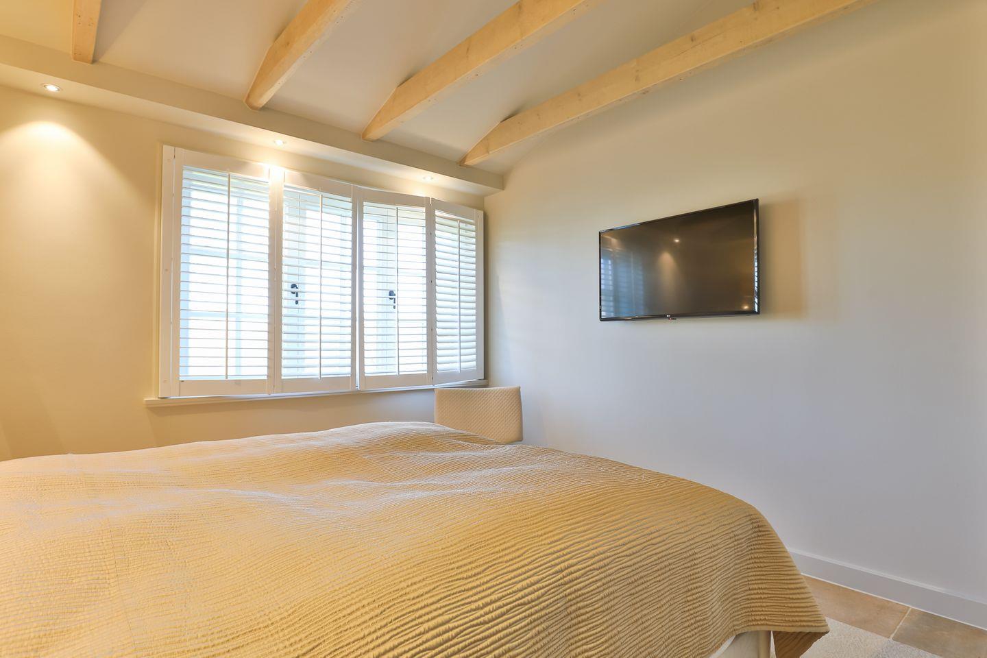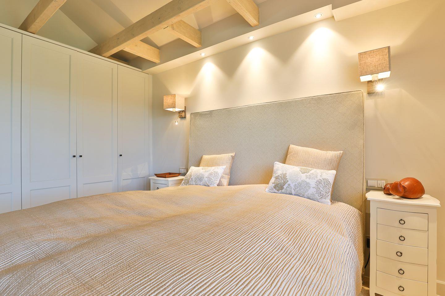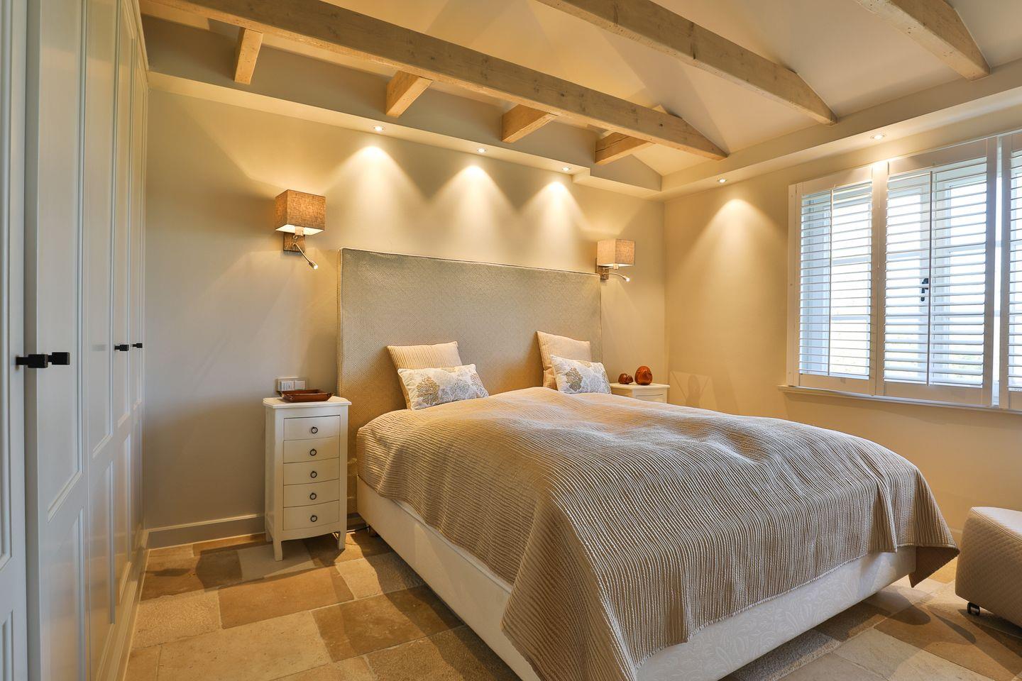 Hingucker mit freiliegenden Holzbalken und einem traumhaften Kingsize-Bett mit