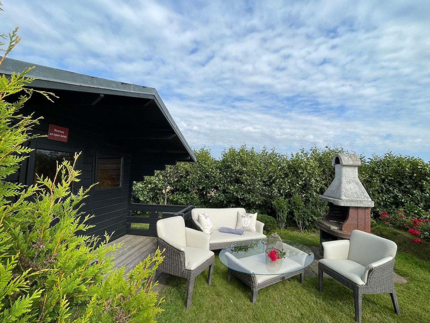 Garten mit eigenem Saunahaus zum Entspannen.