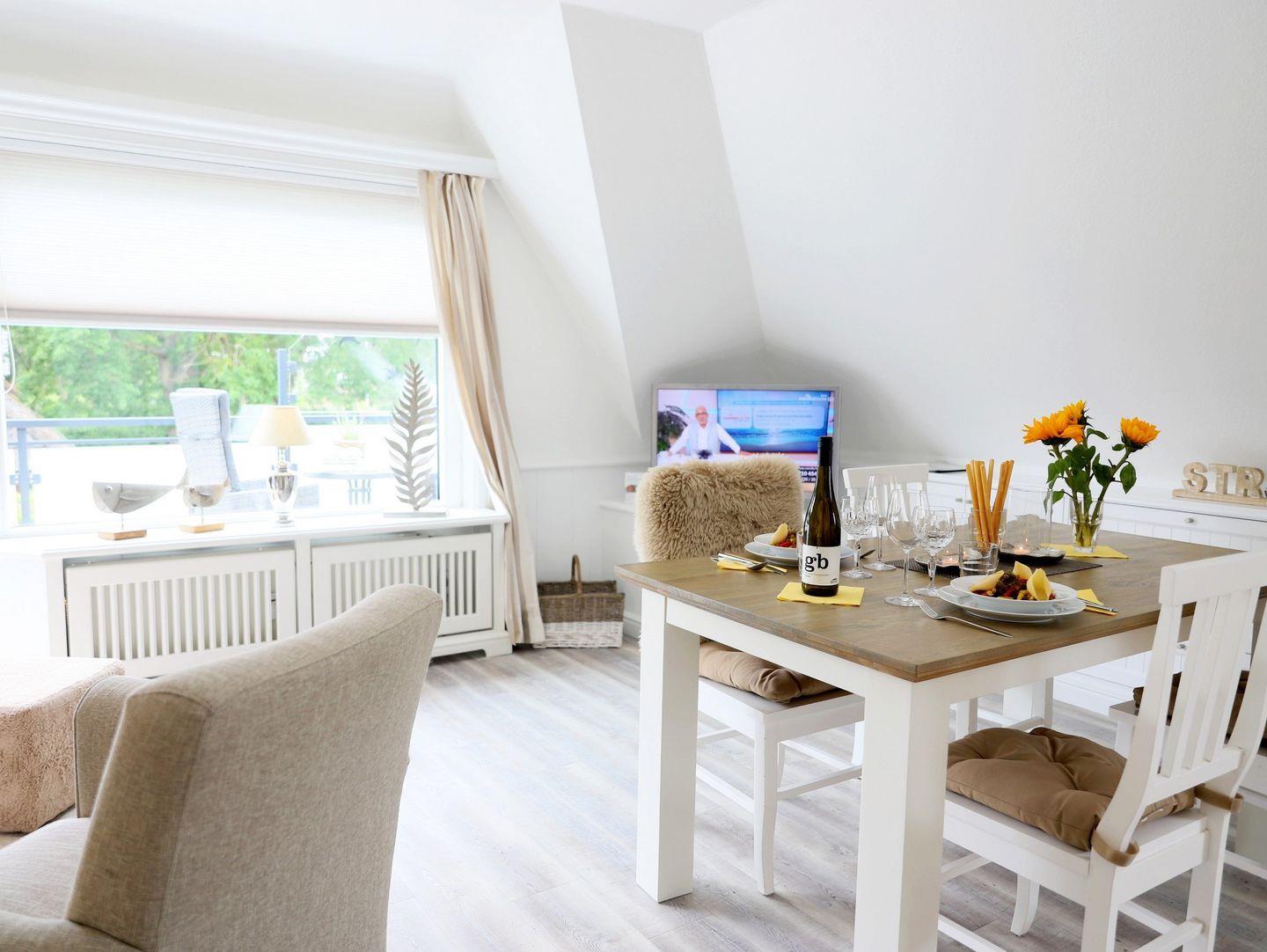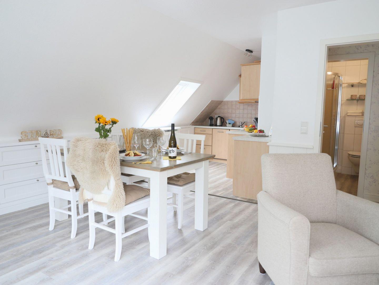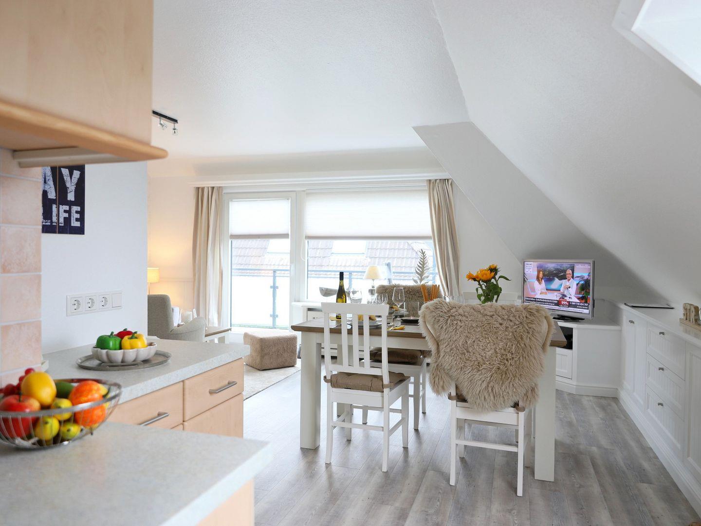 Lichtdurchflutete 2-Ebenen-Wohnung (ca. 60 m²) in Morsum. 1 Schlafzimmer, West-Balkon und kostenfreier Stellplatz. Modernes Ambiente, hochwertige Küche und kostenloses Internet. Perfekt für eine erholsame Auszeit.