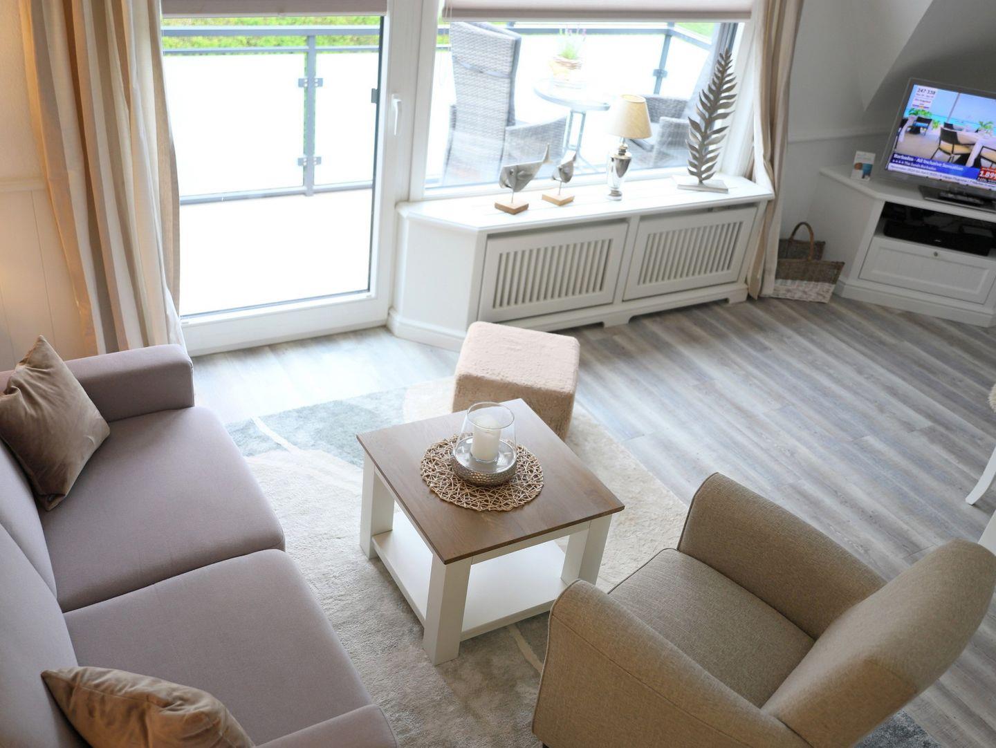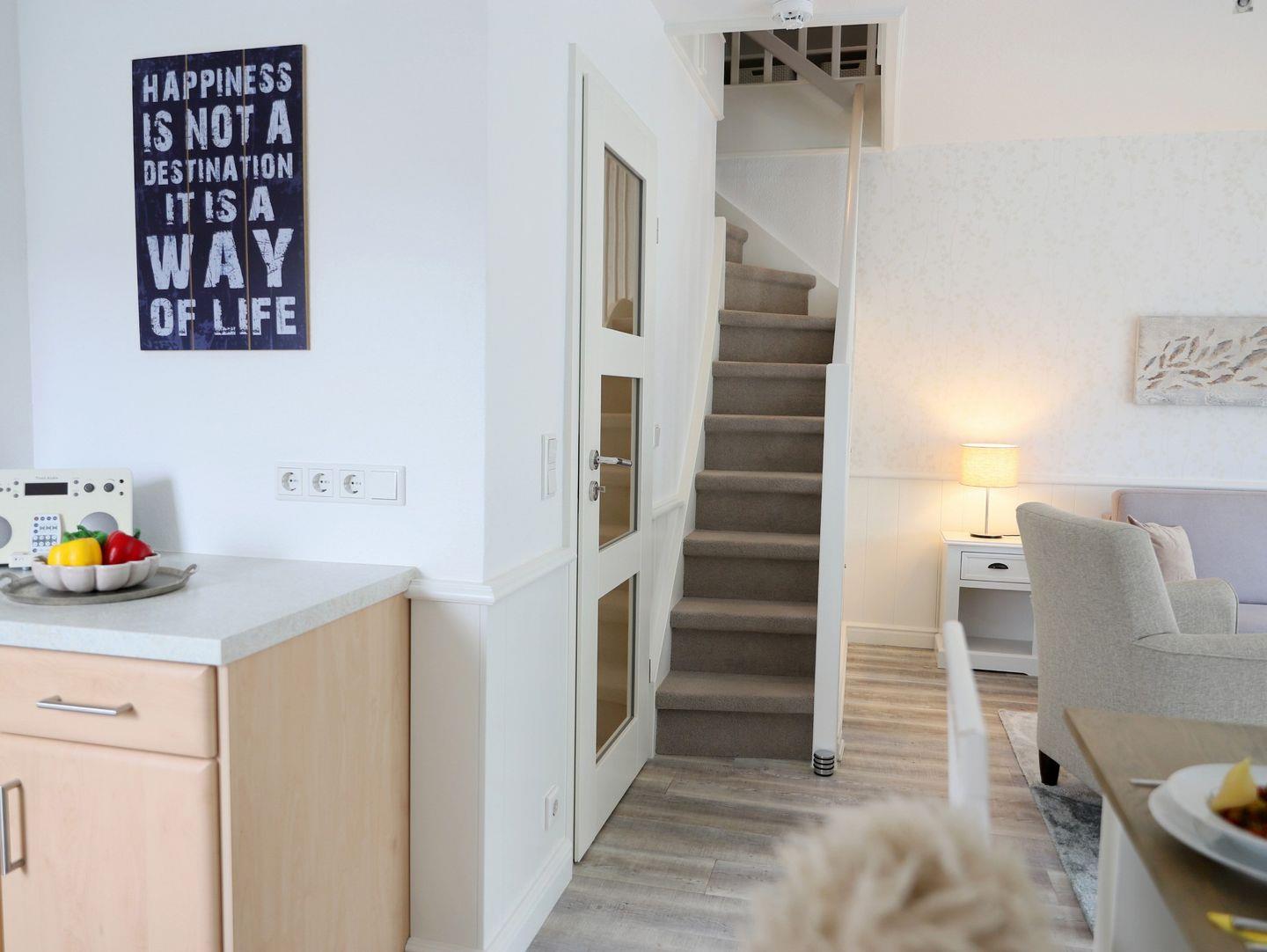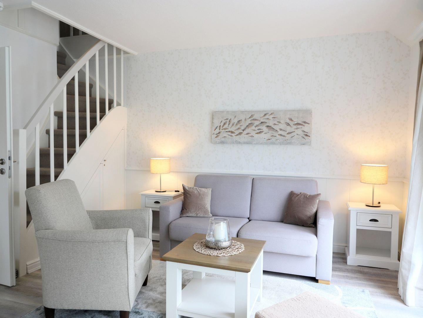 Lichtdurchflutete 2-Ebenen-Wohnung (ca. 60 m²) in Morsum. 1 Schlafzimmer, West-Balkon und kostenfreier Stellplatz. Modernes Ambiente, hochwertige Küche und kostenloses Internet. Perfekt für eine erholsame Auszeit.