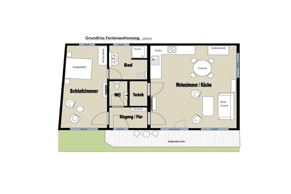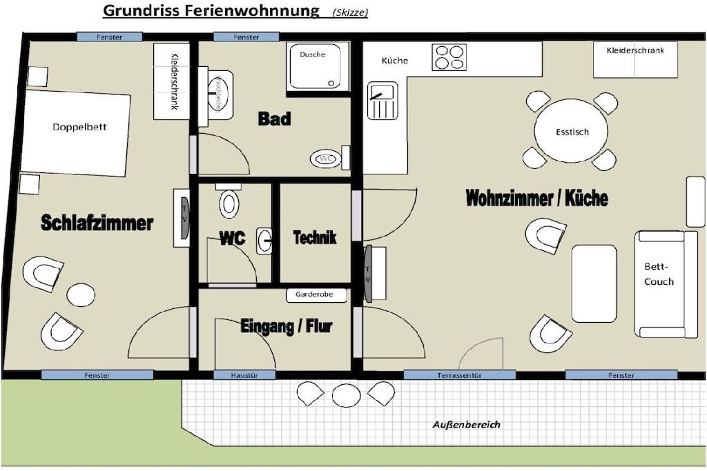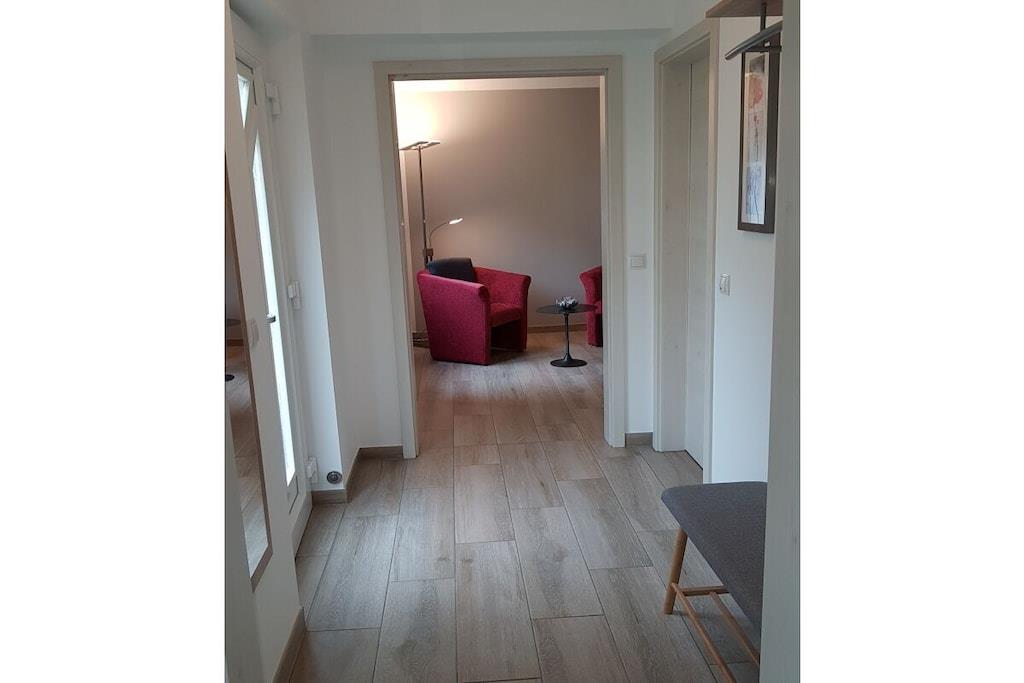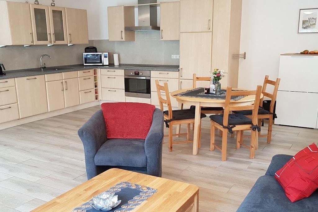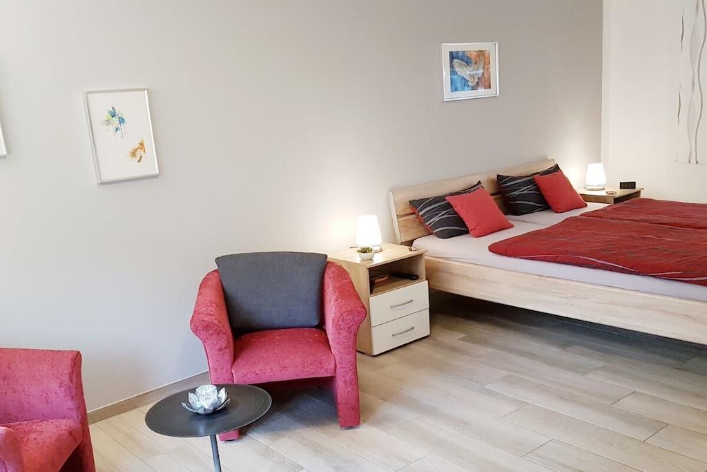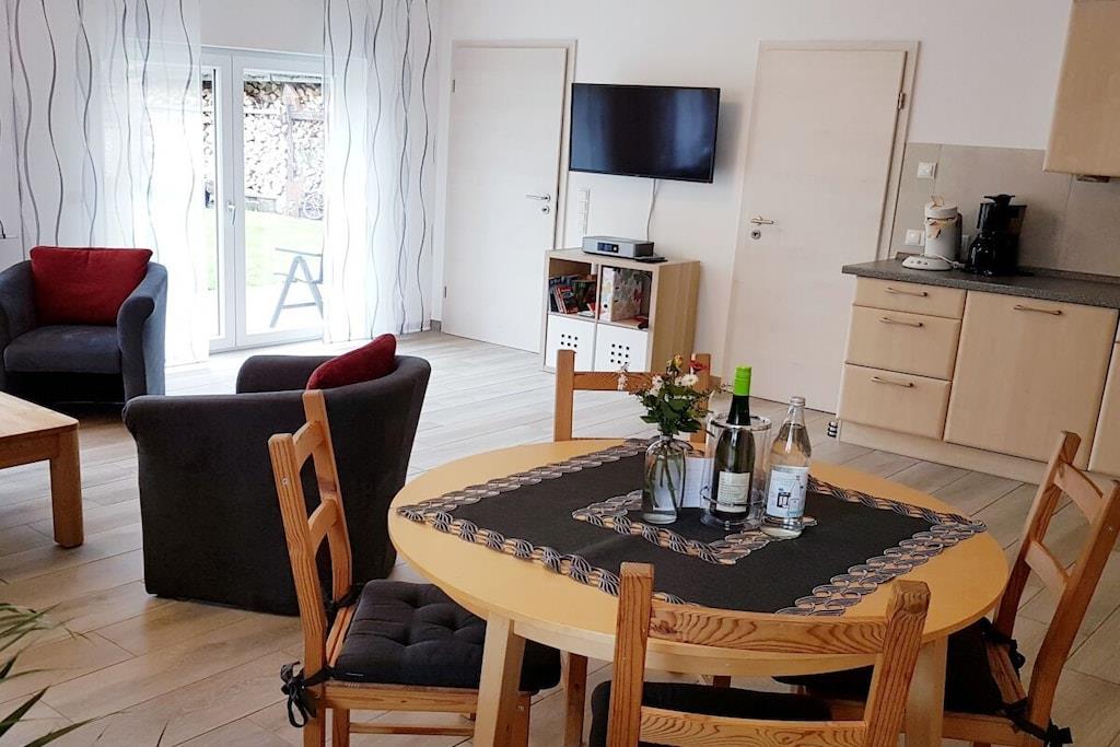 Vores ferielejlighed i stueetagen af høj kvalitet ligger i den charmerende vinlandsby Moselkern. Den tilbyder 75 m² boligareal, fordelt på en rummelig stue med integreret køkken, et soveværelse med siddeområde, et badeværelse med bruseniche og et separat toilet. Aircondition blev installeret i midten af august 2025, hvilket sikrer en behagelig temperatur selv i varmt vejr. Det fuldt udstyrede køkken inkluderer opvaskemaskine, induktionskogeplade, ovn, køleskab/fryser, mikrobølgeovn, kaffemaskine, pod-kaffemaskine, brødrister, elkedel, æggekoger og meget mere. Sofaen kan nemt laves om til en komfortabel 1,70 m bred seng med lamelbund og koldskumsmadras. Lejligheden har derfor plads til op til fire personer. Lejligheden har også to fladskærms-satellit-tv'er (et i stuen og et i soveværelset) og et kompakt stereoanlæg med Bluetooth, cd-afspiller og radio. LAN/Wi-Fi er tilgængeligt, ligesom en vaskemaskine/tørretumbler. Der er gratis parkering lige foran ejendommen. Der er også opbevaringsplads til cykler. Lejligheden har en have med siddeområde og et ekstra overdækket siddeområde. Der er også hynder, parasol samt grill med både kul og el. Ikke-ryger lejlighed. Kæledyr er ikke tilladt.