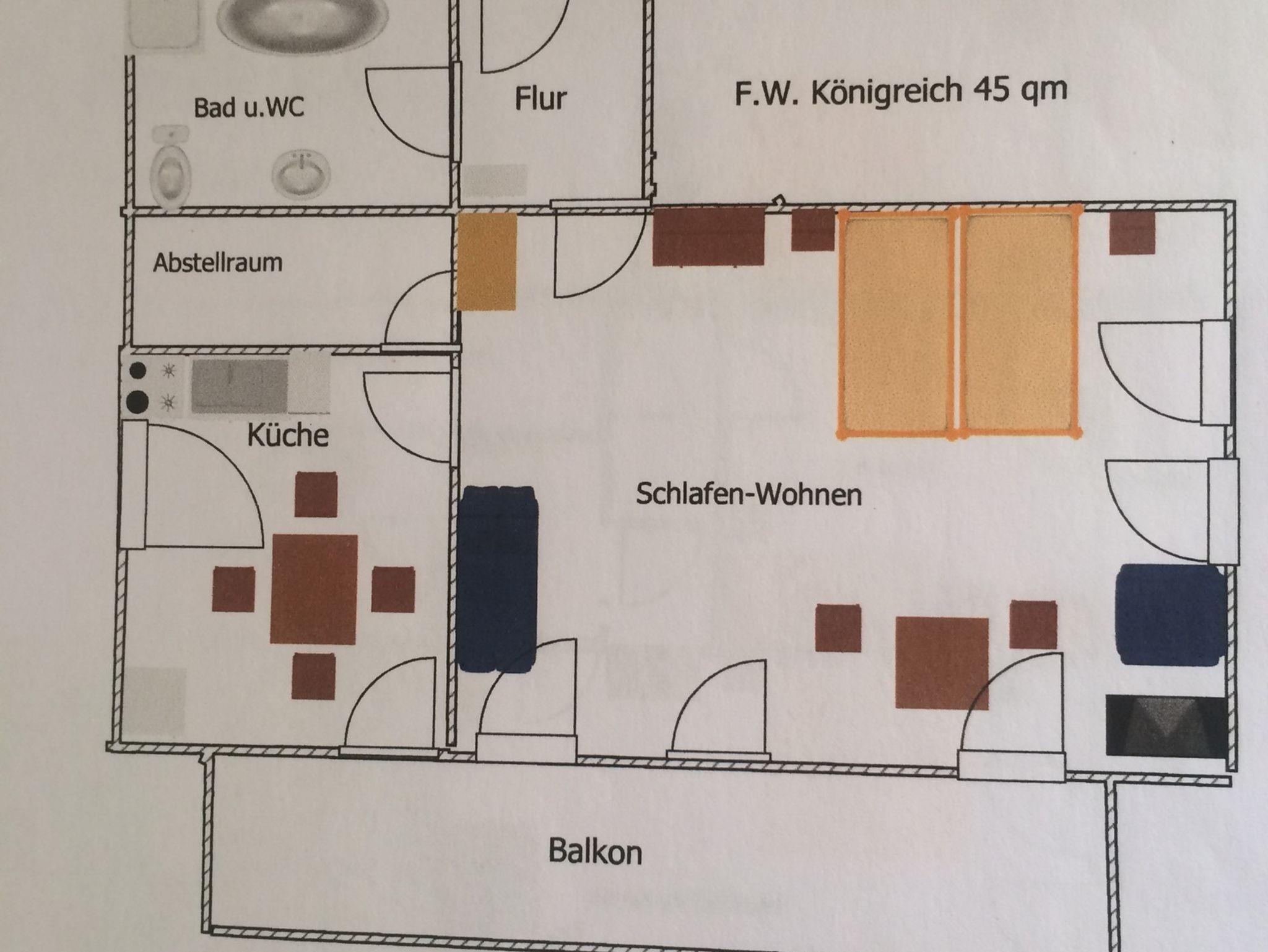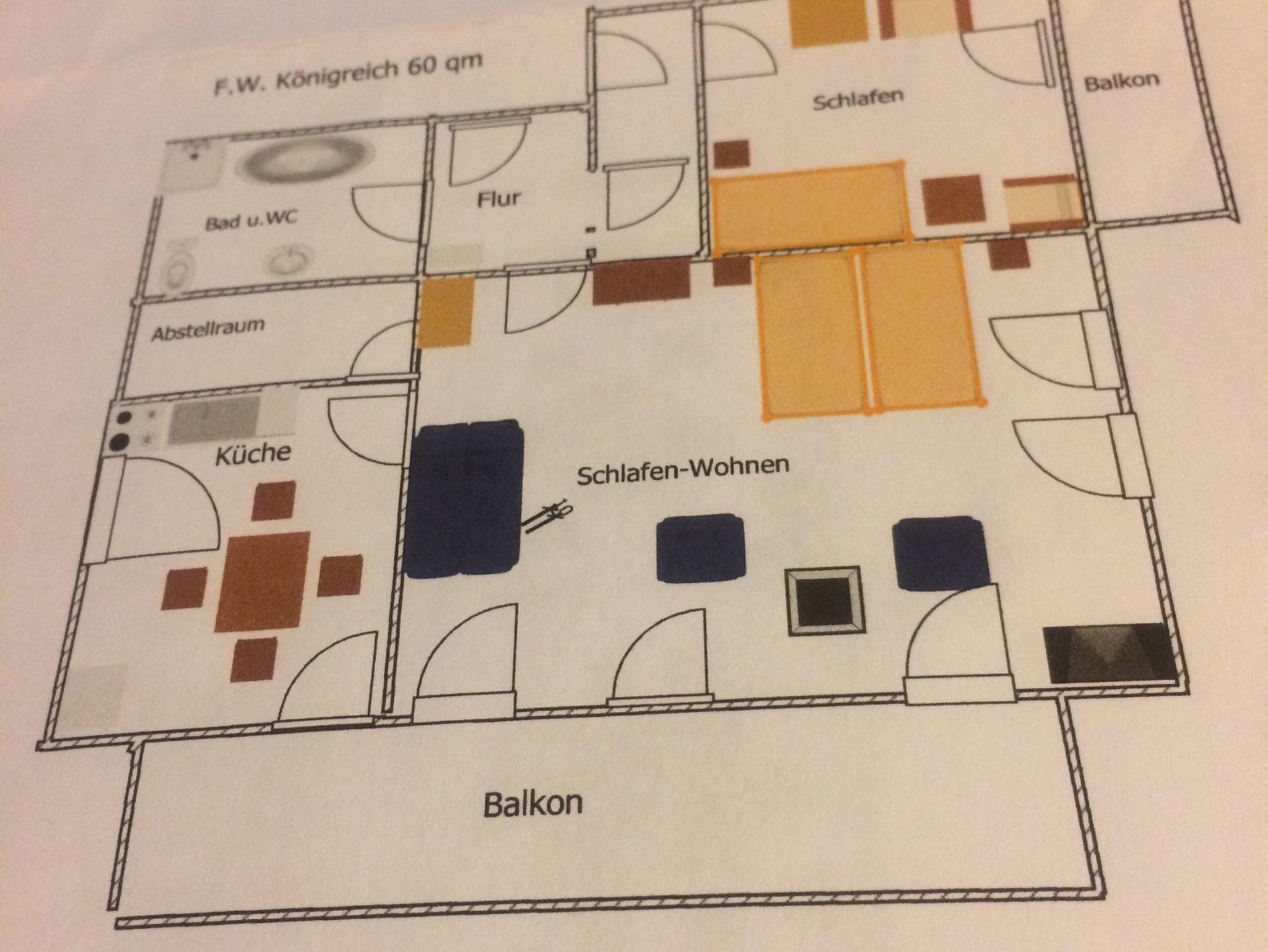 Unsere Ferienwohnung Königreich ist ca. 60qm groß und bietet Platz für bis zu 3 Personen. Die Ferienwohnung verfügt über einen kombinierten Wohn-Schlafraum (ca. 35qm) mit einem Doppelbett, einer Sitzgruppe und einem TV. Von hier gelangen Sie auf den Balkon. Die Küche ist voll ausgestattet mit einem Kühlschrank mit Gefrierfach, einer Mikrowelle, einer Geschirrspülmaschine, sowie einem Toaster und einer Kaffeemaschine. Das Bad verfügt über eine Dusche, ein WC sowie ein Waschbecken. Parkplatz und Wlan stehen kostenfrei zur Verfügung. Die Wohnung ist eine Nichtraucherwohnung.