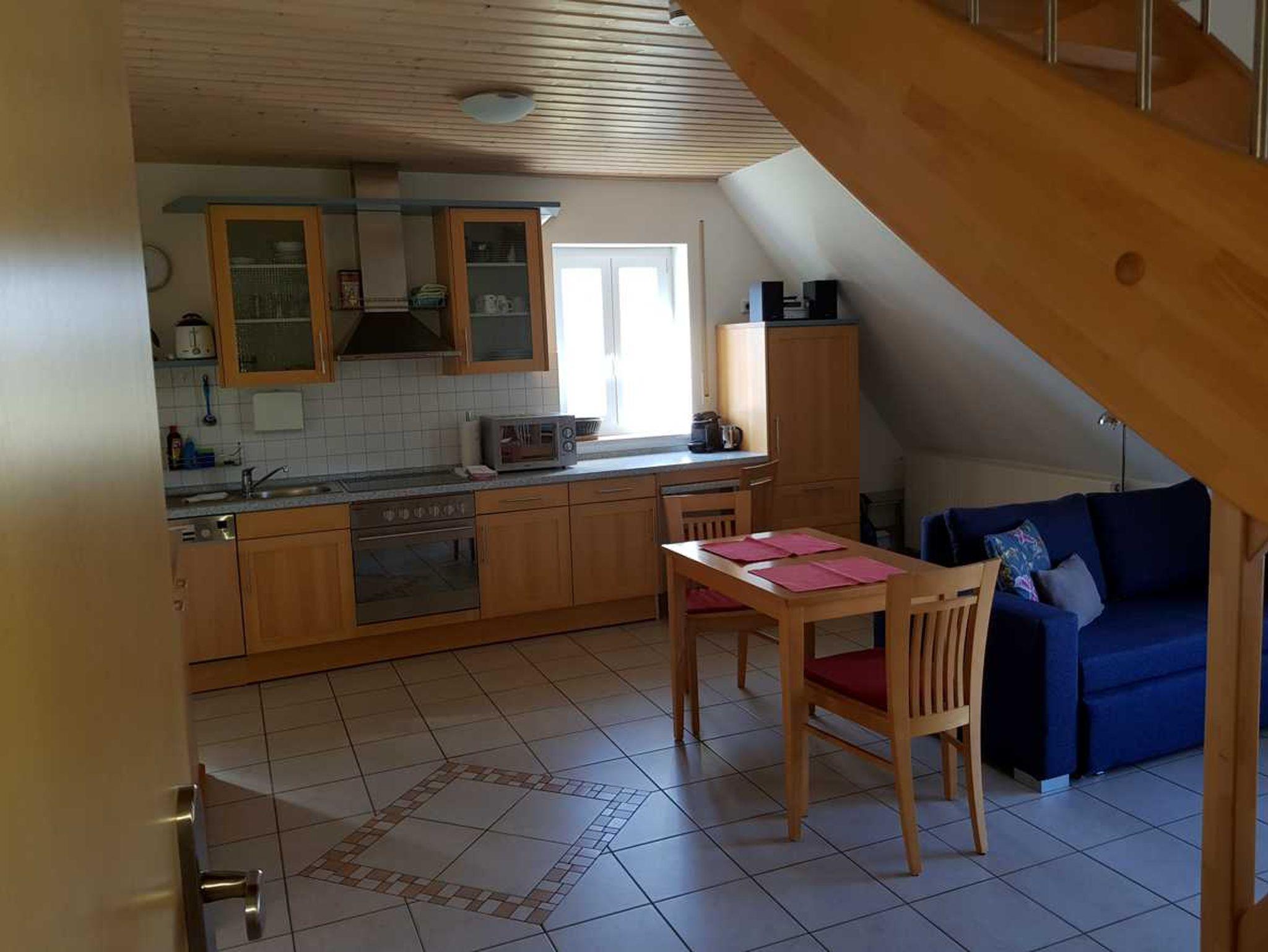 Die Wohnung Maisonette erhält ihren besonderen Charme durch die Gestaltung als Galeriewohnung, wobei das Schlafzimmer im gemütlich ausgebauten Dach liegt. Dort wurden auch ein Kleiderschrank, eine große Kommode mit Regalböden sowie vollwertige Nachtkonsolen integriert, um Ihnen großzügigen Stauraum zu bieten. Das ausziehbare Sofa im großen Wohnraum kann bei Bedarf zu einem komfortablen Bett für 1 Person umgebaut werden. Auch hier steht eine Kommode zur Verfügung. An dem gemütlichen Esstisch im Zentrum der Wohnung finden bis zu 4 Personen Platz.