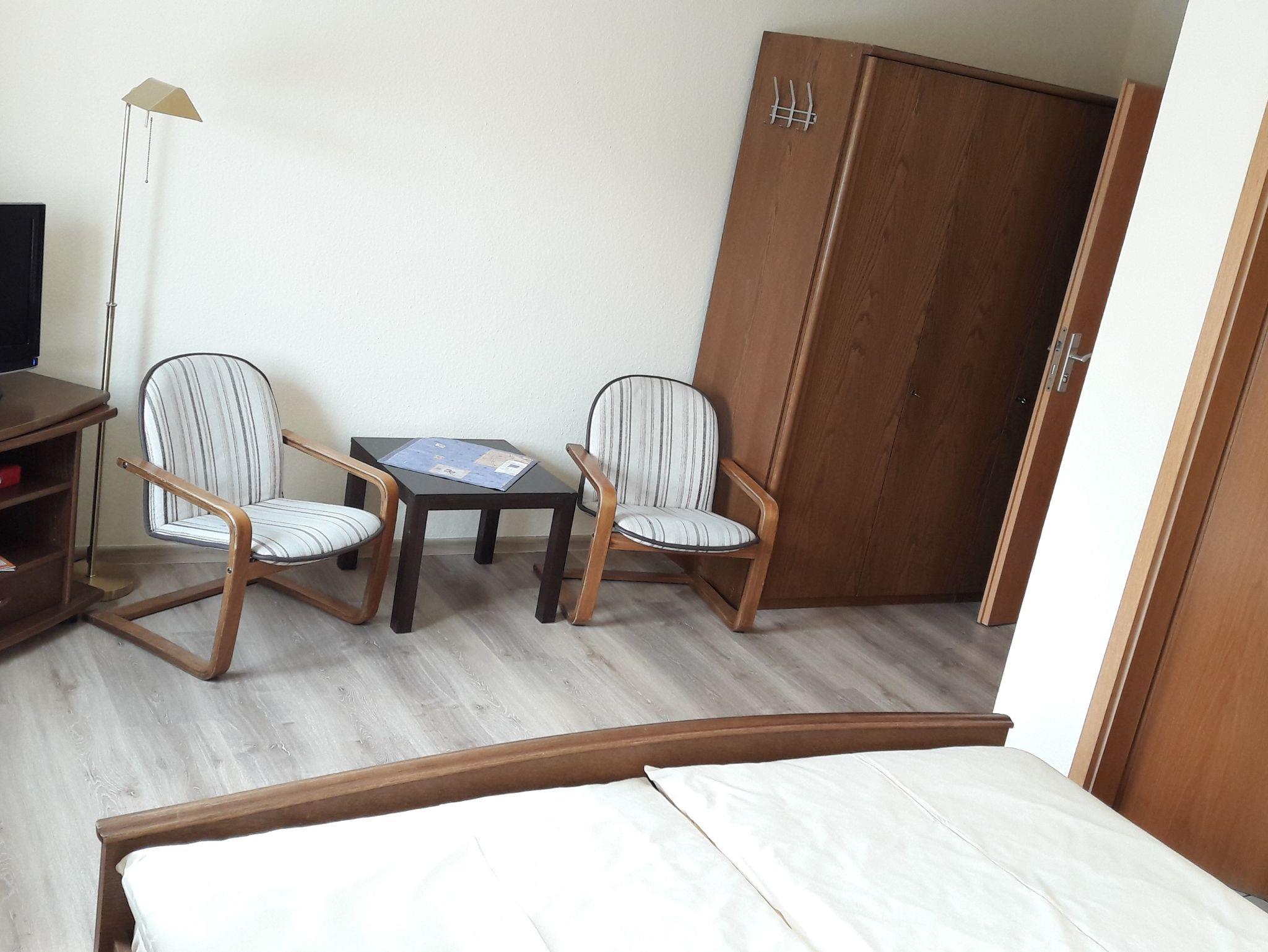 Ausgestattet mit Doppelbett, Sitzgruppe, DU/WC, Fön, TV in I. oder II. Etage.