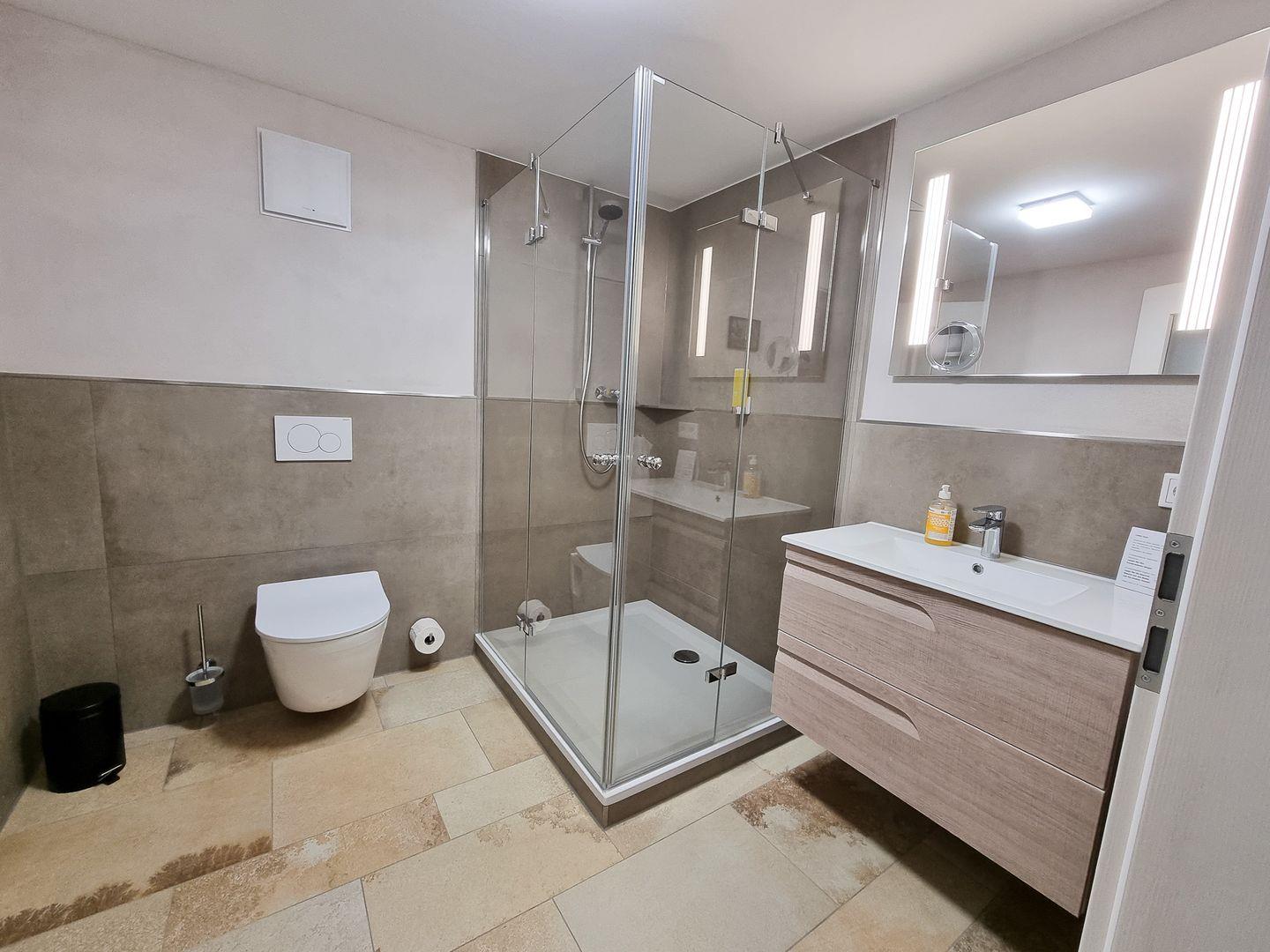 Duschbad im modernen Design mit Badmöbelanlage und Spiegel sowie Kosmetikspiegel, WC, Haartrockner und Handtuchheizkörper