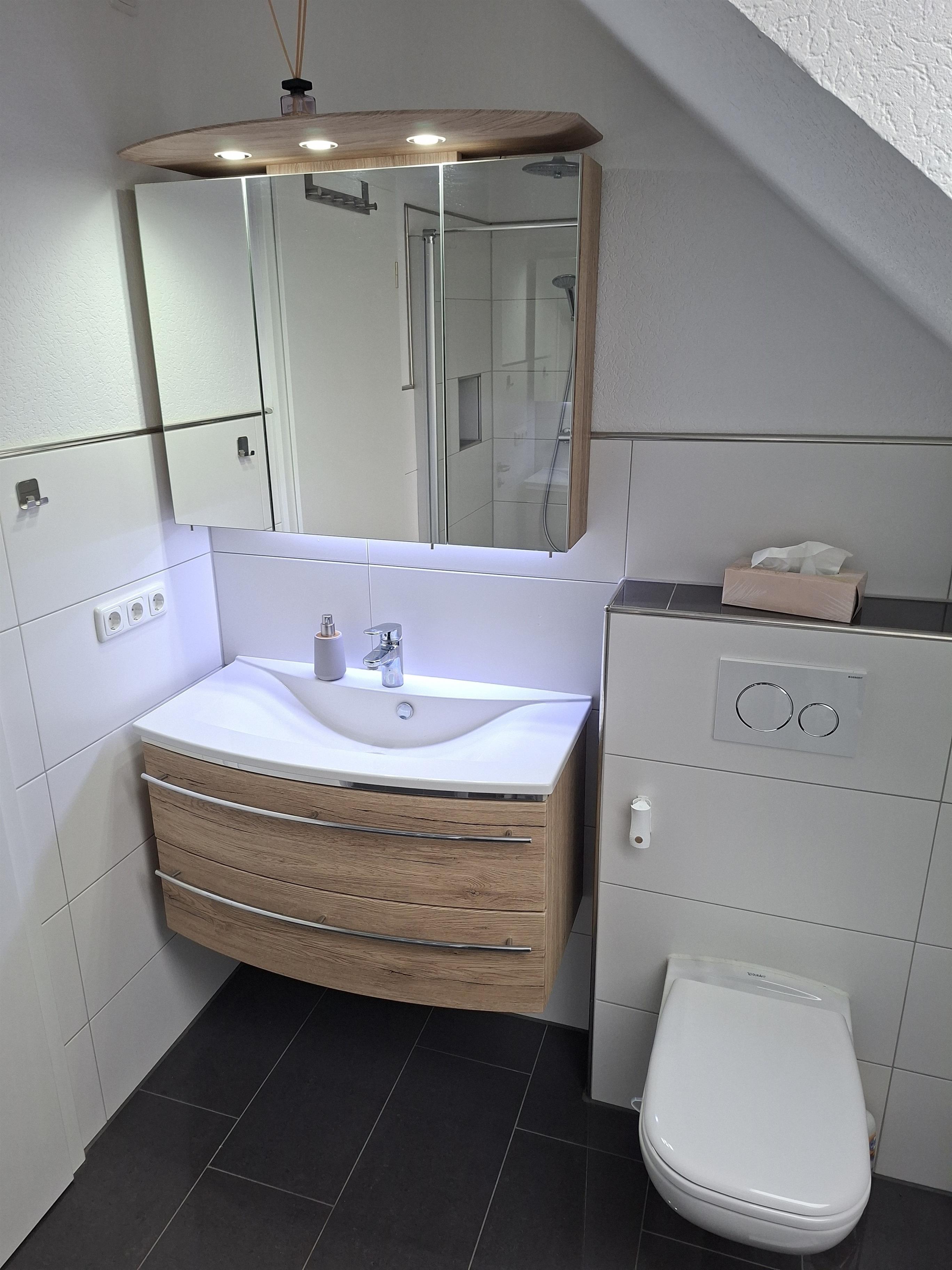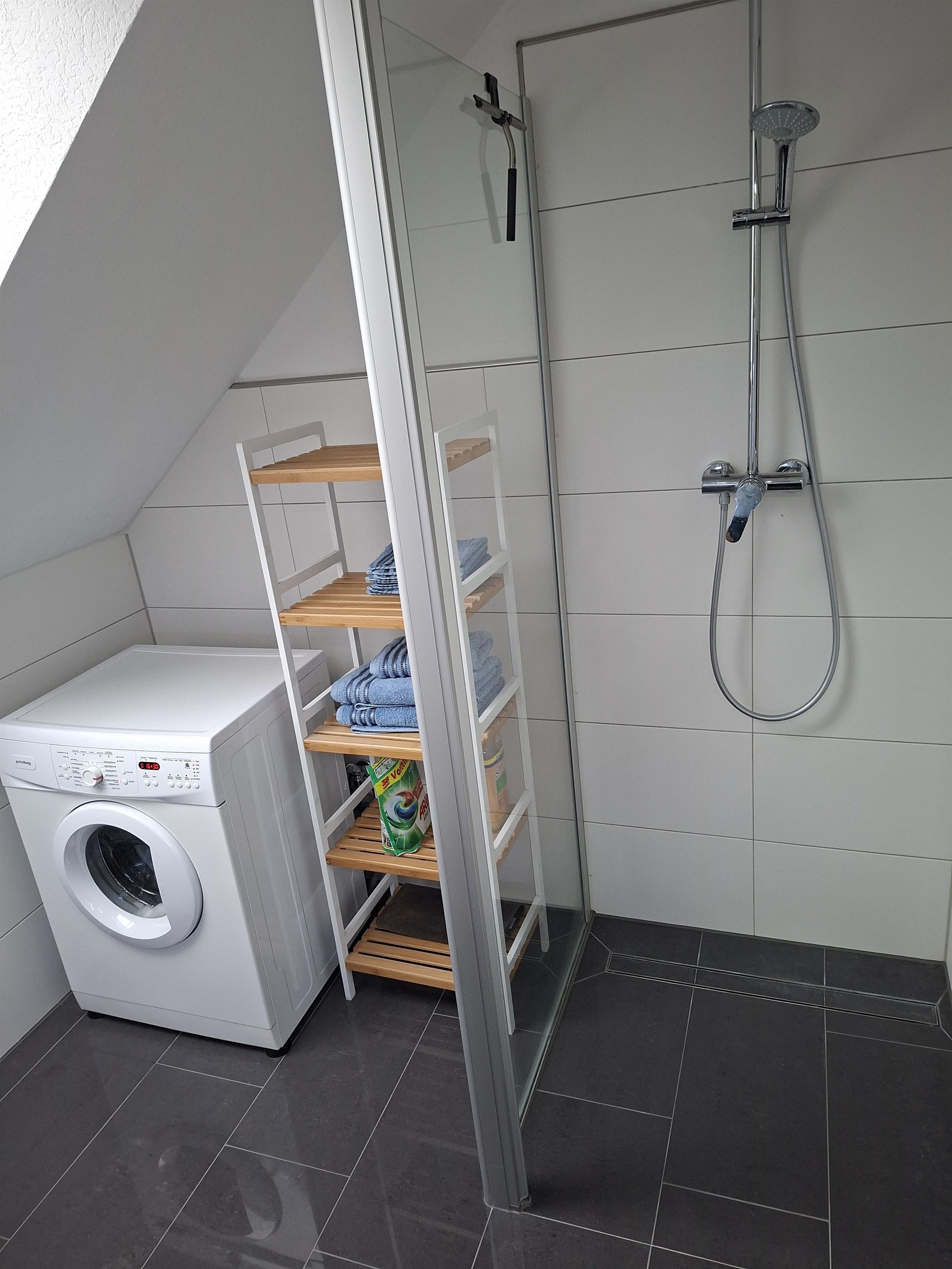 Das moderne Duschbad mit ebenerdiger Dusche bietet angenehmen Komfort und einen entspannten Start in den Tag. Ein geräumiger Flur sorgt zusätzlich für ein angenehmes Raumgefühl und ausreichend Platz für Garderobe und Gepäck.