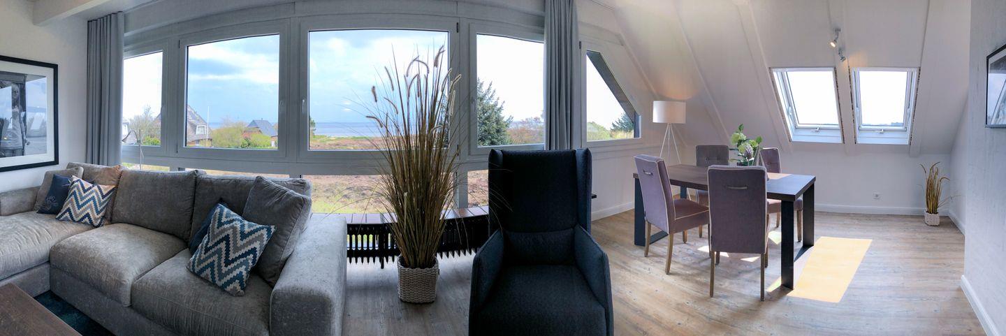 Im offen gestalteten Wohnbereich sorgen moderne Laminatböden, gemütliches Sofa, Sessel, Esstisch und Kommode für eine einladende Atmosphäre. Die großflächigen Fenster bieten einen fantastischen Ausblick auf die Nordsee und lassen viel Tageslicht herein. Besonders hervorzuheben ist der Sichtschutz an allen Fenstern, der Privatsphäre auch bei bester Aussicht gewährleistet.