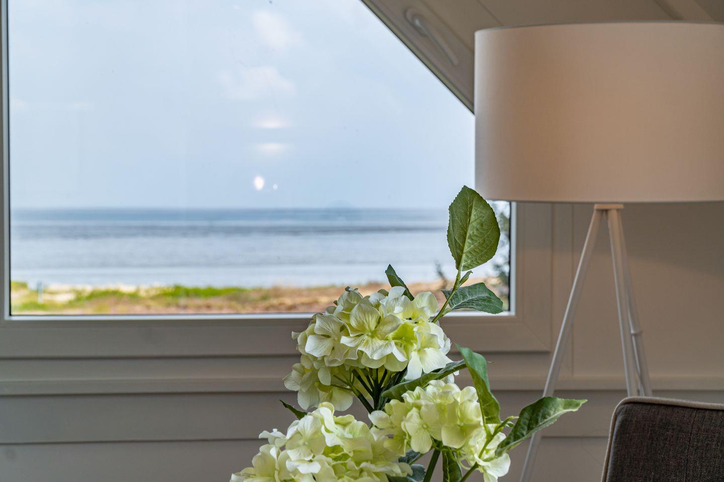 Die verglaste Giebelfront gibt den Traumblick auf Watt und Heide, wie auch aus den anderen Räumen frei. Den Strand erreichen Sie über den angrenzenden Fußweg in ca. 2 Min.