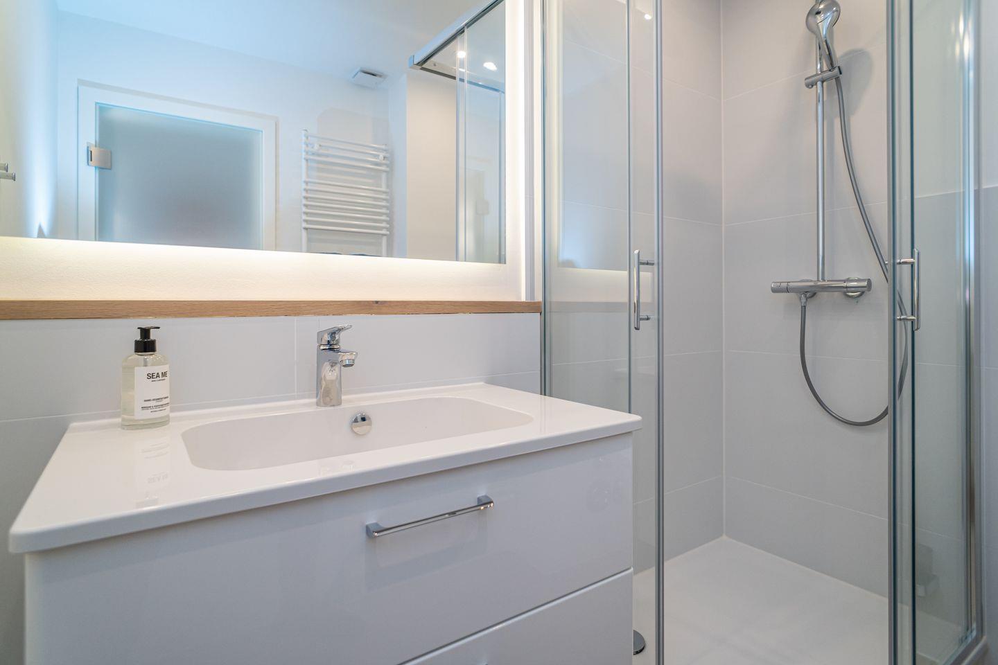 Das Appartement verfügt über zwei separate Schlafzimmer, die erholsame Nächte für Familien oder Paare ermöglichen. Insgesamt stehen vier Schlafmöglichkeiten zur Verfügung. Das Badezimmer ist mit einer bodengleichen Dusche, Waschbecken, WC, Spiegel und Haartrockner modern und funktional gestaltet. Zudem sorgt eine Zentralheizung für angenehme Temperaturen zu jeder Jahreszeit. Eine Waschmaschine und ein Staubsauger sind vorhanden, was längere Aufenthalte besonders komfortabel macht.