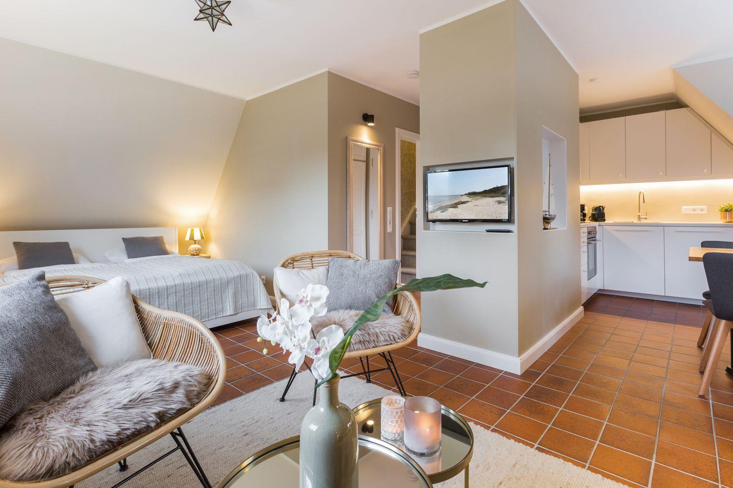 Die Sönshörn Suite in Munkmarsch bietet auf zwei Etagen und 50 m² modernen Komfort nah am Sandstrand (300 m entfernt). Zur Ausstattung gehören ein offener Wohn-Küchenbereich mit Nespresso-Maschine, WLAN, zwei TVs, Geschirrspüler, Terrasse mit Gartenmöbeln, Privatparkplatz und ein Strandkorb. Kinder und Haustiere sind willkommen.
