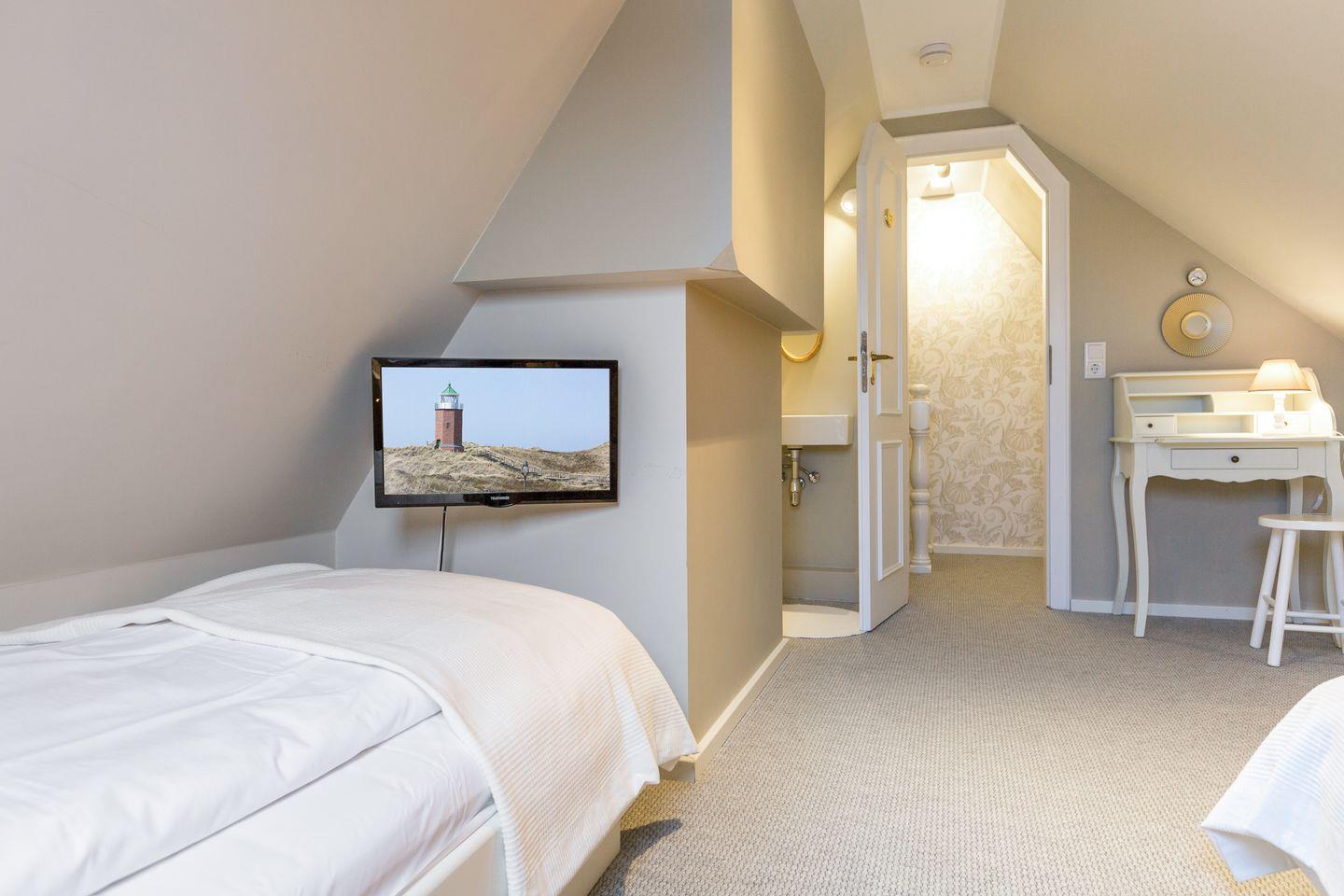 Die Feriewnohnung Sönshörn Suite liegt im Süden von Munkmarsch in einer ruhigen Sackgasse, nur 300 m vom Naturwelterbe Wattenmeer entfernt. Die Ferienwohnung befindet sich im 1OG. und erstreckt sich über zwei Etagen. Im 1 OG. befindet sich der Wohn- und Schlafbereich, wo Ihnen ein Doppelbett und ein gemütliches Sofa zur Verfügung stehen. Die offene Küche mit angrenzenden Esstisch ist ausgestattet mit einem Geschirrspüler, Backofen, Toaster und einer Kaffeemaschine. Auf der selben Ebene befindet sich das Badezimmer mit Regendusche und WC. Über eine schmale Treppe gelangen Sie ins Dachgeschoss der Wohnung wo sich das separate Schlafzimmer mit zwei Einzelbetten befindet. Zur Ferienwohnung gehört im Gemeinschaftsgarten eine private, kleine Terrasse, saisonal mit Sylter Strandkorb und Gartenmöbeln. Im Garten befindet sich eine ebenfalls eine Gartenhütte zur gemeinschaftlichen Nutzung um Fahrräder unterzustellen. Auf Rücksicht auf die nachfolgenden Gäste ist das Rauchen in dieser Ferienwohnung nicht gestattet. Hunde sind auf Anfrage gestattet (10,- € pro Tier/Tag).