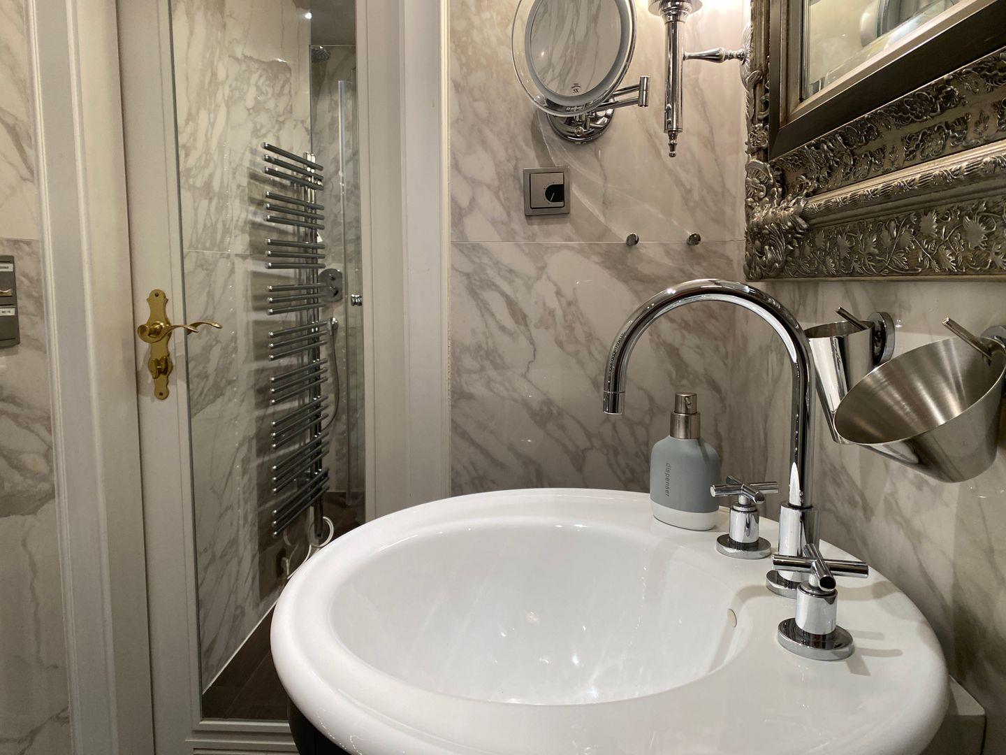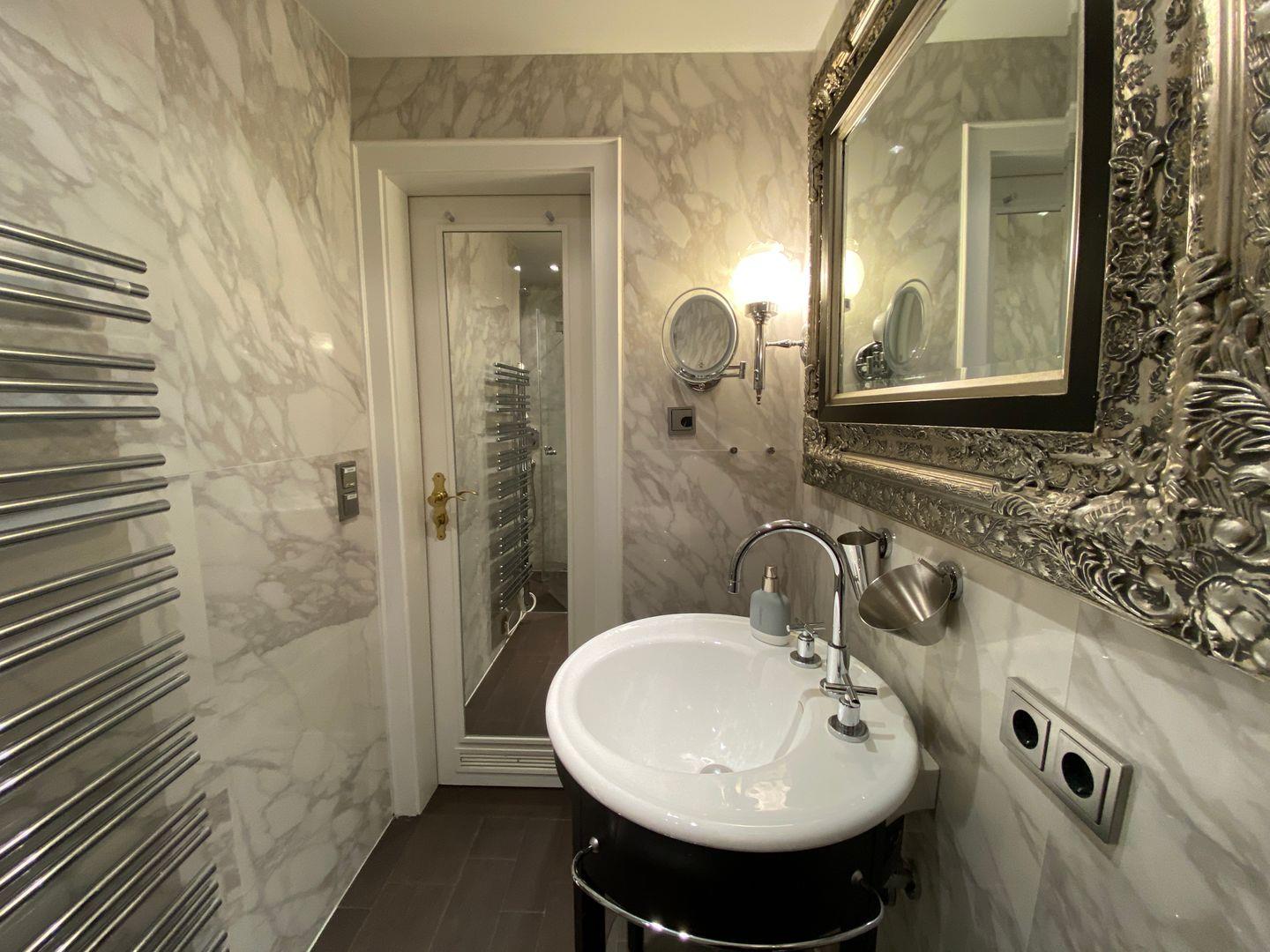 innenliegende, hochwertig ausgestattete Badezimmer verfügt über eine ebenerdige