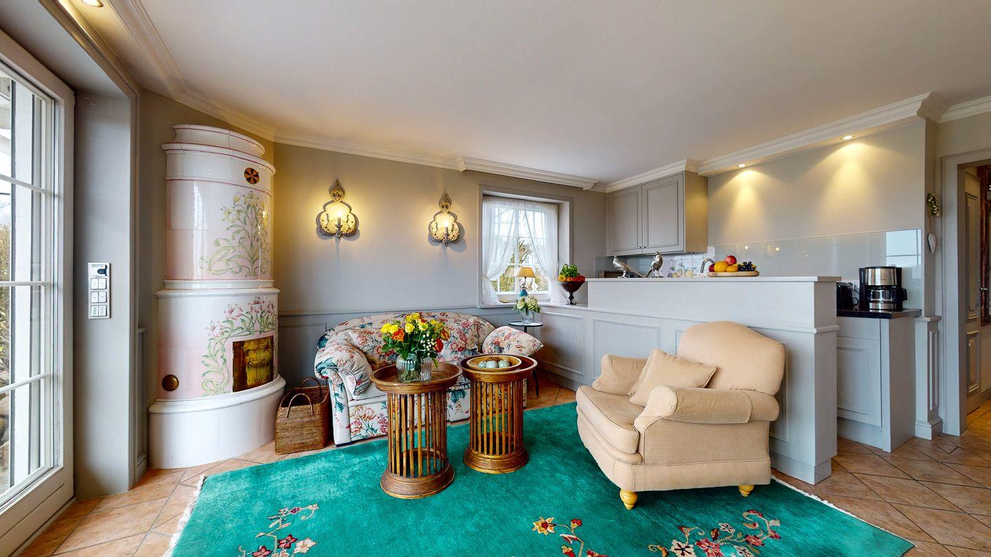 Der gemütliche, offene Wohnbereich ist mit einer komfortablen Sofaecke,