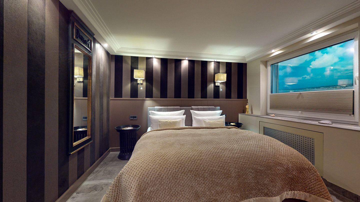 Schlafzimmer mit Doppelbett, Kleiderschrank, TV und lichtbringenden