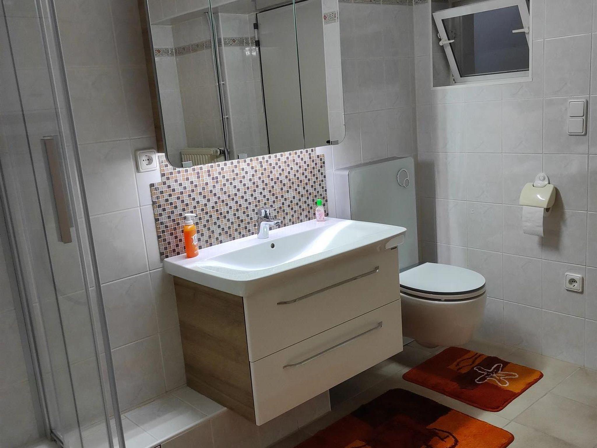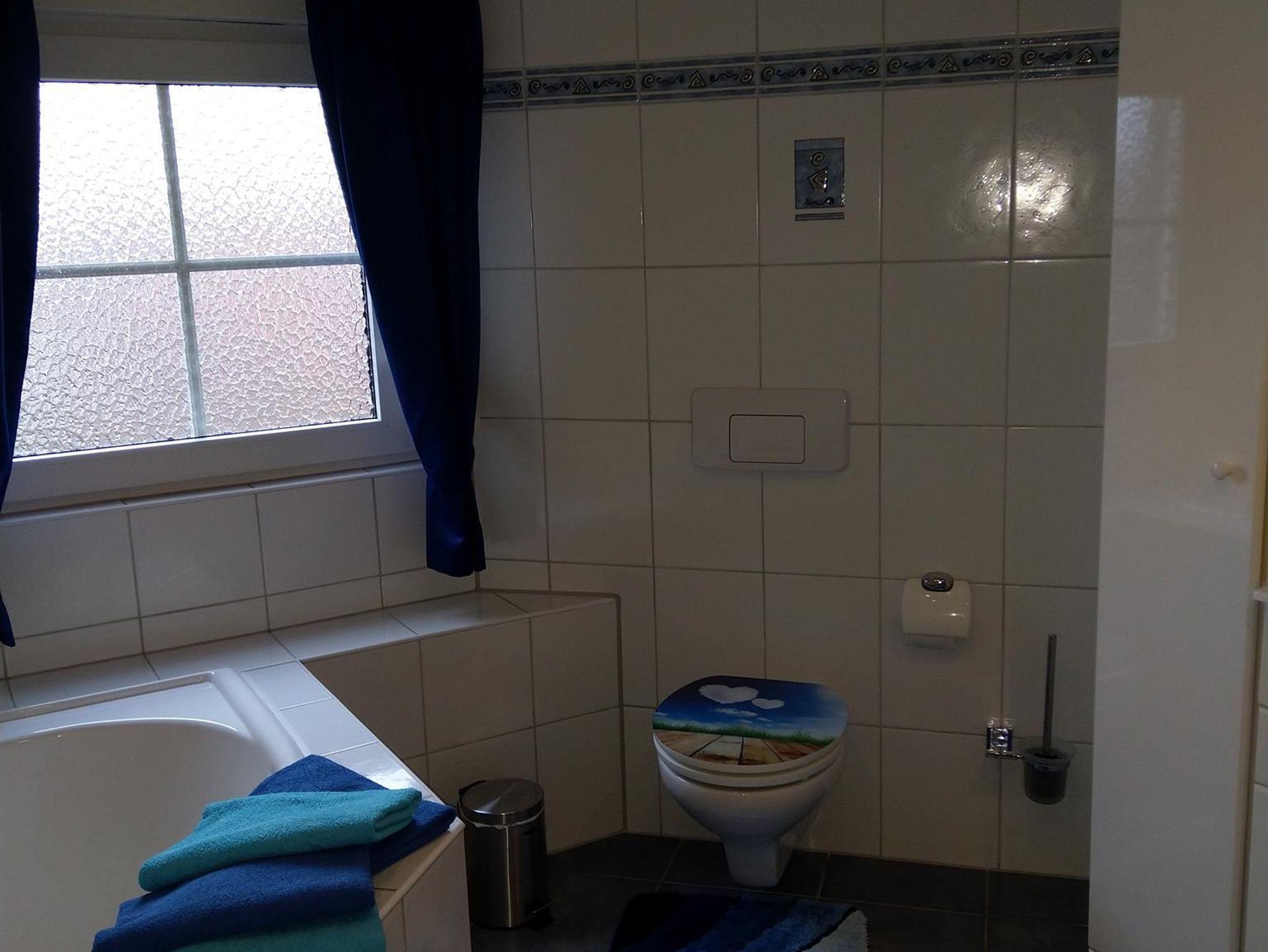 Das Bad ist mit Badewanne, Dusche, WC und 2 Waschbecken ausgestattet.