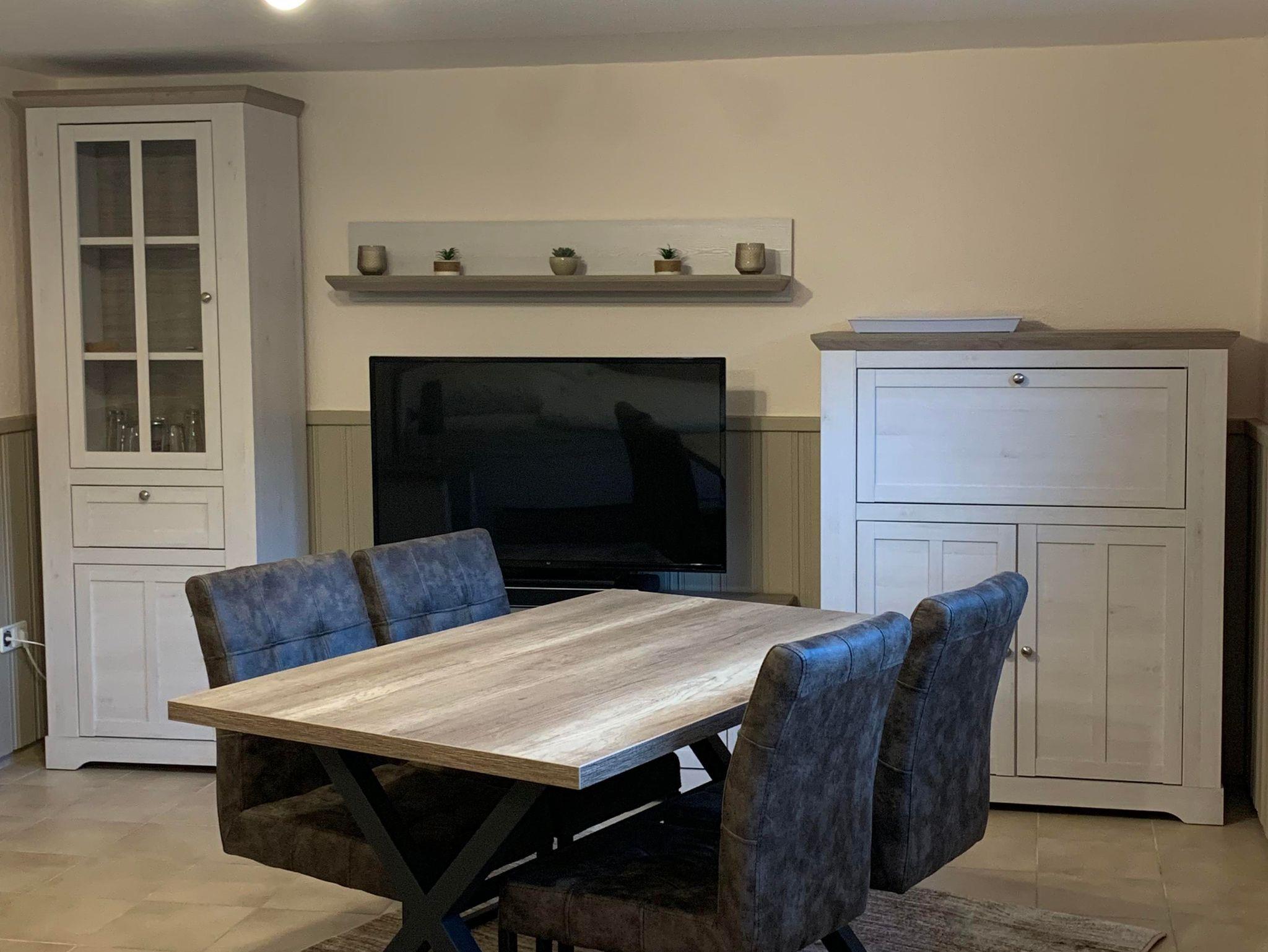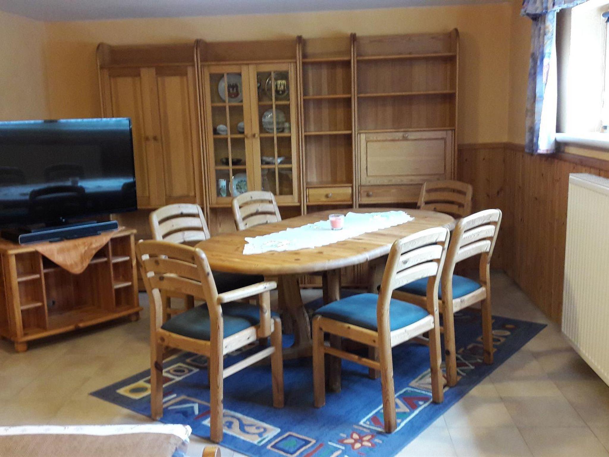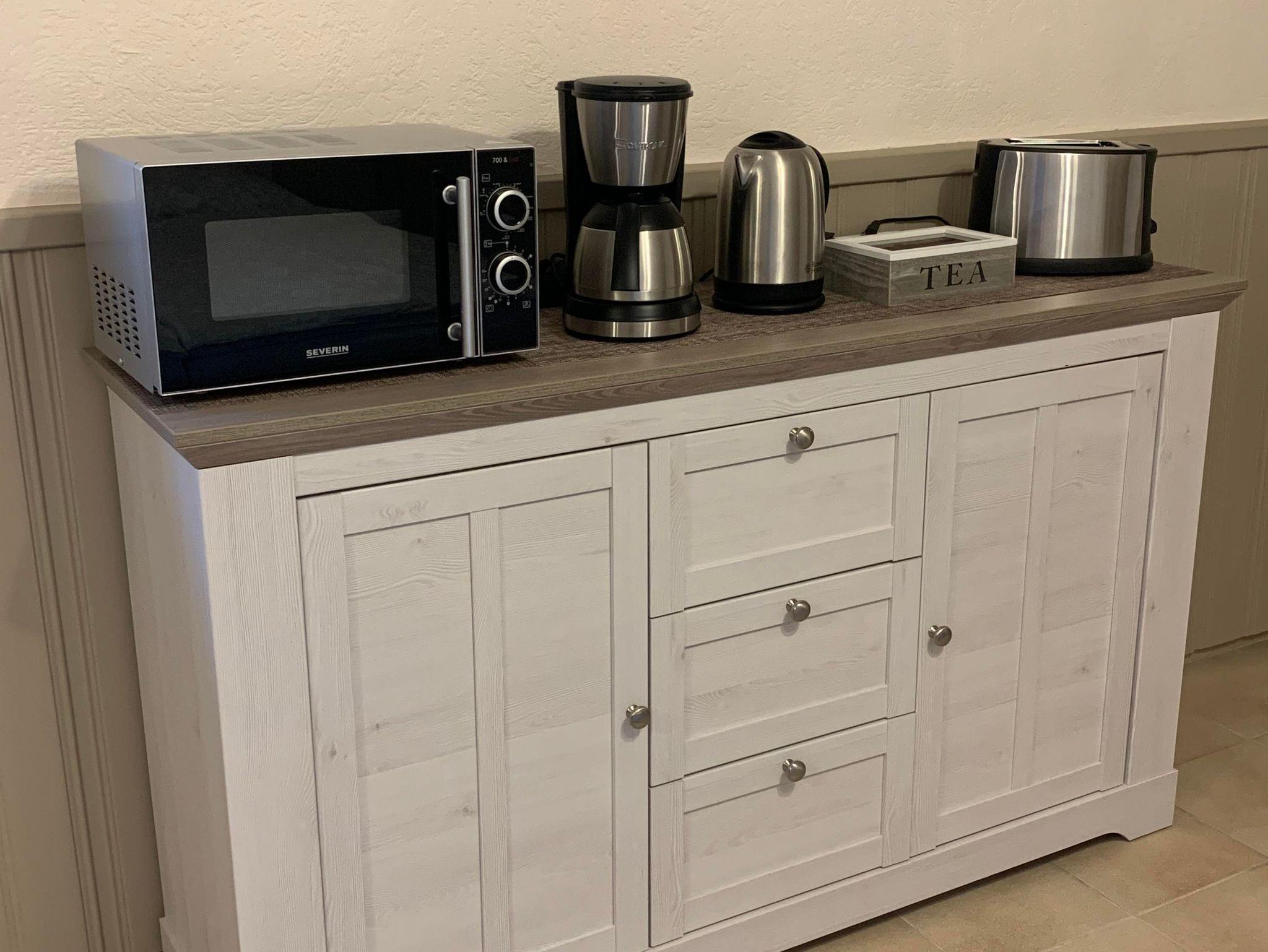 Der Aufenthaltsraum mit Esstisch, 4 Stühlen, TV, Kühlschrank, Kaffeemaschine, Wasserkocher, Mikrowelle u. Toaster befindet sich nebenan.