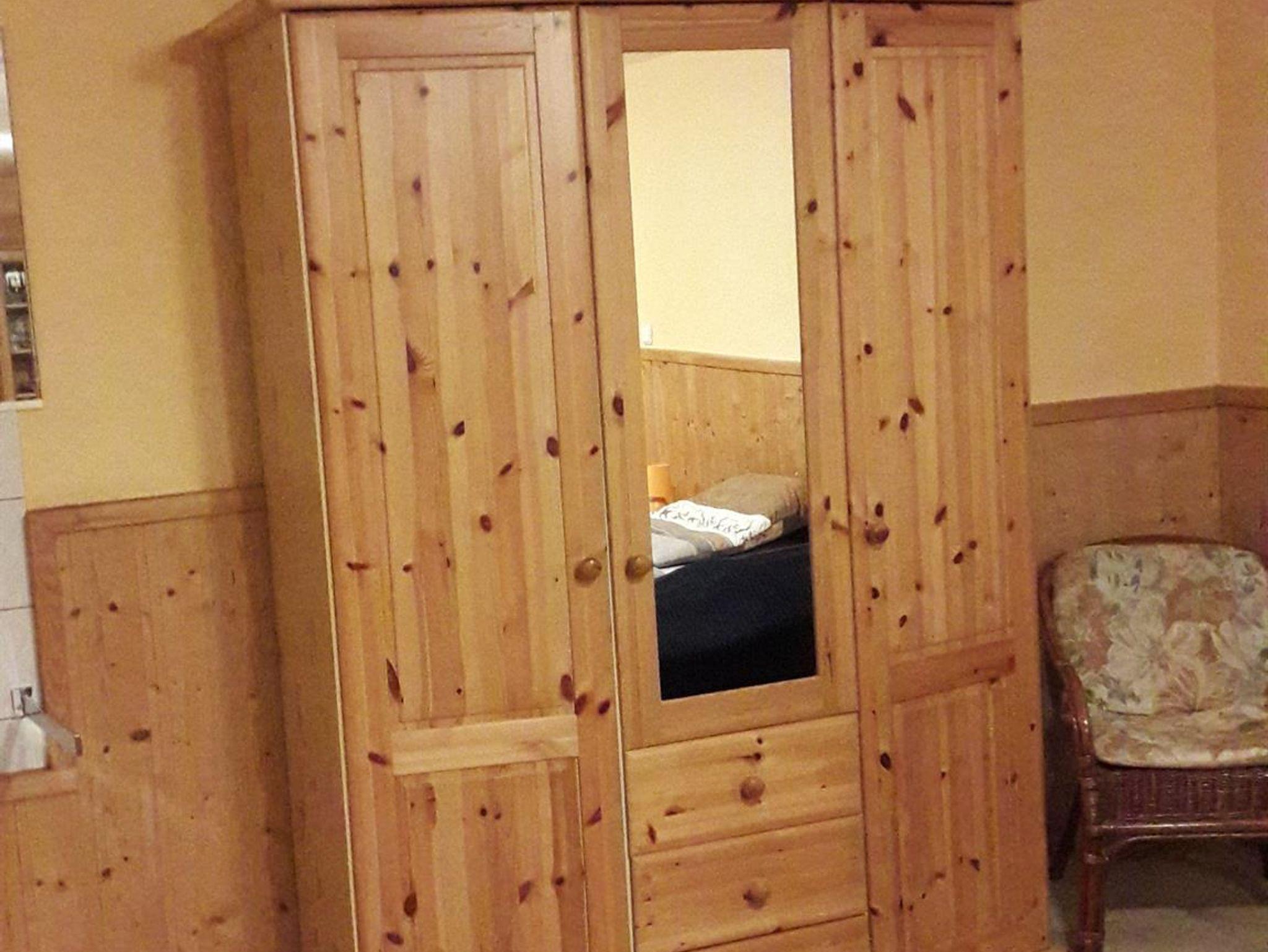 Das Zimmer ist mit einem Doppelbett, Nachttischen, Kleiderschrank, Waschbecken, Esstisch, 4 Stühlen, Geschirr, TV, Mikrowelle, Toaster, Kaffeemaschine u. Wasserkocher ausgestattet, Kühlschrank auf dem Flur.