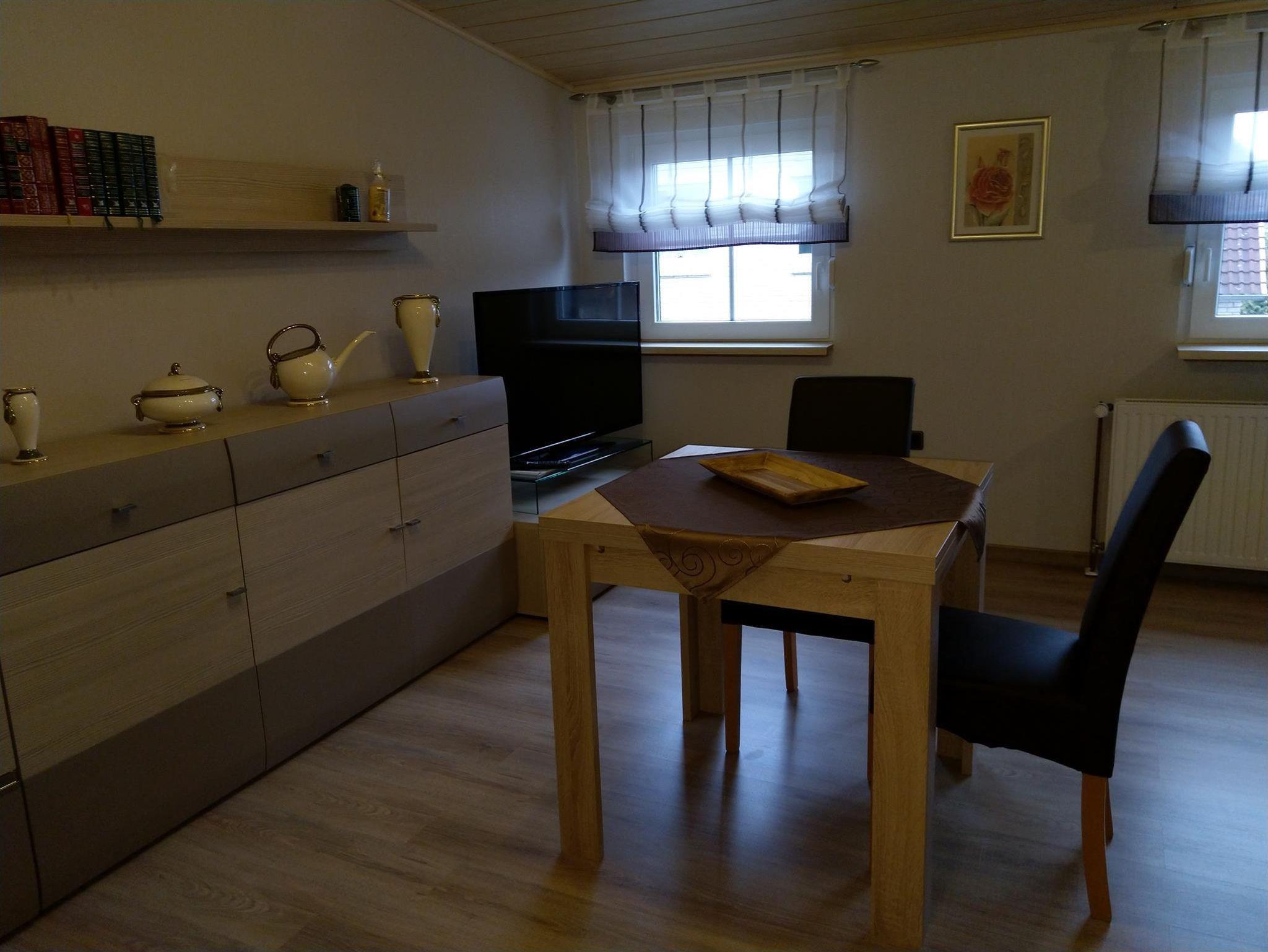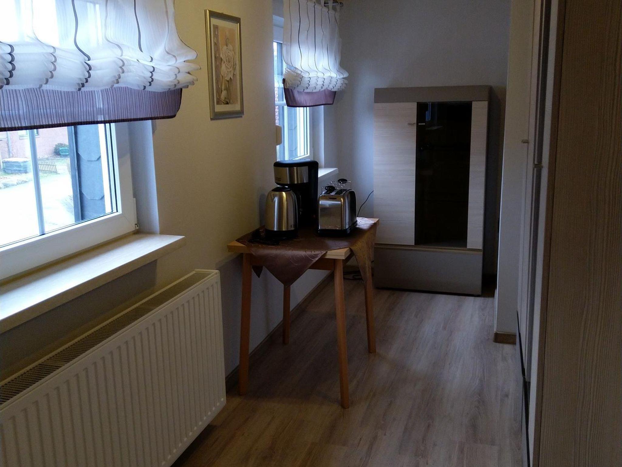 Der Aufenthaltsraum mit Esstisch, 4 Stühlen, TV, Kühlschrank, Kaffeemaschine, Wasserkocher, Mikrowelle u. Toaster befindet sich nebenan.