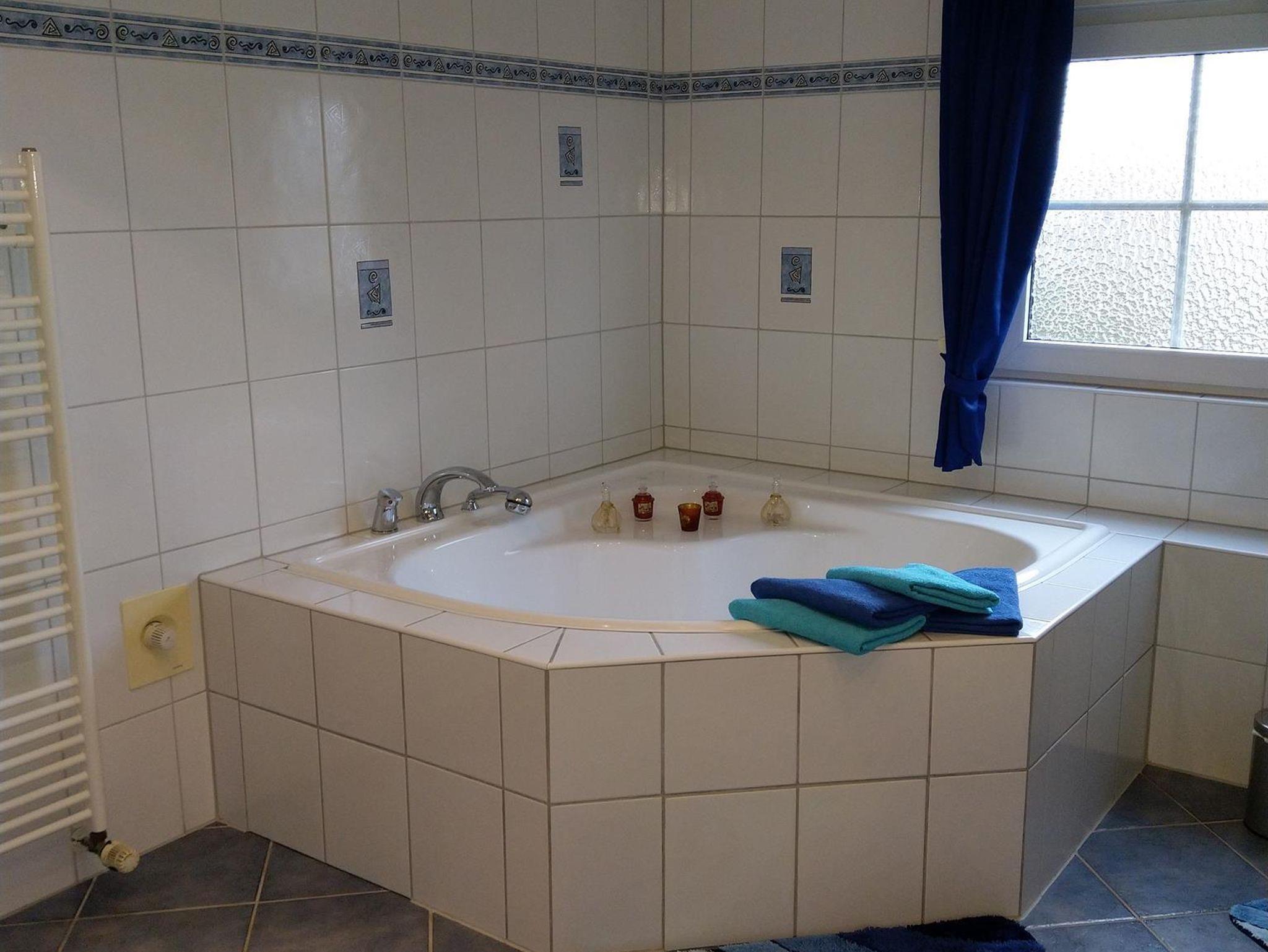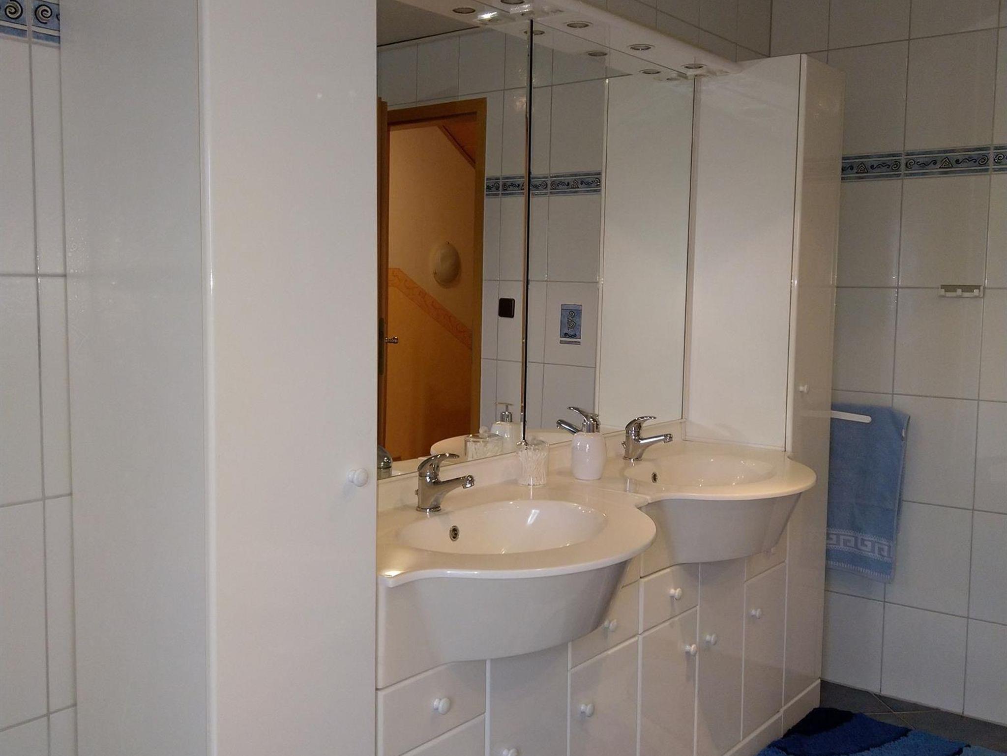 Das Bad ist mit Badewanne, Dusche, WC und 2 Waschbecken ausgestattet.