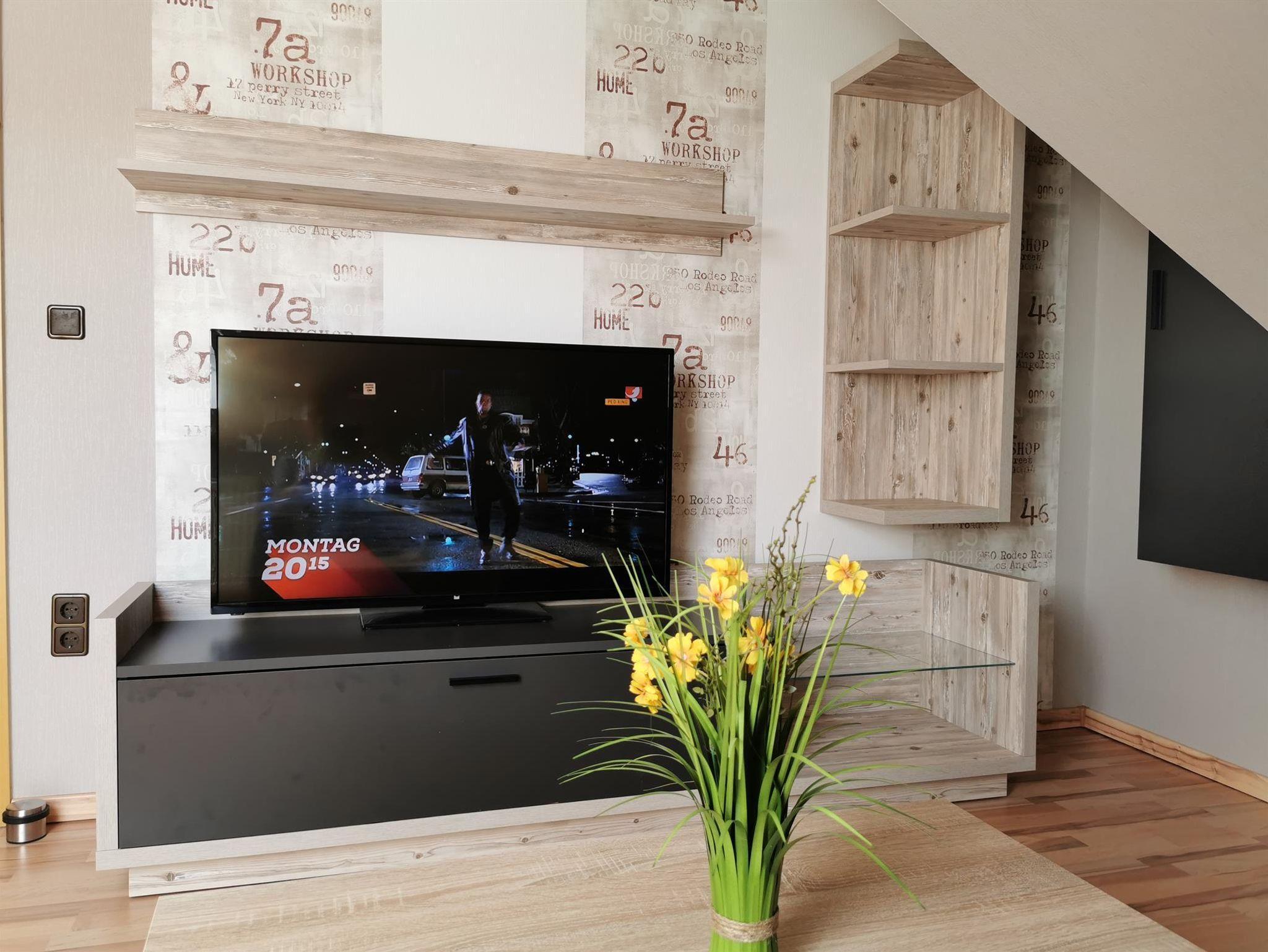 Das Hauptzimmer ist mit Kleiderschrank, Doppelbett, 2 Nachtschränken, TV u. Couch mit Tisch ausgestattet.