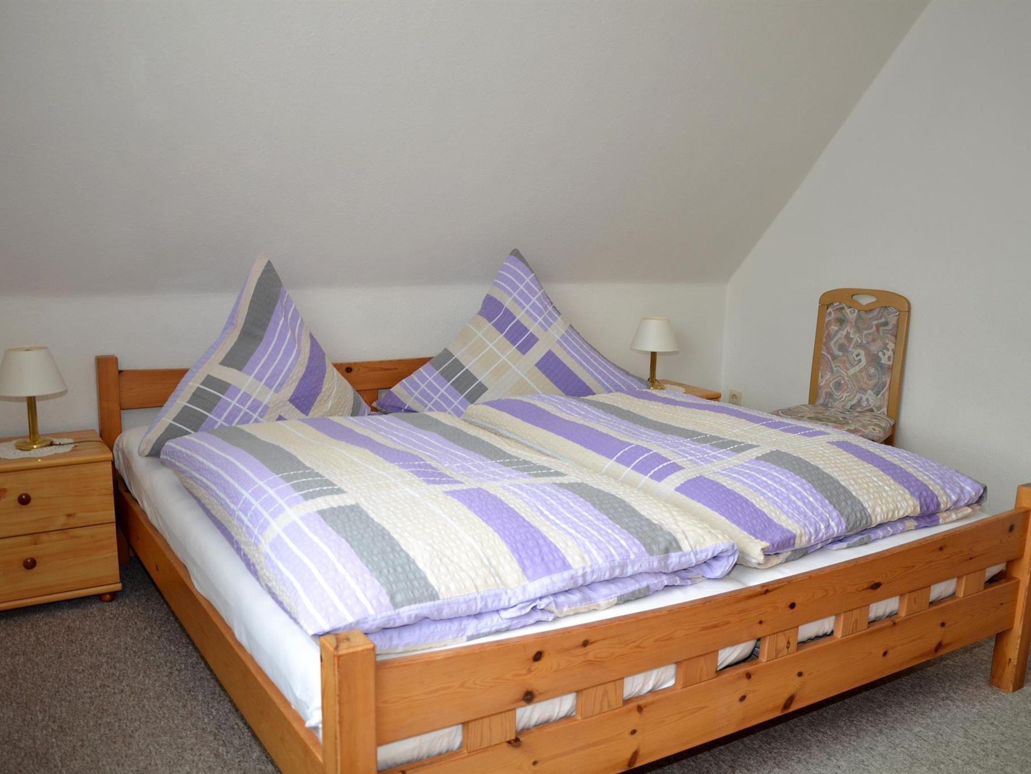 Gemütlich eingerichtete Ferienwohnung in der oberen Etage eines Einzelhauses. Wohnzimmer mit Essecke, 2 Schlafräume jeweils mit Doppelbetten, voll eingerichtete Küche, Badezimmer. Zustellbett ist auf Anfrage möglich. Es steht Ihnen W-Lan zur Verfügung. Diese Wohnung ist eine Nichtraucherwohnung.