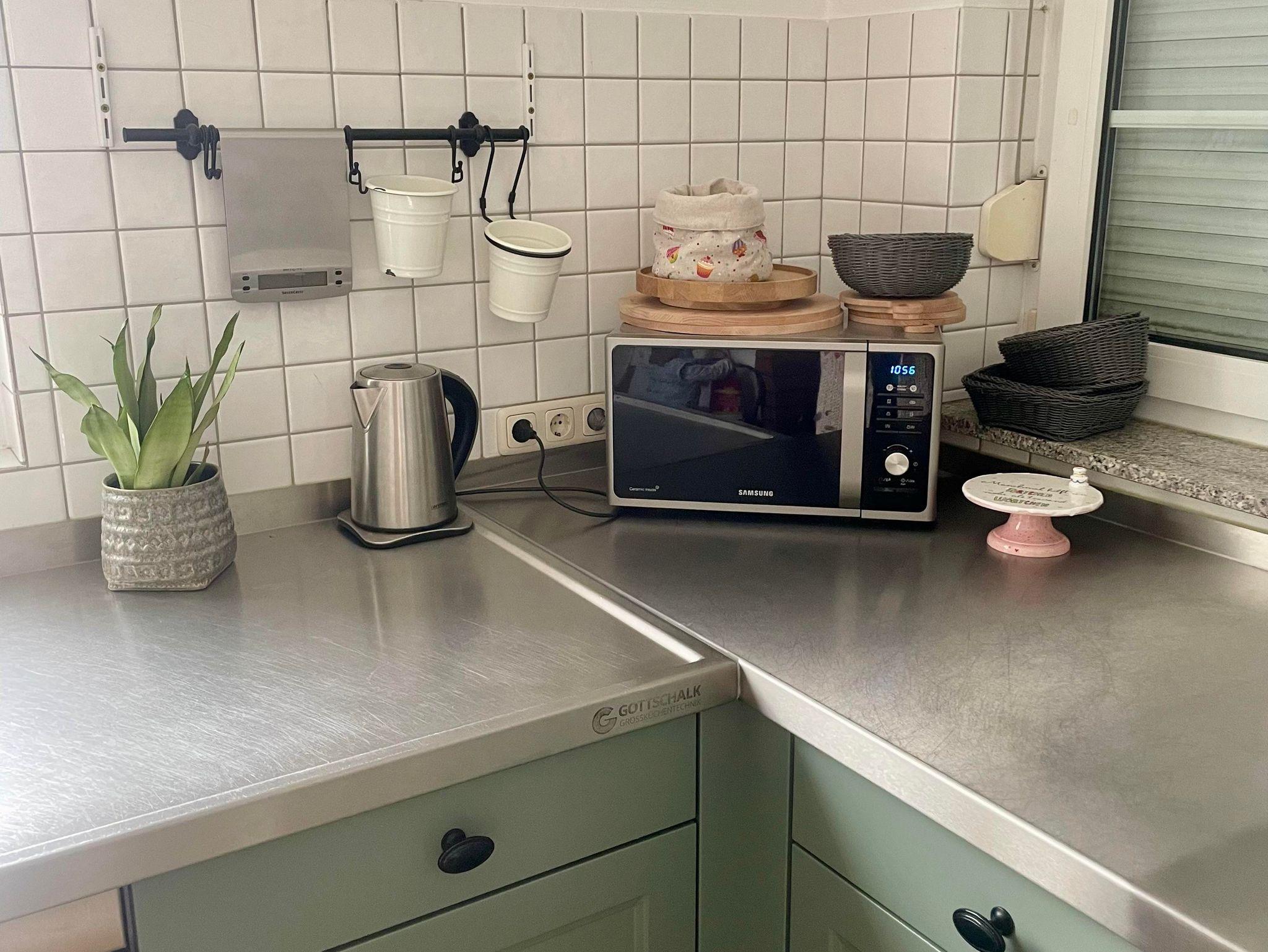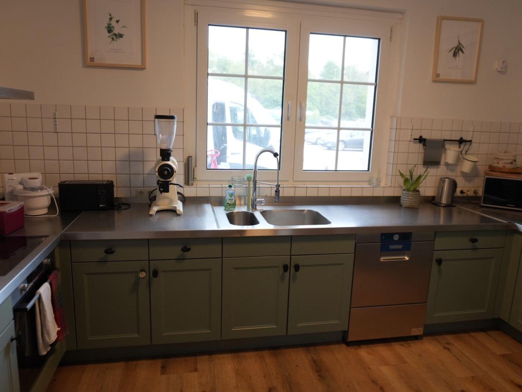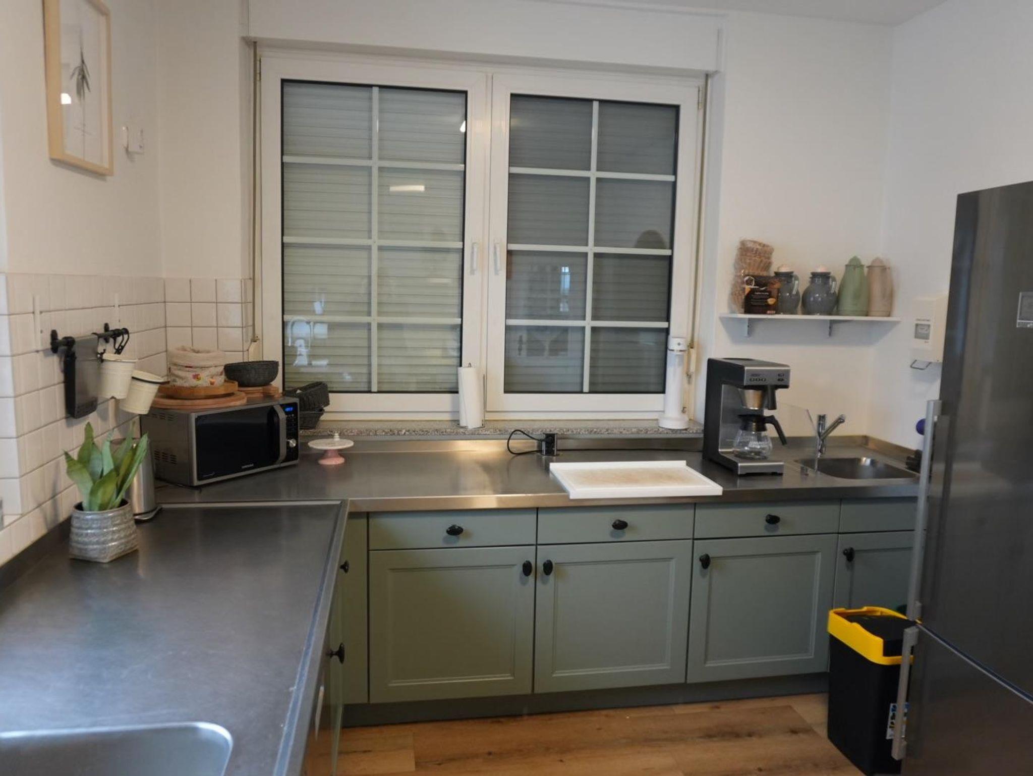 Die großzügige Küche ist mit einem Kaffeevollautomaten, Thermomix, einer Mikrowelle und einem Toaster ausgestattet.
