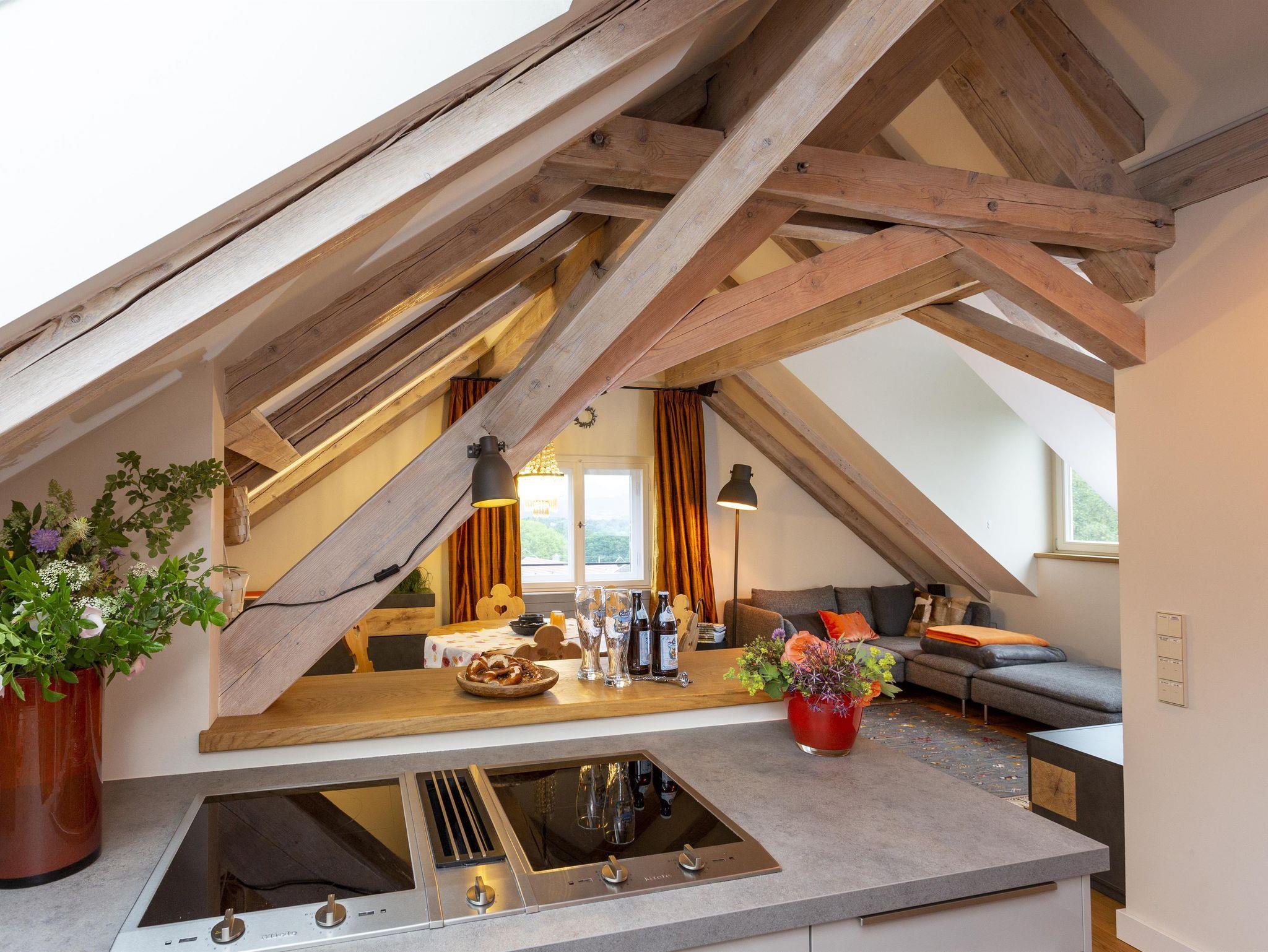 Dann geht es vorbei am Schlafzimmer, das an die komfortable Kajüte eines Segelschiffs erinnert, sowie am angrenzenden zweiten Schlaf- bzw. Arbeitszimmer. Hobbyköche nehmen sicher die offene Küche mit der voll ausgestatteten Einrichtung in Augenschein. Alpine Wanderfreunde werden sich an dem Südtiroler Bauerntisch wie zuhause fühlen. Wer es ganz bequem haben möchte, nimmt auf der Eckcouch Platz und lässt den Blick im Raum schweifen, der wahrscheinlich anerkennend bei einem der „Teufel“-Lautsprecher der Dolby-Digitalanlage hängen bleibt. Mit absoluter Sicherheit aber werden nach kürzester Zeit alle Blicke in die Gauben gehen, um diesen in Murnau einzigartigen Weitblick zu genießen und dann Tag für Tag den weiten Himmel zu erleben.
