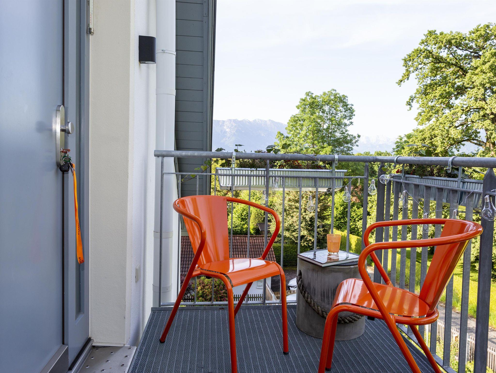 Wir stehen vor einer liebevoll restaurierten Villa und ahnen bereits die Aussicht, die wir aus den großzügigen Gauben der Dachwohnung genießen werden. Mit jeder Treppenstufe öffnet sich der grandiose Blick nach Südwesten bis zur Alpspitze. In wenigen Schritten befinden wir uns auf der begrünten Dachterrasse, die dank wunderbarem Weitblick zum Verweilen einlädt. Doch hier nehmen wir später Platz. Jetzt wollen wir noch höher hinauf. Mit jeder Stufe der Spindeltreppe erweitert sich das Panorama vom Naturschutzgebiet bis zu den Alpen.