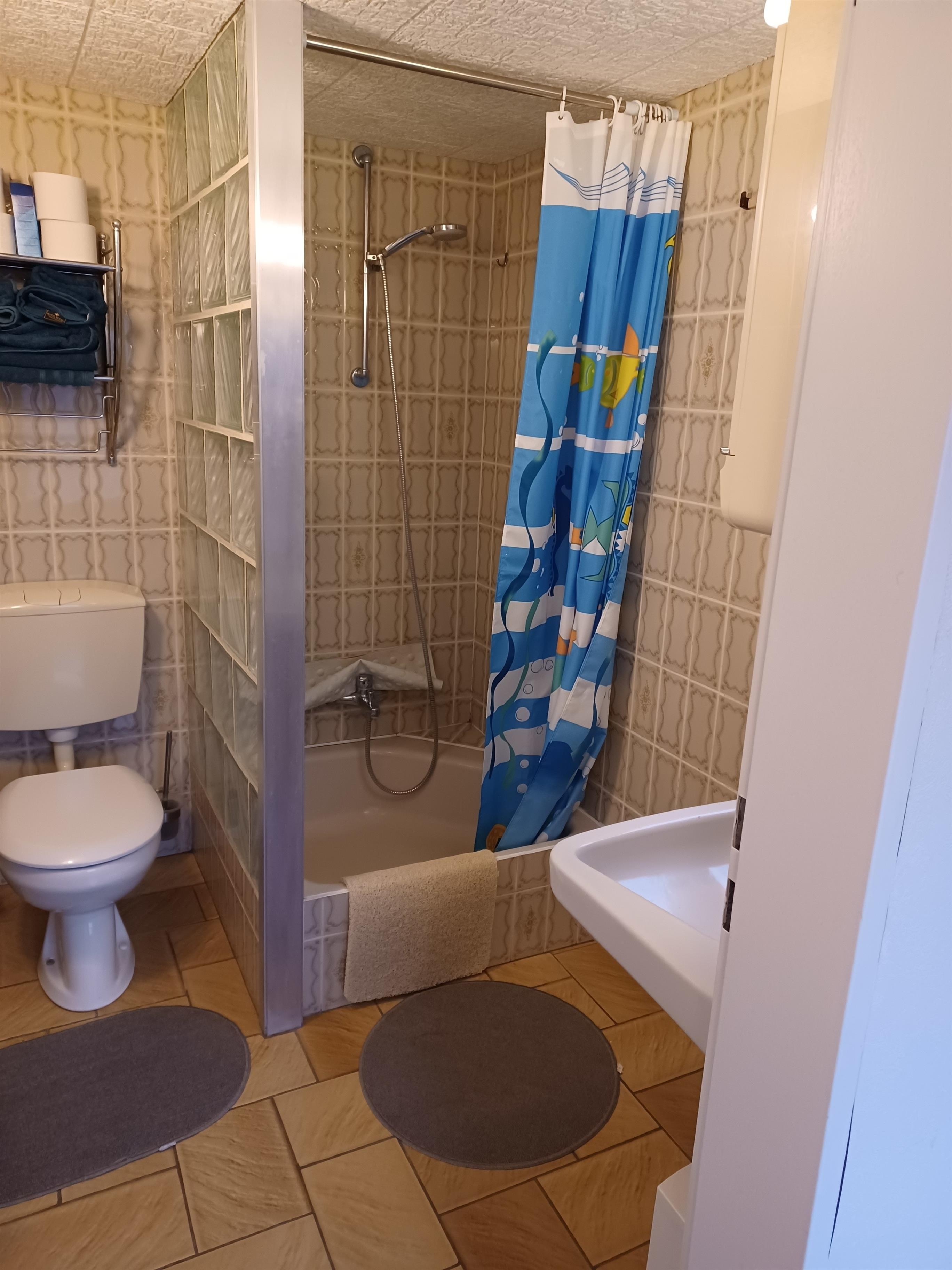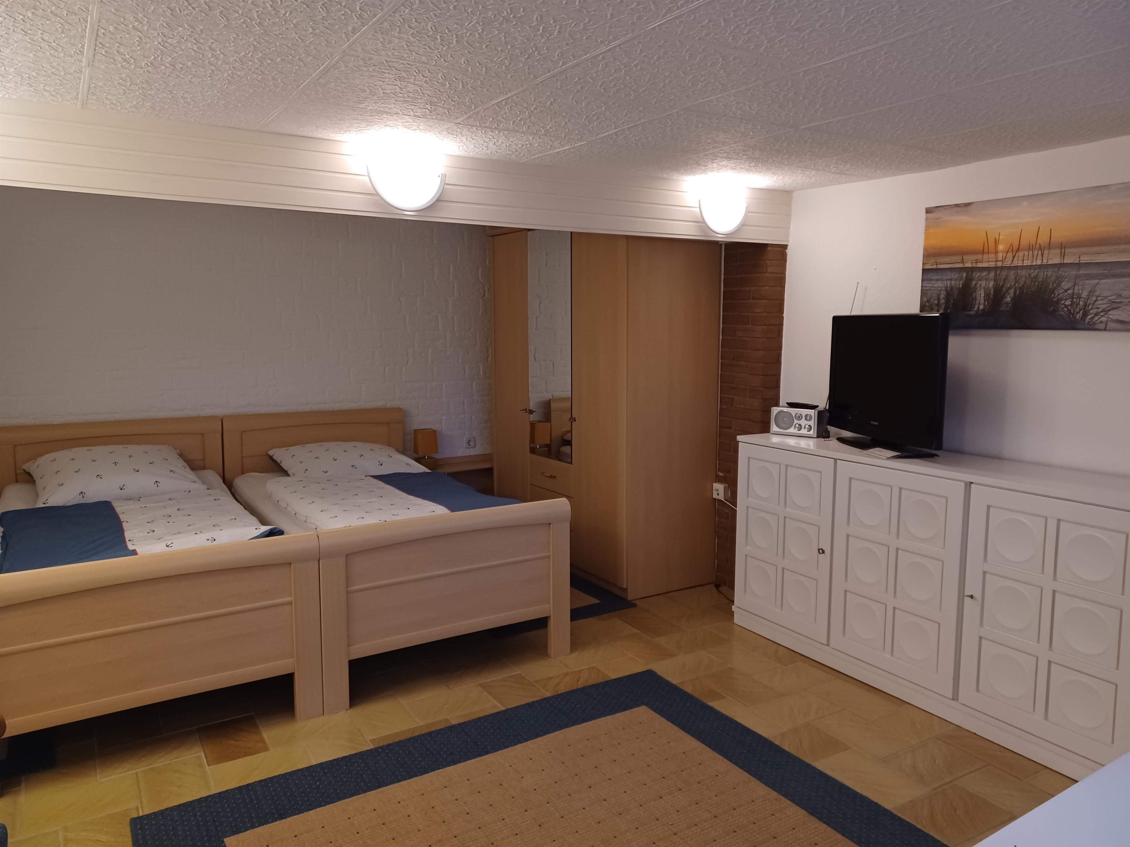 Diese Ferienwohnung liegt in der unteren Etage eines Gästehauses mit eigenem Eingang. Sie verfügt über eine eigene Terrasse mit Sitzgelegenheiten und Grill. Es handelt sich um einen Wohn- Schlafbereich, mit Sitzecke und separatem Esstisch. Es sind zwei Einzelbetten vorhanden, die bei Bedarf auseinander gestellt werden können.