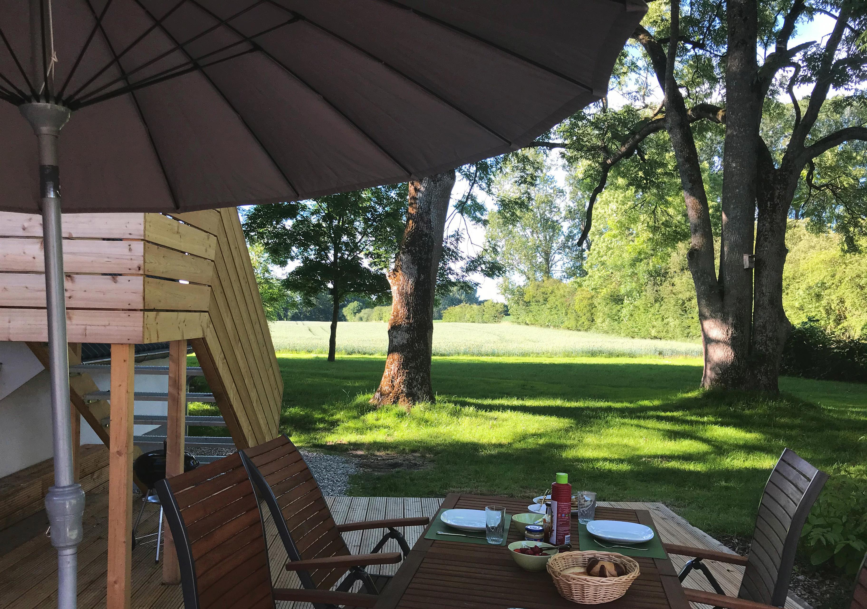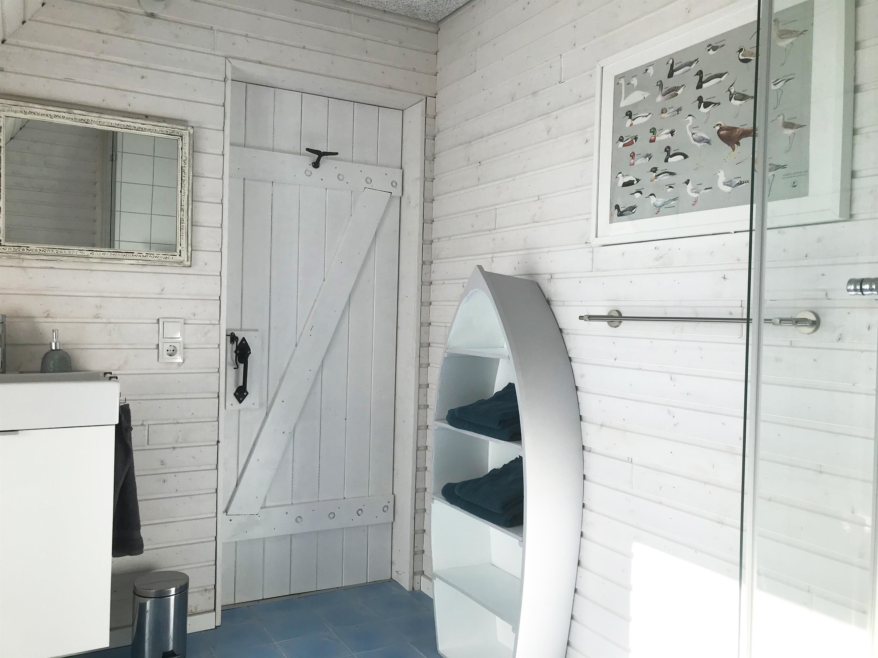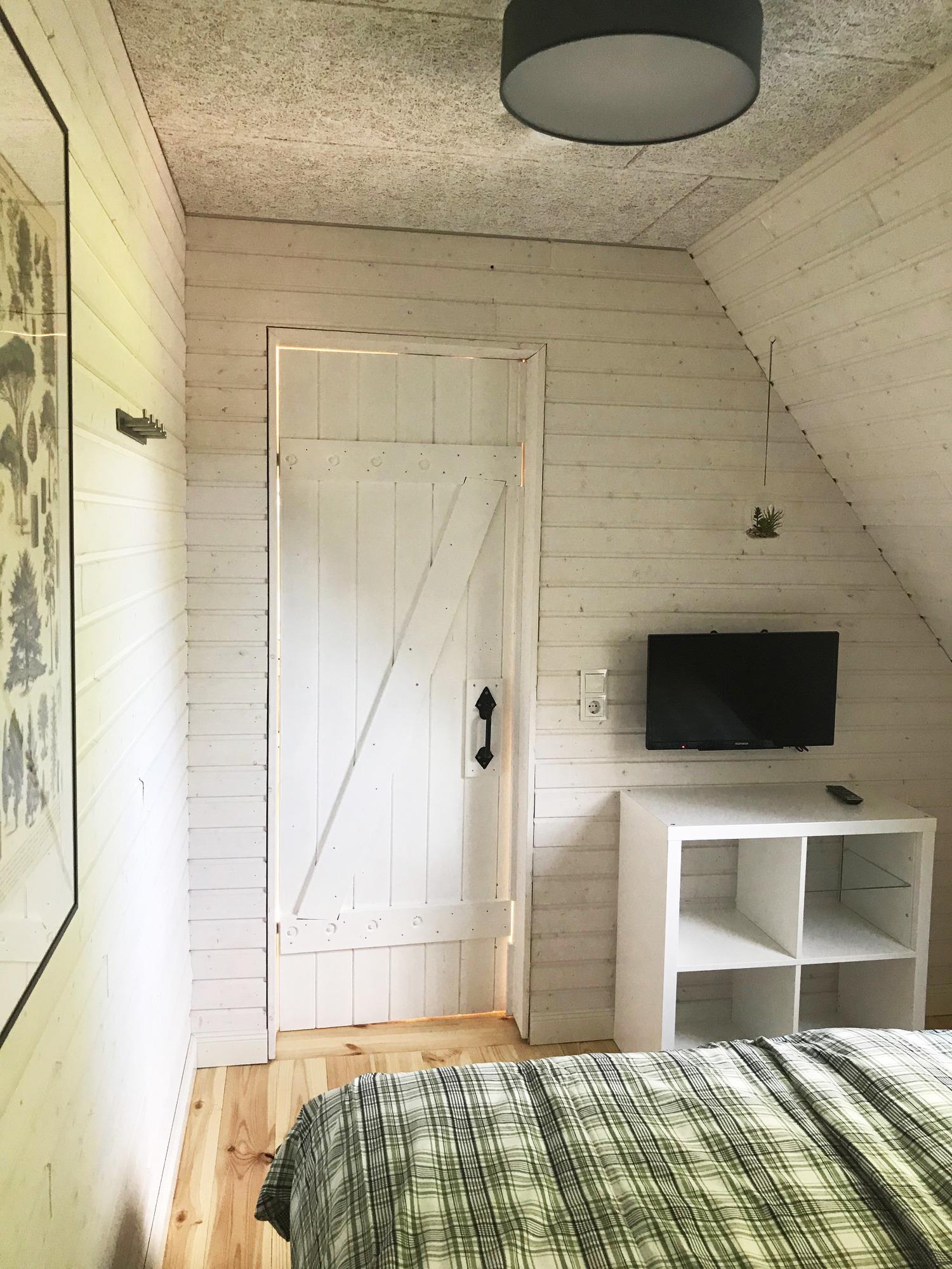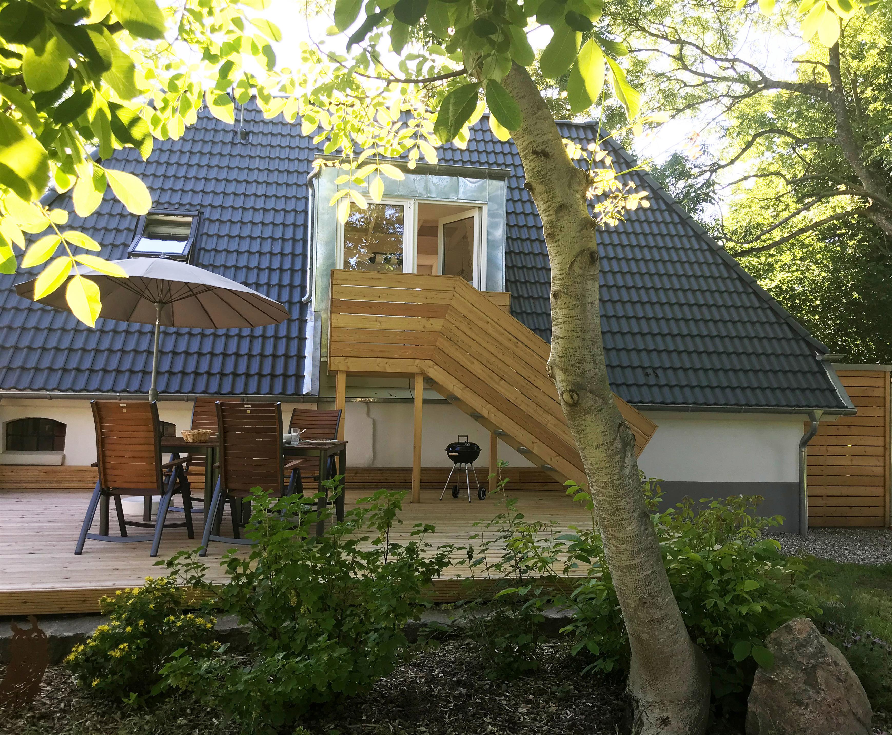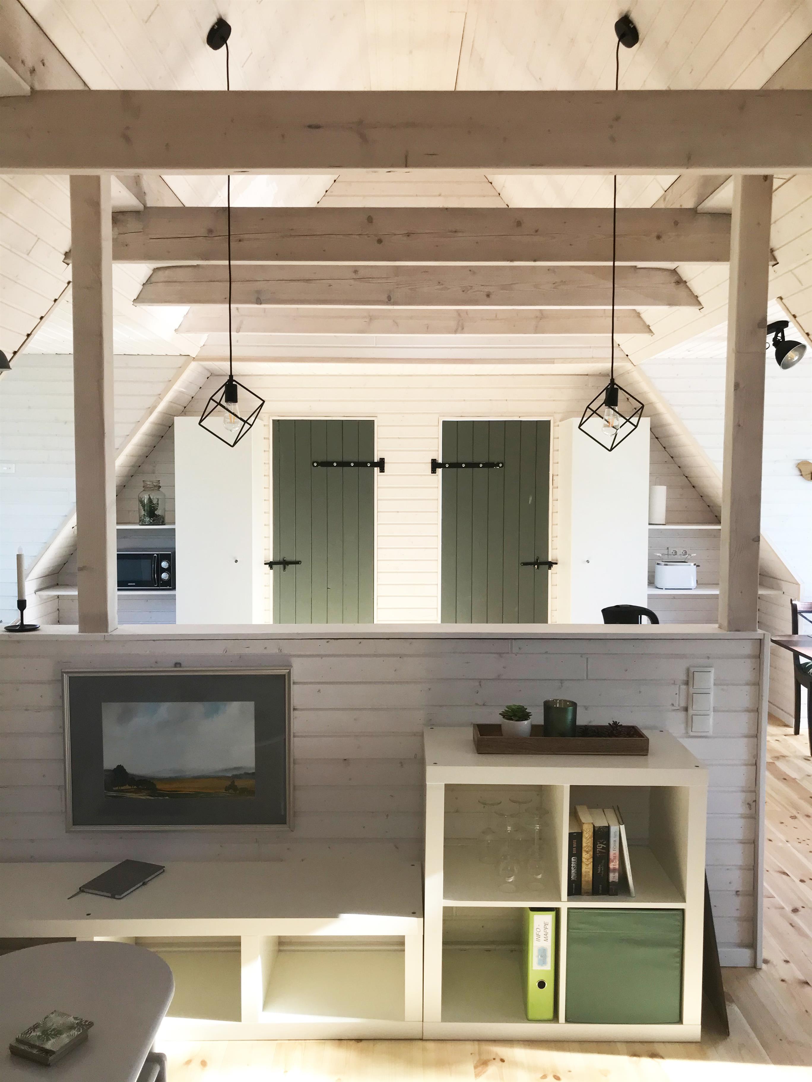 Die "Waldwohnung" ist eine moderne, im skandinavischen Stil eingerichtete Ferienwohnung im Dachgeschoss für bis zu zwei Personen. Die Wohnung besteht aus einem offenem Wohn- und Esszimmer sowie einer gut ausgestatteten Küche die über eine halbhohe Wand vom Wohnraum abgetrennt ist, sowie einem gemütlichen Schlafzimmer und einem großzügigen Bad. Die Küche verfügt über einen Backofen mit Kochfeld, einen Geschirrspüler, eine Mikrowelle und einen Kühlschrank mit Gefrierfach. Im Schlafraum ist ein Doppelbett mit Blick auf einen wandhängenden Fernseher vorhanden. Im Badezimmer ist eine großzügige Dusche mit verglaster Duschkabine, ein Waschtisch mit Stauraum und ein WC. Die Wohnung erschließt sich über eine kurze Treppe mit vorgelagertem Balkon. Aus der im Dachgeschoss liegenden Ferienwohnung blickt man in den großen grünen Garten und die Wipfel der Bäume, die das Grundstück umsäumen. In der Einrichtung spiegelt sich dies Thema wieder. So erschließt sich der Name "Waldwohnung". Die Fußböden sind aus geölten Holzdielen oder rustikalen Fliesen in warmen Farben. Die Wände sind im skandinavischen Design mit lasierten Brettern in weiß verkleidet, die Deckenbalken - ebenfalls weiß lasiert - sind sichtbar. Große vollverglaste, bodentiefe Gauben lassen viel Tageslicht in die helle Wohnung. Genießen Sie von der großzügigen Terrasse, das Rauschen der Blätter, das vielstimmige Vogelkonzert, das Spiel von Licht und Schatten und den Blick in die Bäume und den schleswig-holsteinischen Himmel. Zu der Wohnung gehört eine sehr große voll möblierte Terrasse mit Sonnenliege, Tisch und Stühlen, sowie Grill und Sonnenschirm.