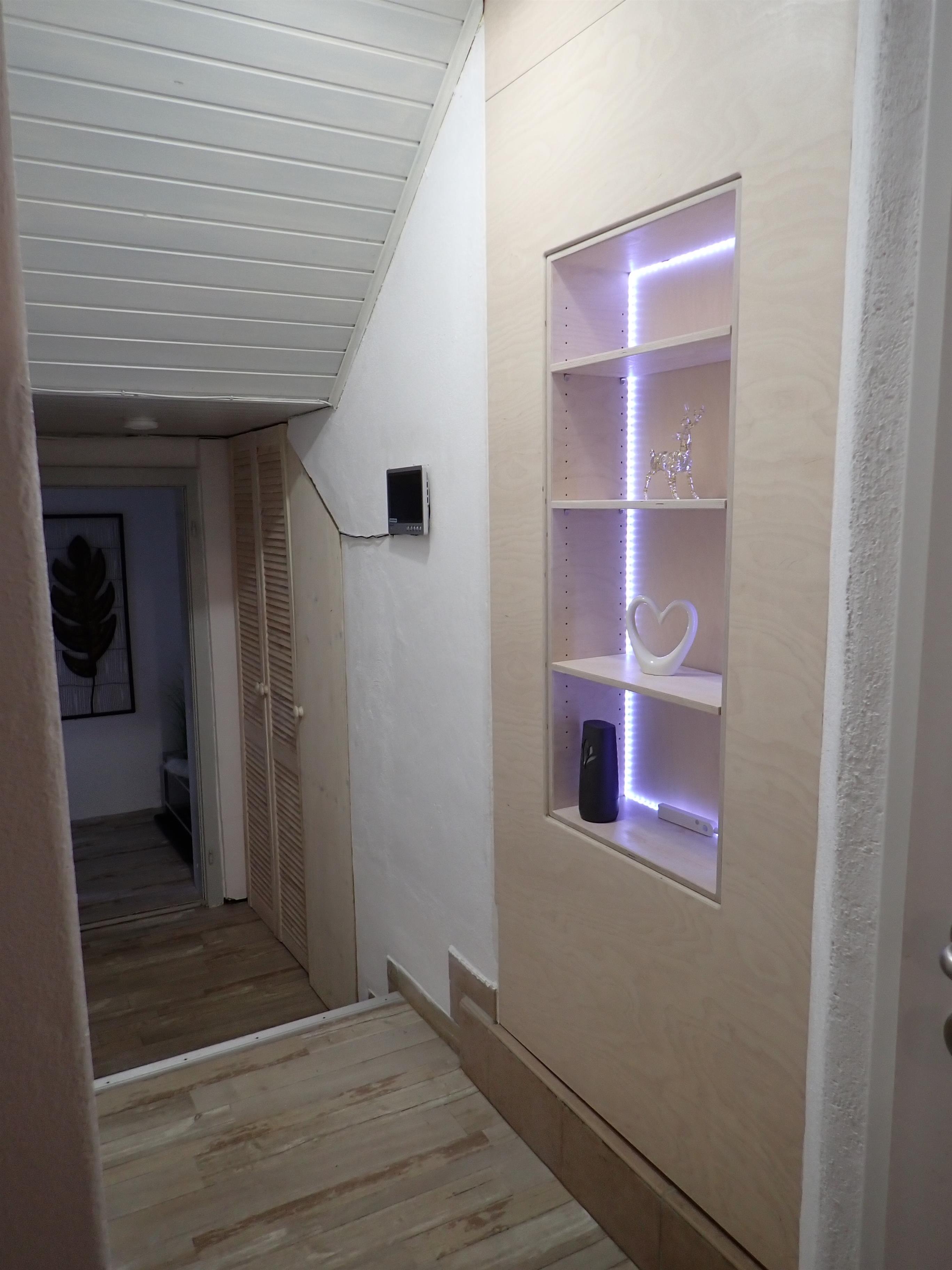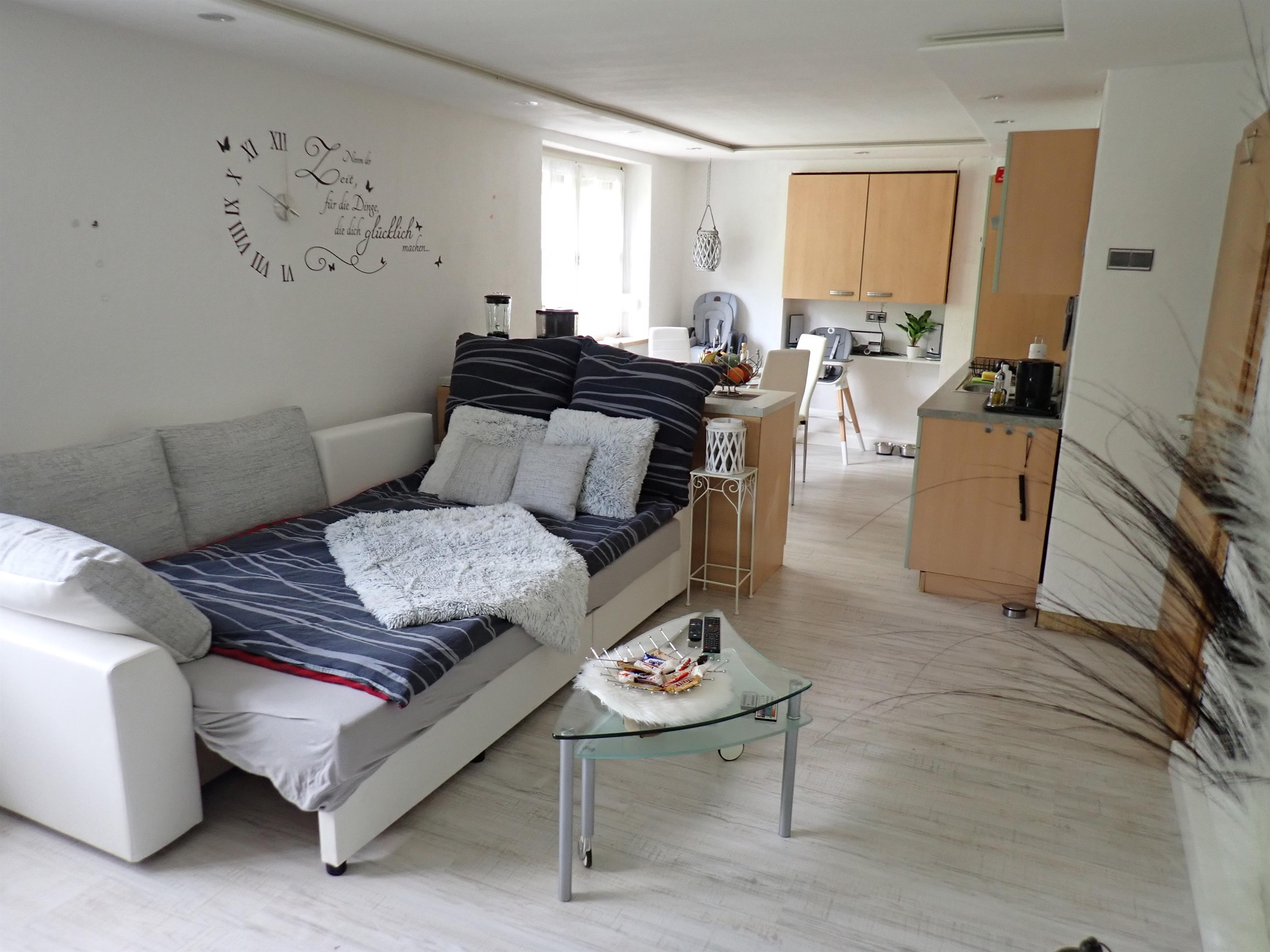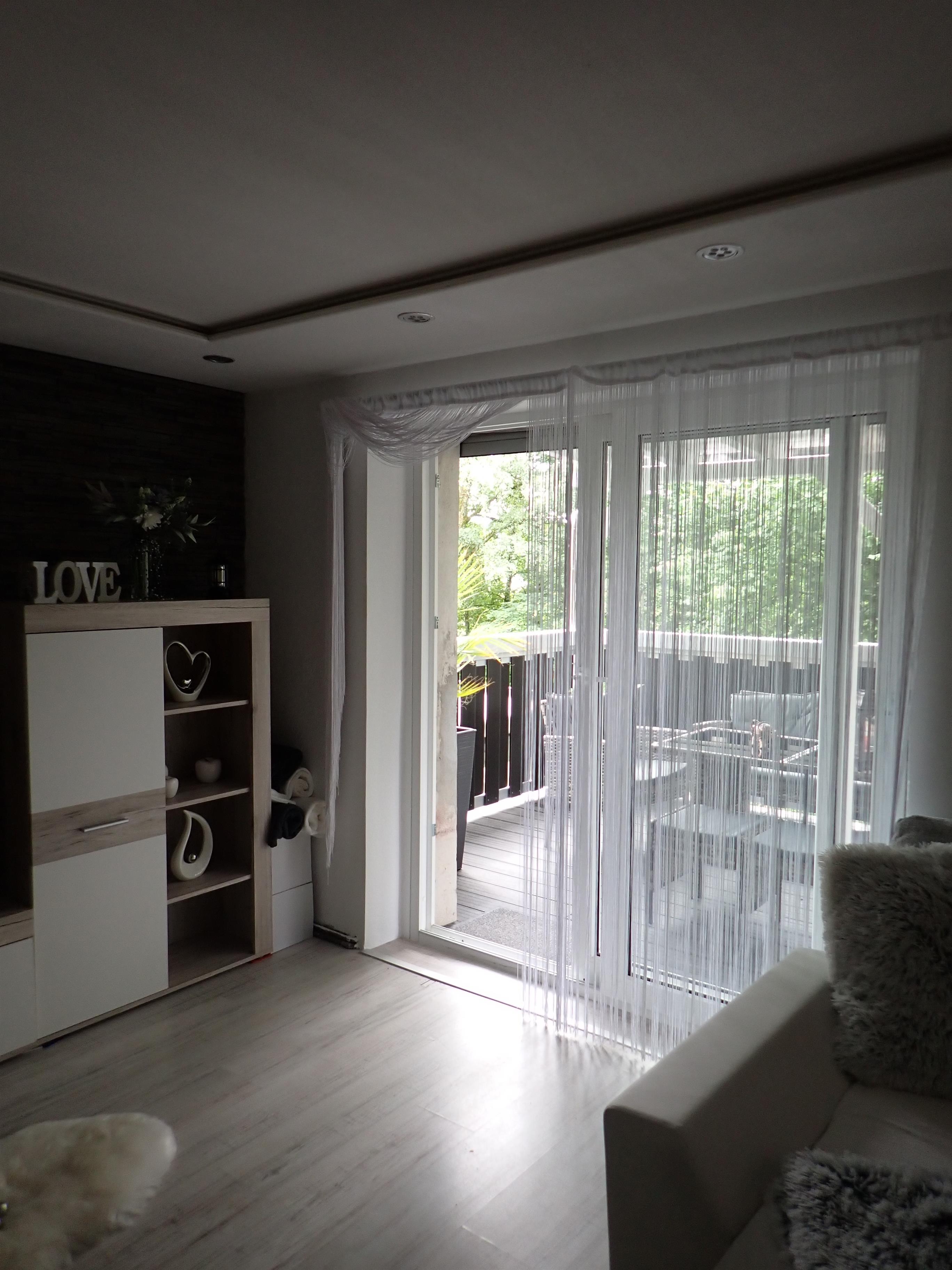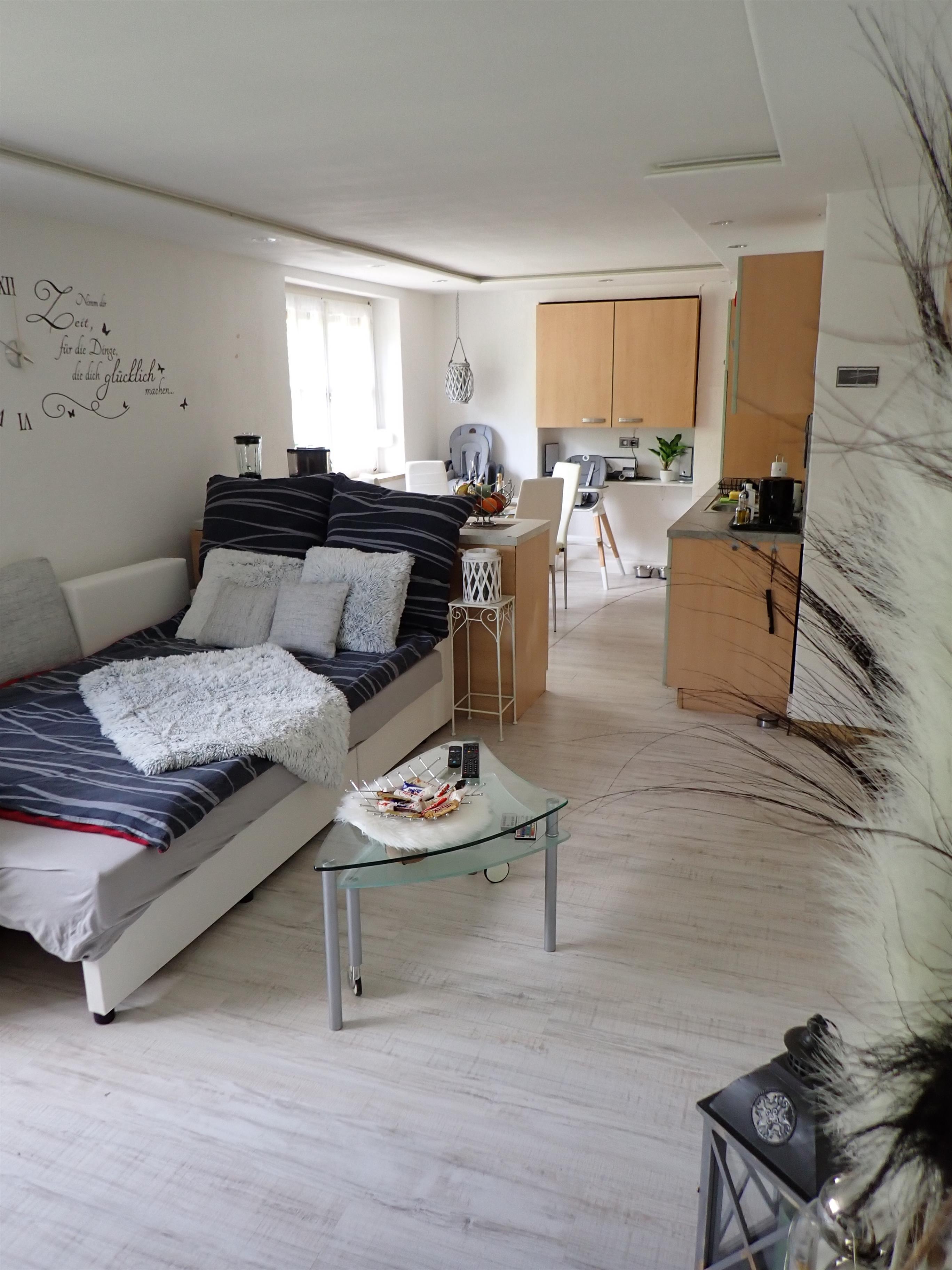 Das Wohnzimmer ist ausgestattet mit einer 140*200cm Schlafcouch, Internet TV über Waipu TV, CD Radio sowie einigen Gesellschaftsspielen und Büchern. Die indirekte Beleuchtung durch ein besonderes Lichtkonzept sowie Lichtszenen und gemütliche Dekoration laden zum entspannen ein. Von hier aus haben sie Zugang zur großzügigen Terrasse.