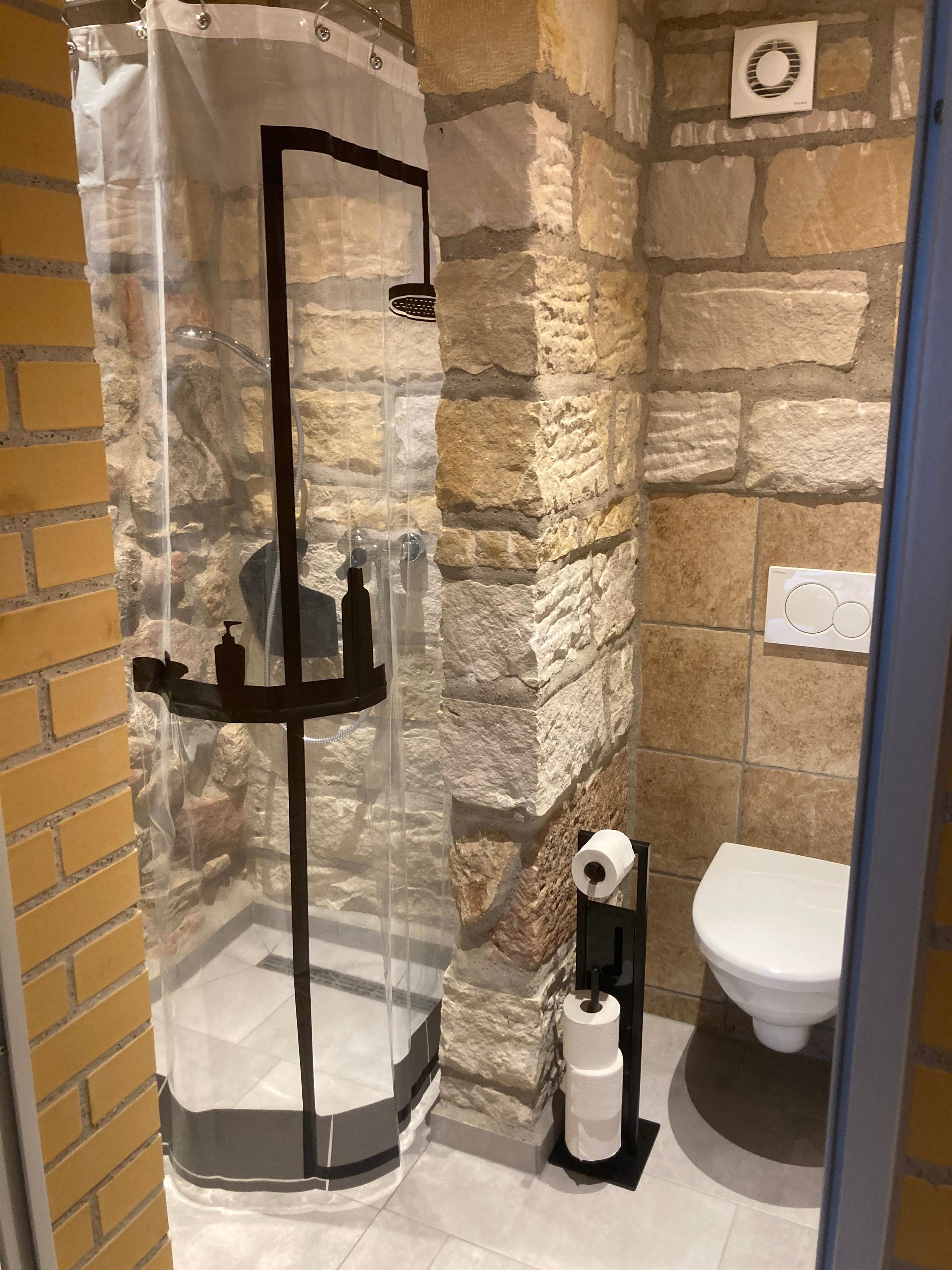 schließt sich im zweiten Raum der kombinierte Wohn-, Schlafbereich an.Außerdem betritt man von daher auch das Badezimmer.Dieses ist vollständig aus Natursteinen gebaut und integriert WC, Waschbecken und Dusche.Beheizt wird es über eine Fußbodenheizung.