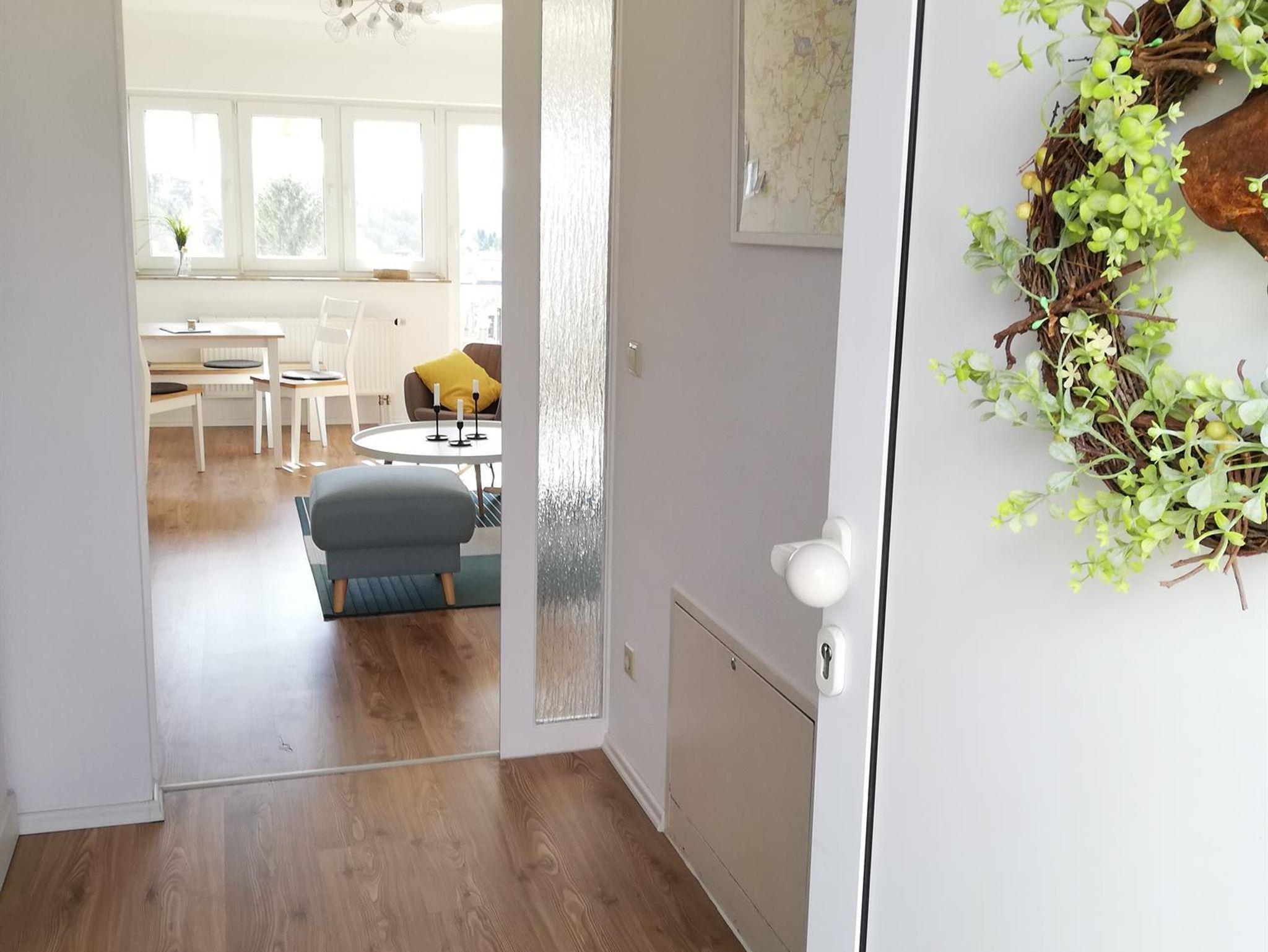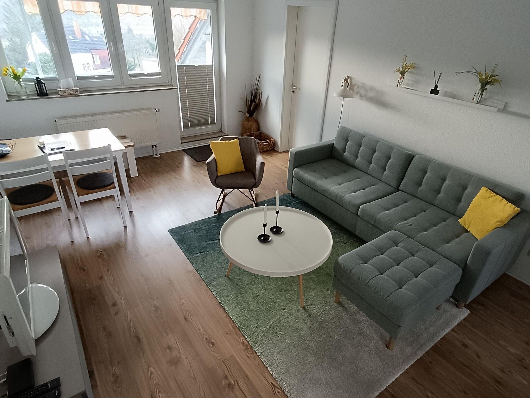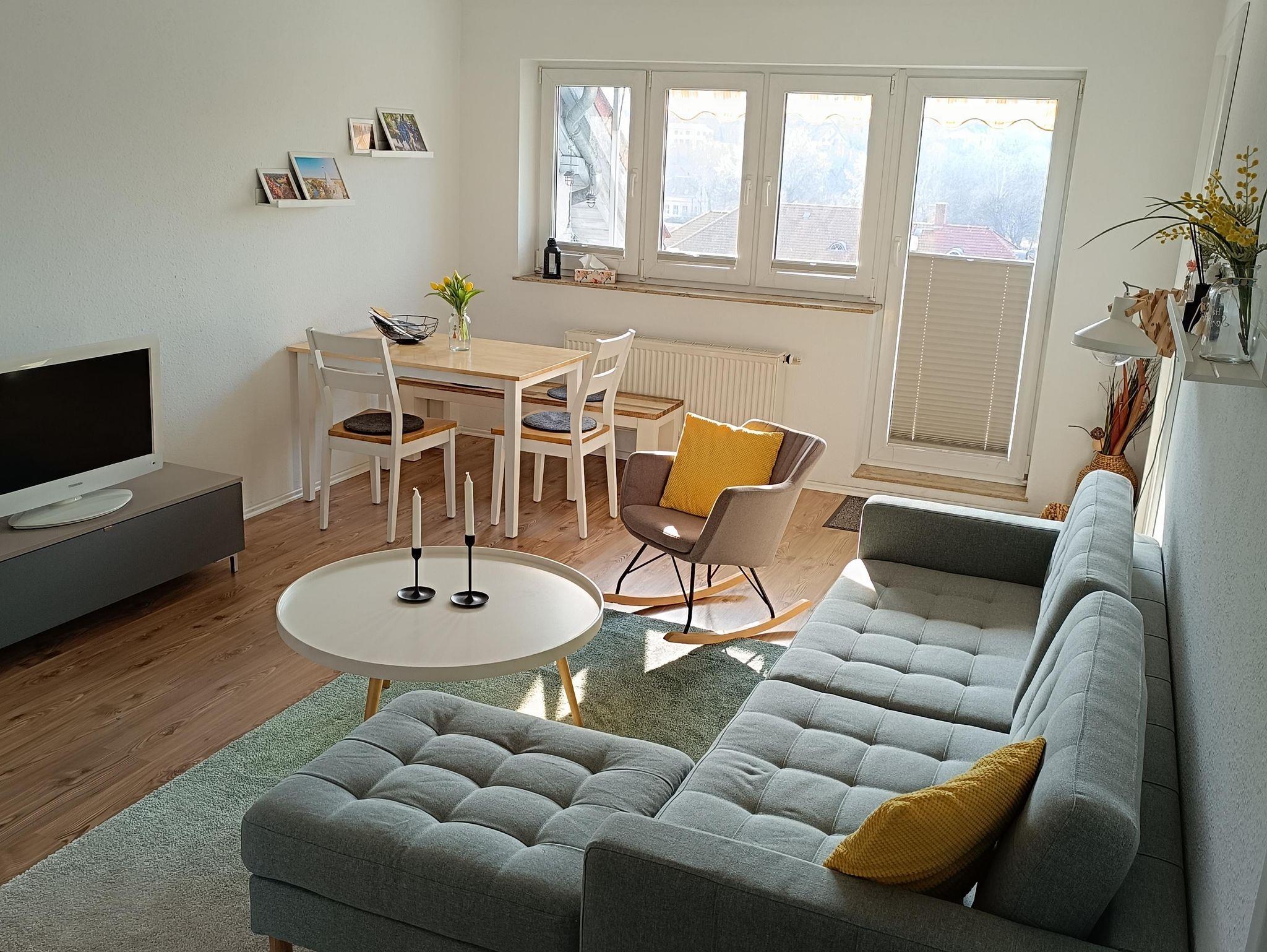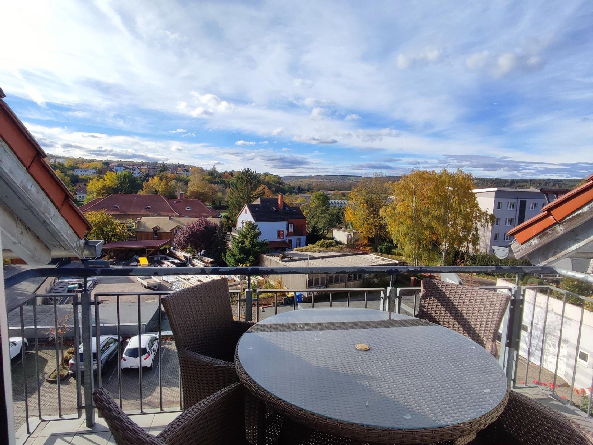 Die Ferienwohnung befindet sich im 3. Stockwerk eines Mehrfamilienhauses. Sie ist modern und liebevoll eingerichtet. Mit Blick vom Südbalkon auf die schöne Saaleaue sowie die Weinberge.