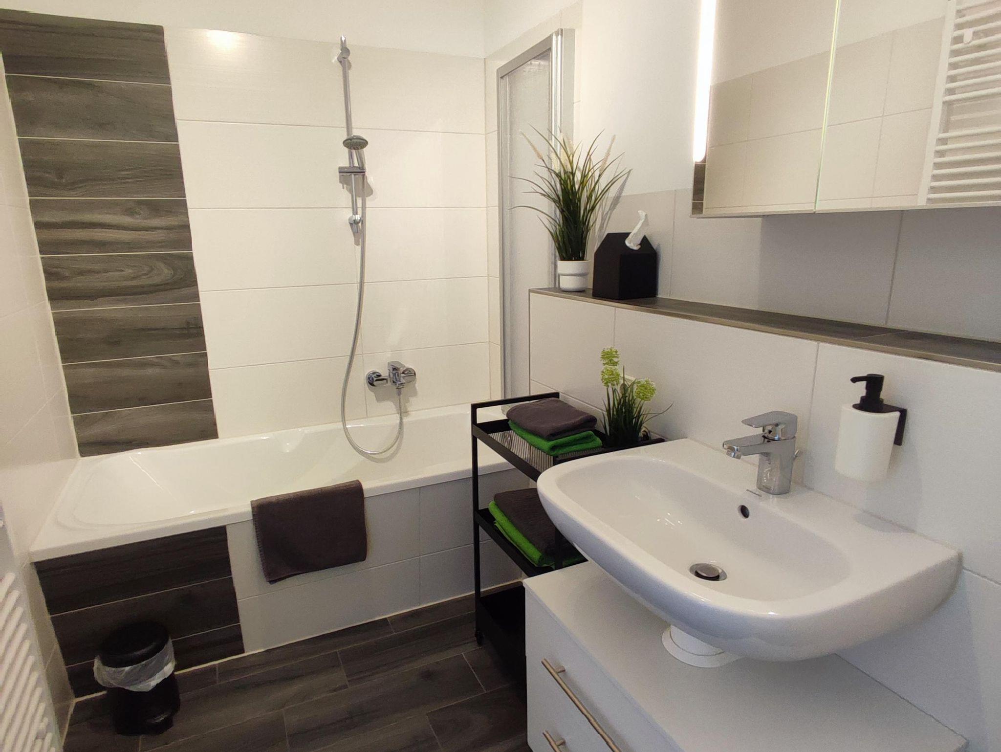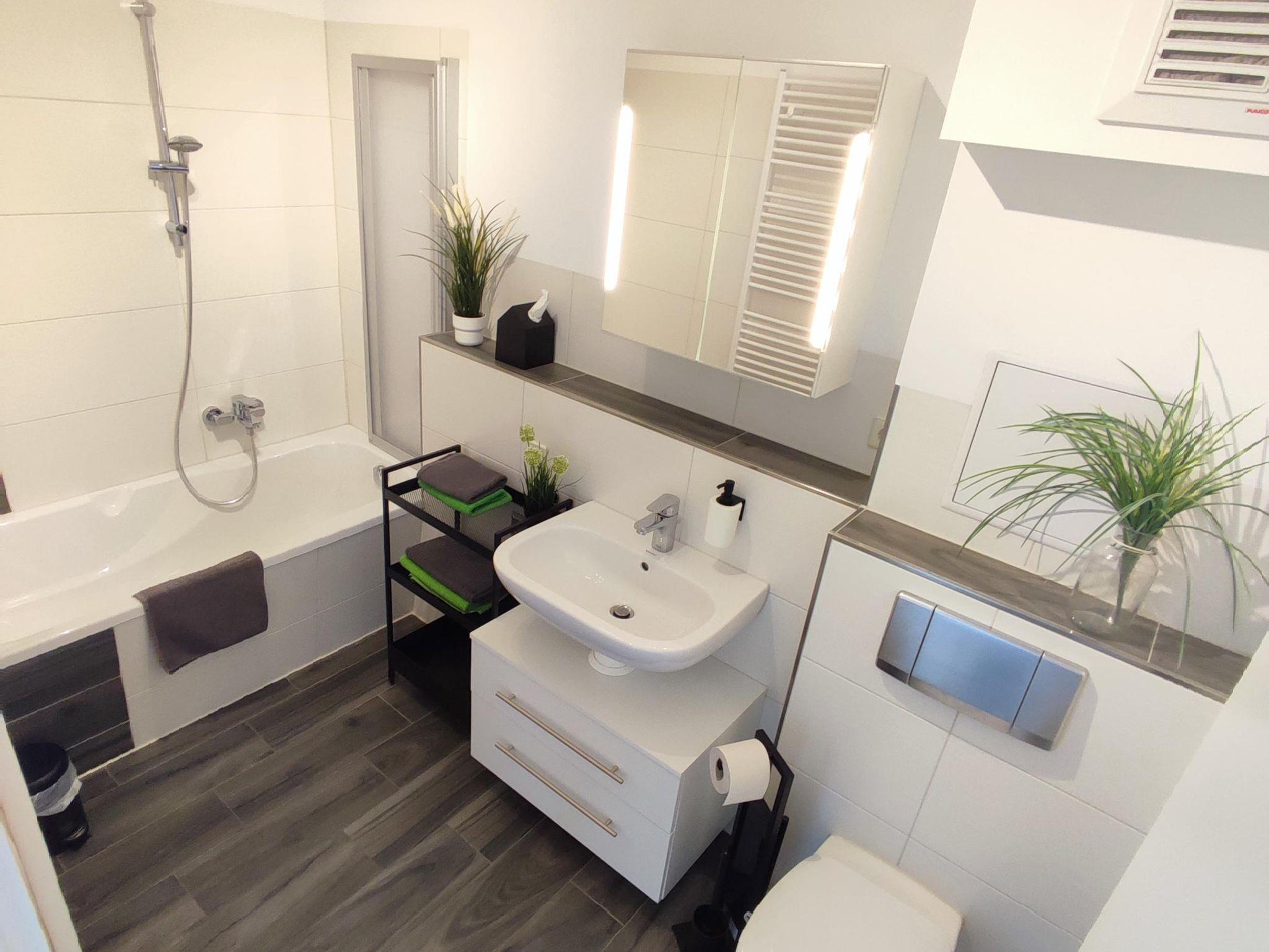 Unser Badezimmer verfügt über eine Wanne mit Duschaufsatz sowie ein WC. Ein großer Spiegelschrank & ein Handtuchhalter runden das Badezimmer ab.