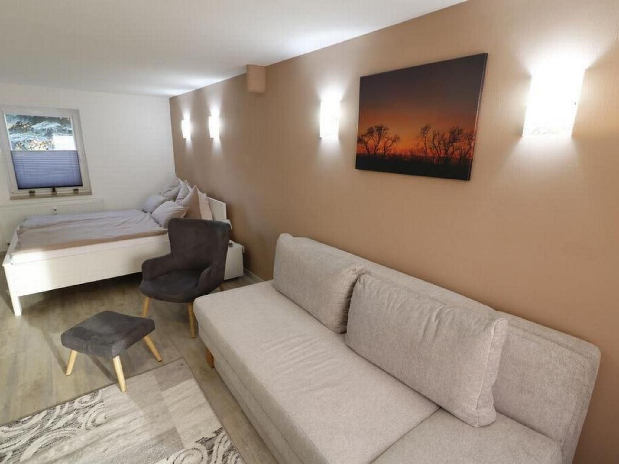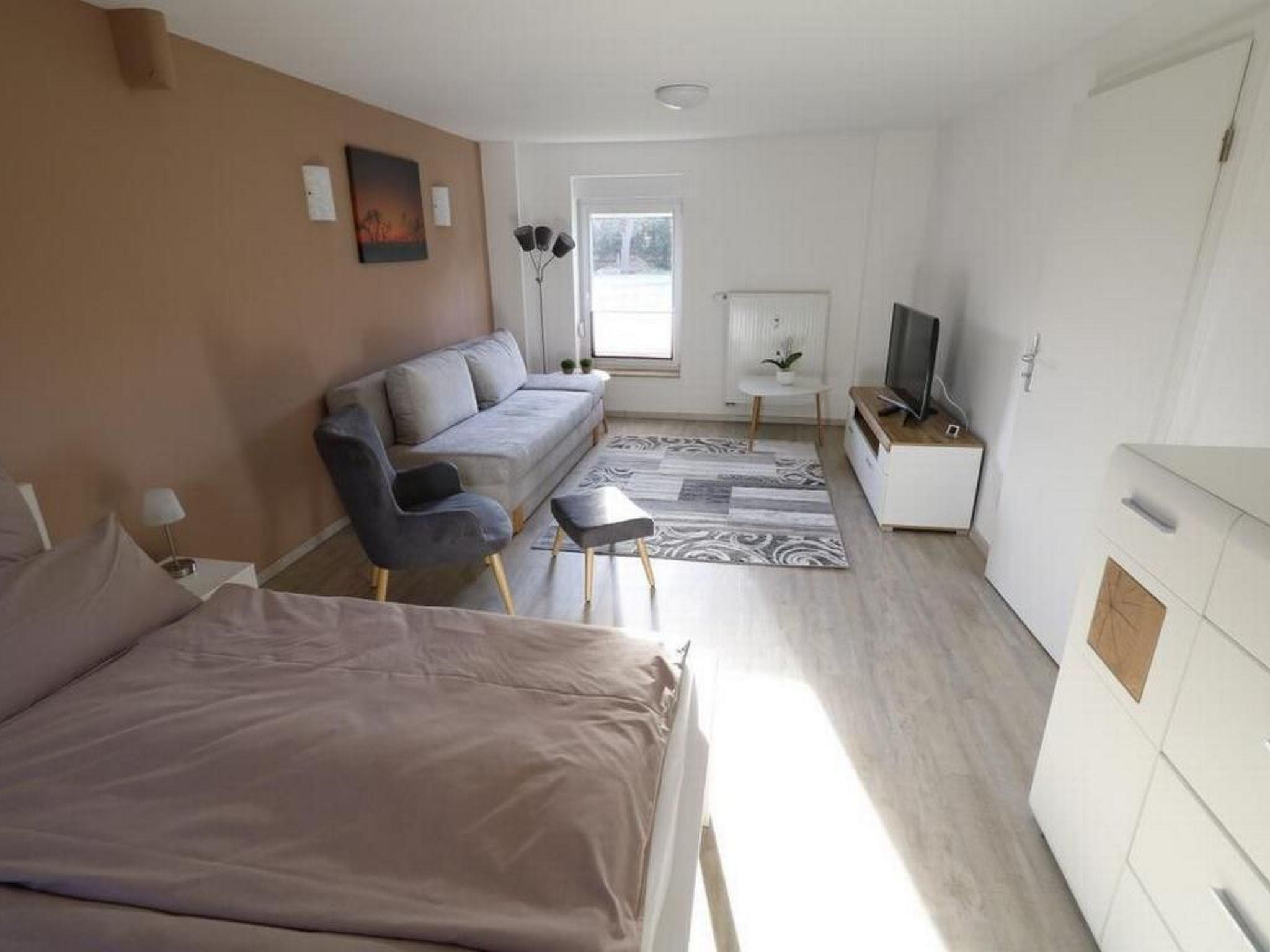 Inside, a spacious combined living and sleeping area awaits you, furnished with a high-quality double bed (160x200) and a comfortable sofa bed with a spring mattress. The 47 square metre flat also has a tastefully furnished dining room as well as a fully equipped kitchen and a modern bathroom with shower and WC, designed to make your stay as pleasant as possible.