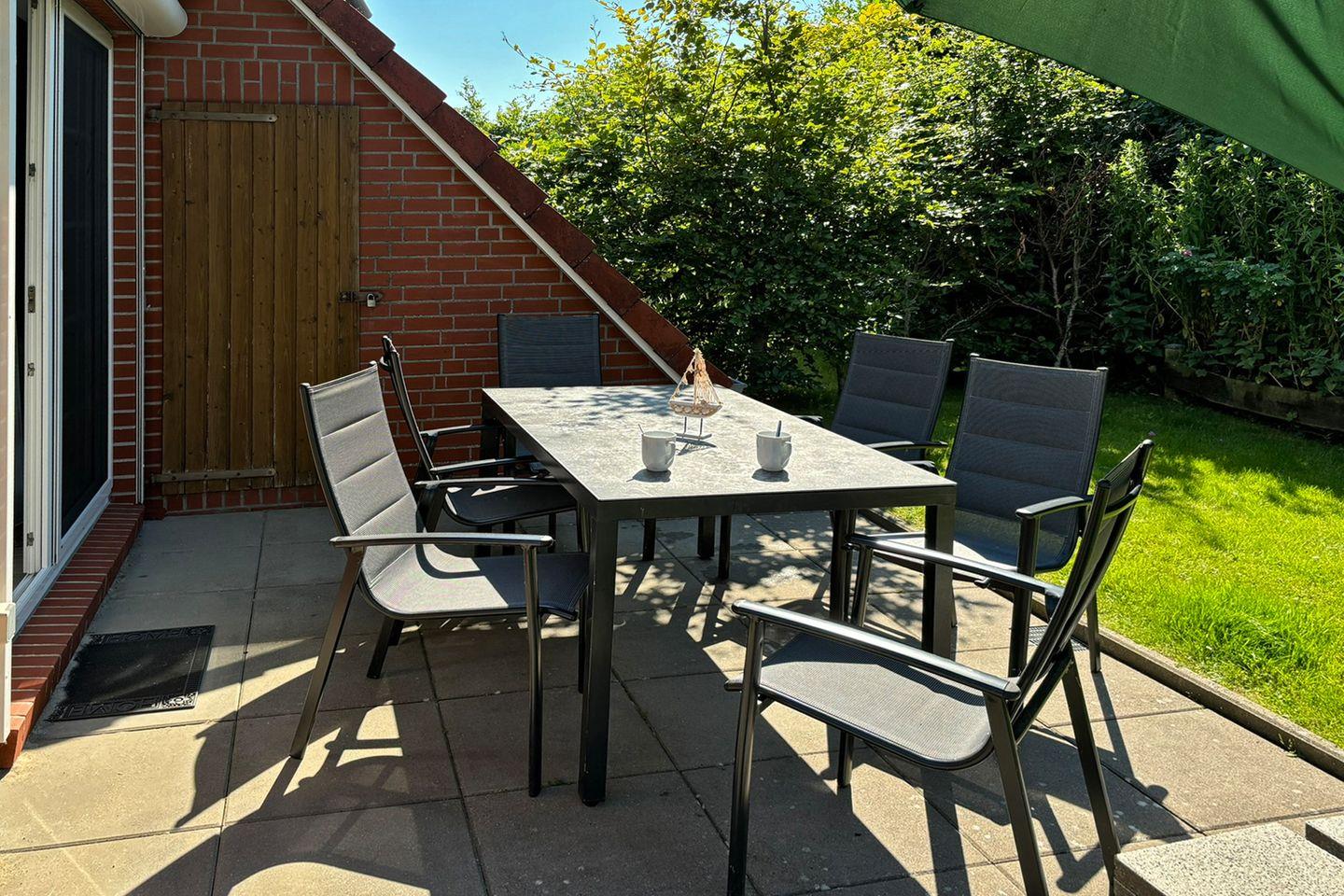 Die Terrasse mit Garten bietet viel Raum zur Erholung, Gartenmöbel, Sonnenschirm und Grill sorgen für entspannte Stunden. Ein Babybett und Hochstuhl stehen bereit; das Haus ist allergikergerecht und Nichtraucherunterkunft. Ein kostenfreier Privatparkplatz ist vorhanden.