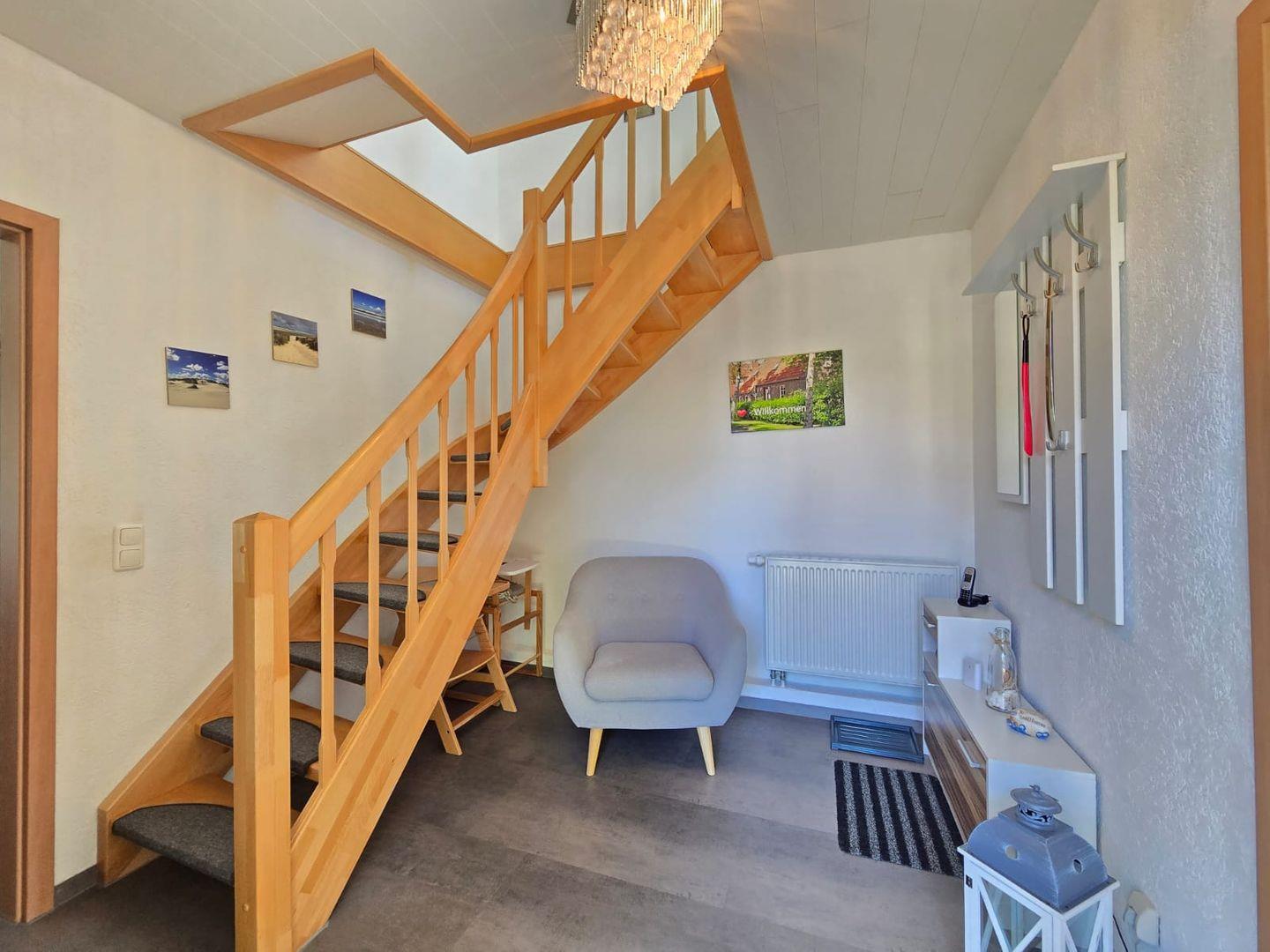 Über eine offene Treppe im Flur erreichen Sie das Obergeschoss mit zwei Schlafzimmern: