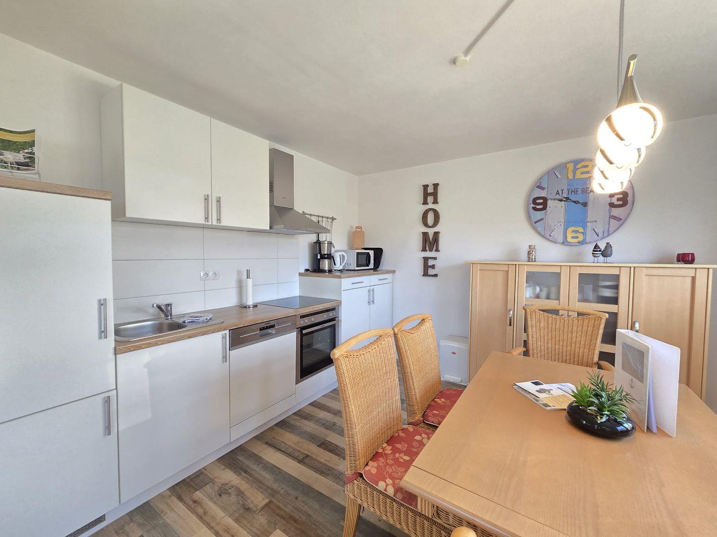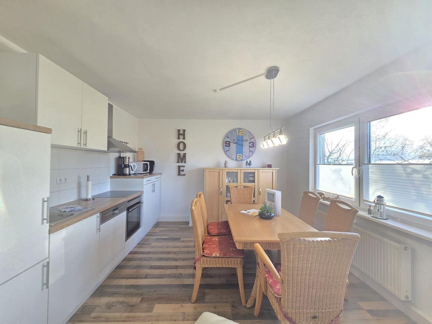 Die moderne, voll ausgestattete Küche bietet alles, was Sie zum Kochen benötigen: Herd, Backofen, Kühlschrank, Kaffeemaschine und Geschirrspüler. Die großzügige Essecke ermöglicht gesellige Mahlzeiten und entspannte Familienzeiten.