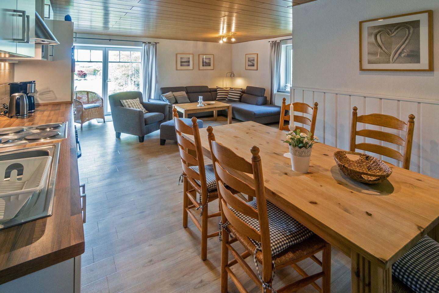 Die Wohnung Seegras verfügt über einen großen Wohn- und Essbereich mit angrenzender voll ausgestatteter Küche, zwei moderne Schlafzimmer (mit einem Ehebett und einem Doppelbett von 1,40 m) und ein Duschbad mit WC. In der Küche ist zudem noch eine Waschmaschine vorhanden. Zur Wohnung gehört eine Terrasse mit Garten. Ein PKW-Stellplatz ist für Sie hinterm Haus. Das WLAN steht Ihnen kostenlos zur Verfügung.