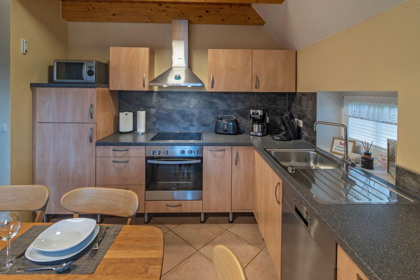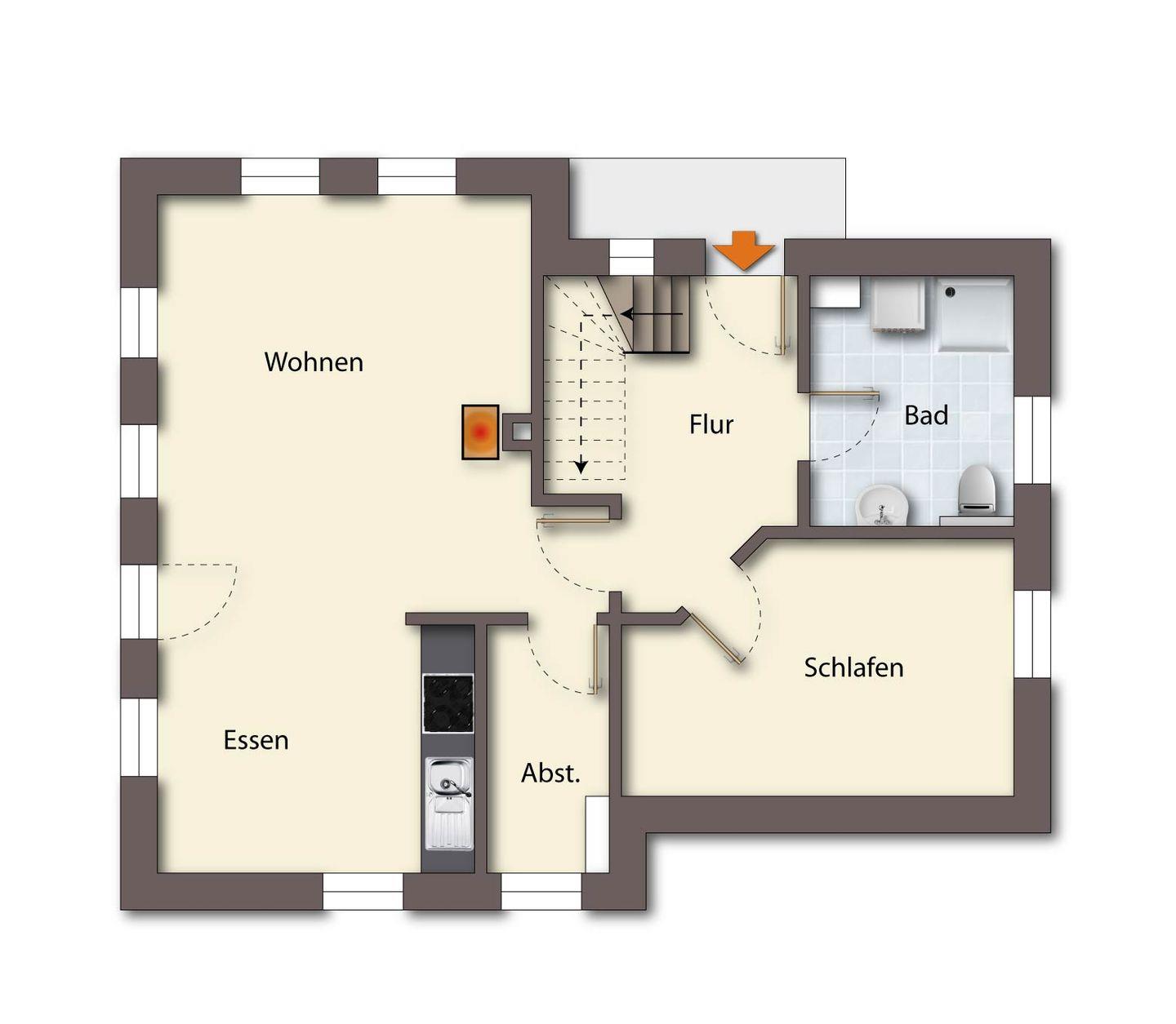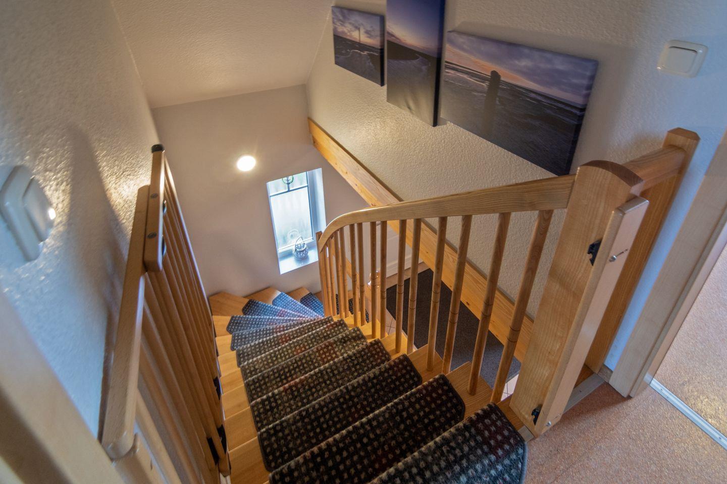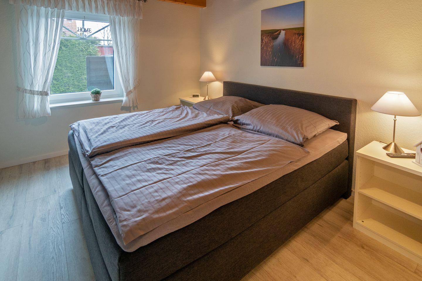 Im Erdgeschoss des Hauses erwartet Sie ein lichtdurchfluteter, gemütlicher Wohn- und Essbereich, der zum Entspannen und geselligen Beisammensein einlädt. Die angrenzende, voll ausgestattete Küche lässt keine Wünsche offen und bietet alles, was Sie für die Zubereitung Ihrer Mahlzeiten benötigen. Ein Schlafzimmer mit einem komfortablen Boxspringbett sorgt für erholsamen Schlaf. Das moderne Duschbad mit WC ergänzt das Raumangebot im Erdgeschoss.