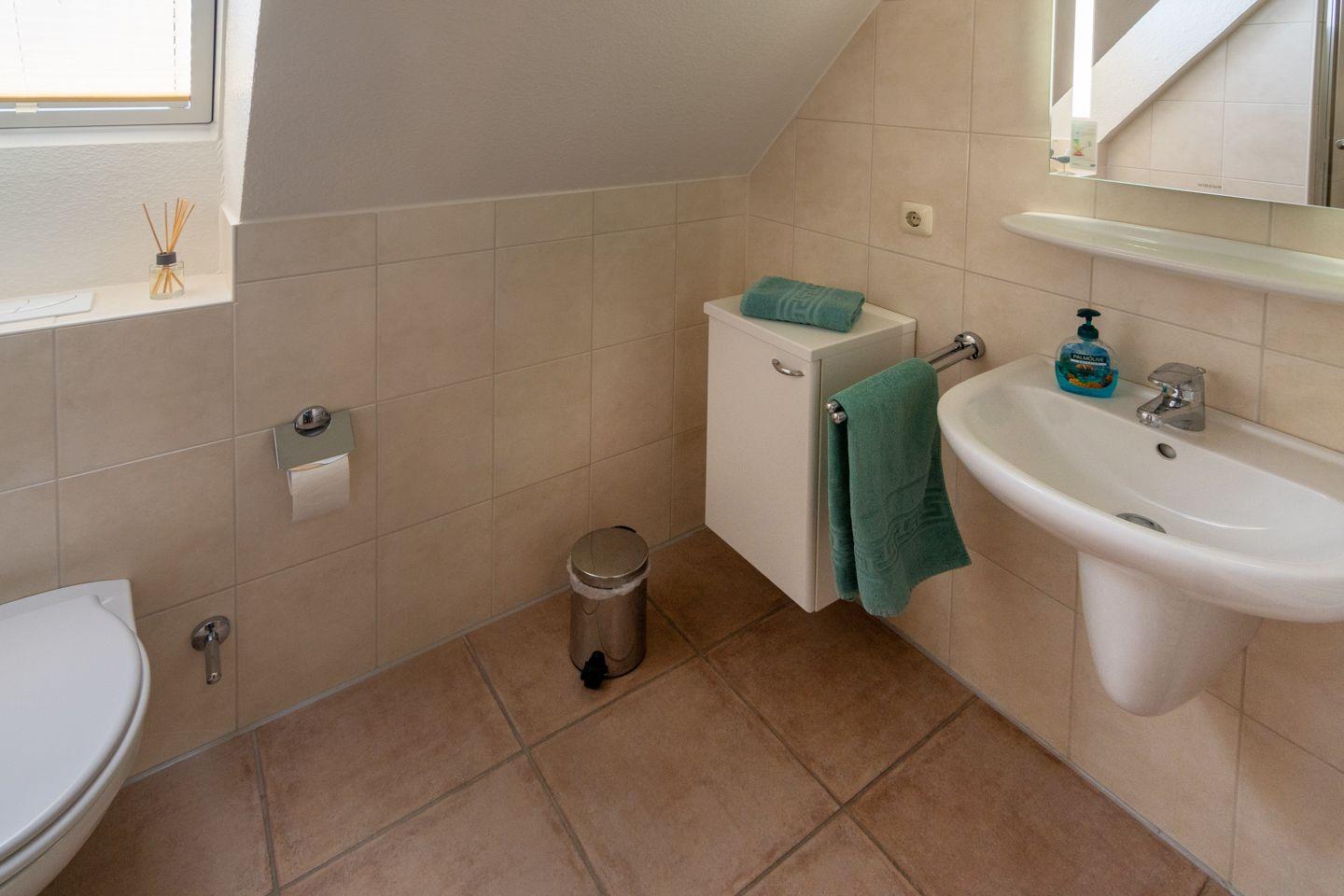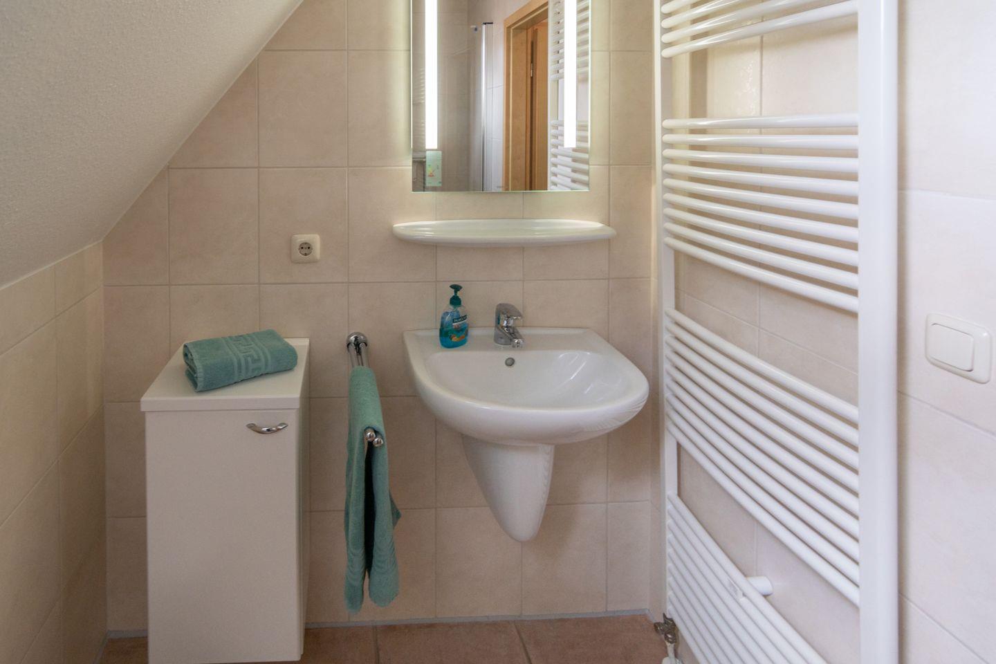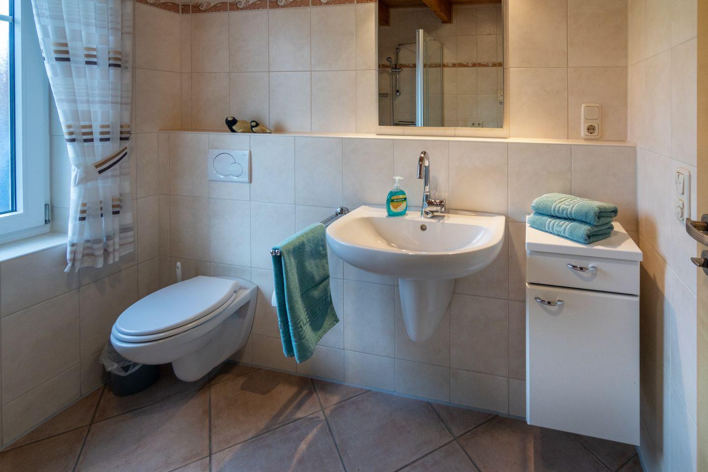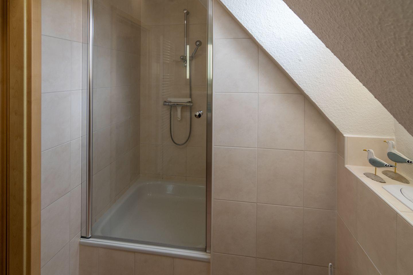 Im Obergeschoss finden Sie zwei weitere Schlafzimmer. Eines ist mit einem Boxspringbett ausgestattet, das andere mit einem Boxspringbett und einem Einzelbett – ideal für Familien. Ein weiteres Duschbad mit WC sorgt für zusätzlichen Komfort im Obergeschoss.