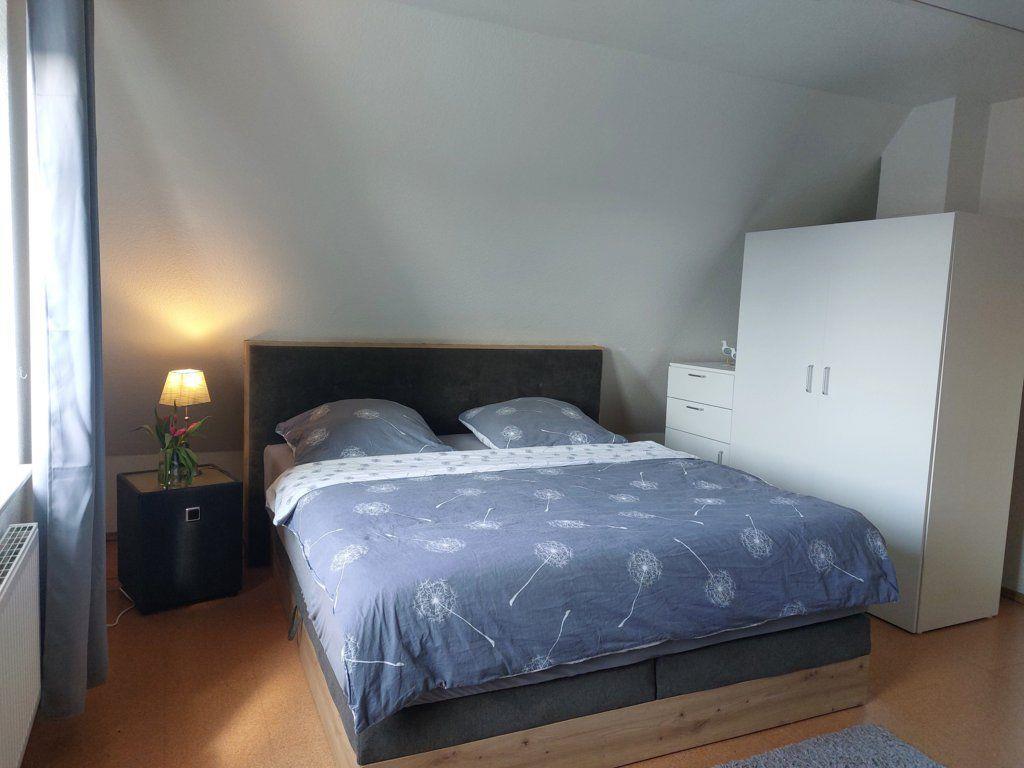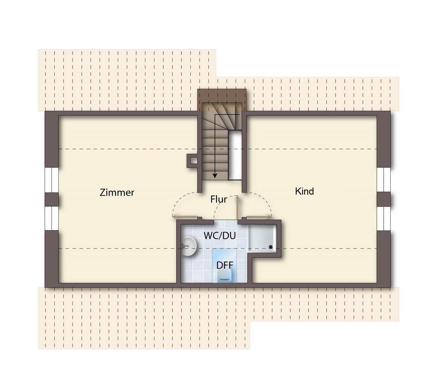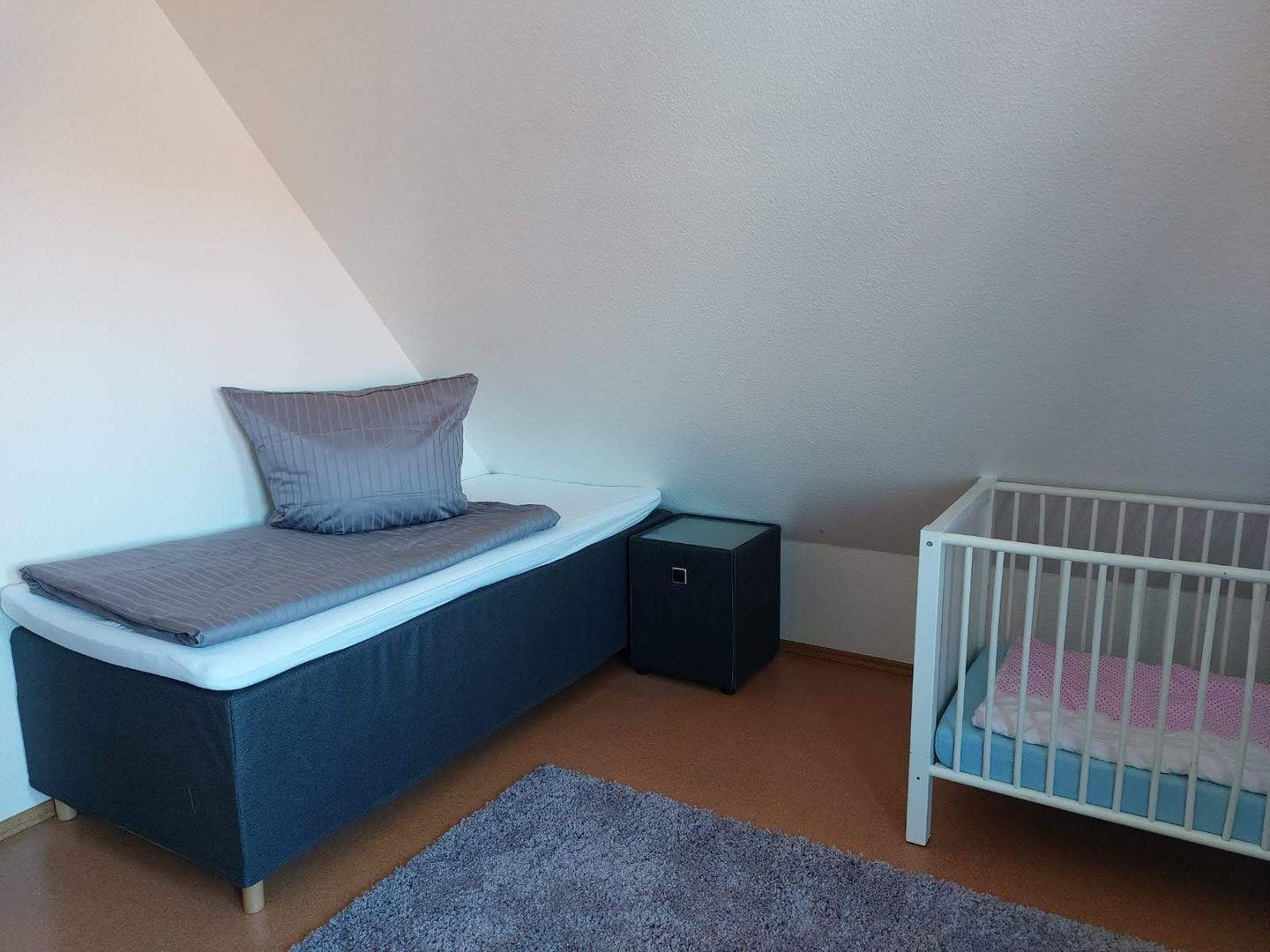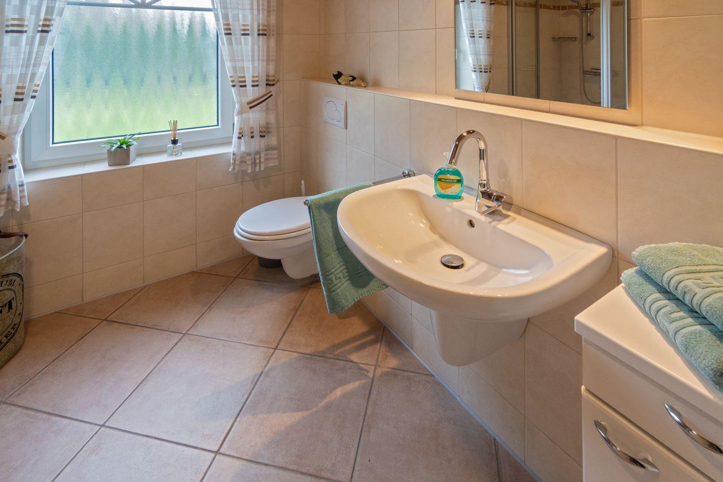 Im Obergeschoss finden Sie zwei weitere Schlafzimmer. Eines ist mit einem Boxspringbett ausgestattet, das andere mit einem Boxspringbett und einem Einzelbett – ideal für Familien. Ein weiteres Duschbad mit WC sorgt für zusätzlichen Komfort im Obergeschoss.