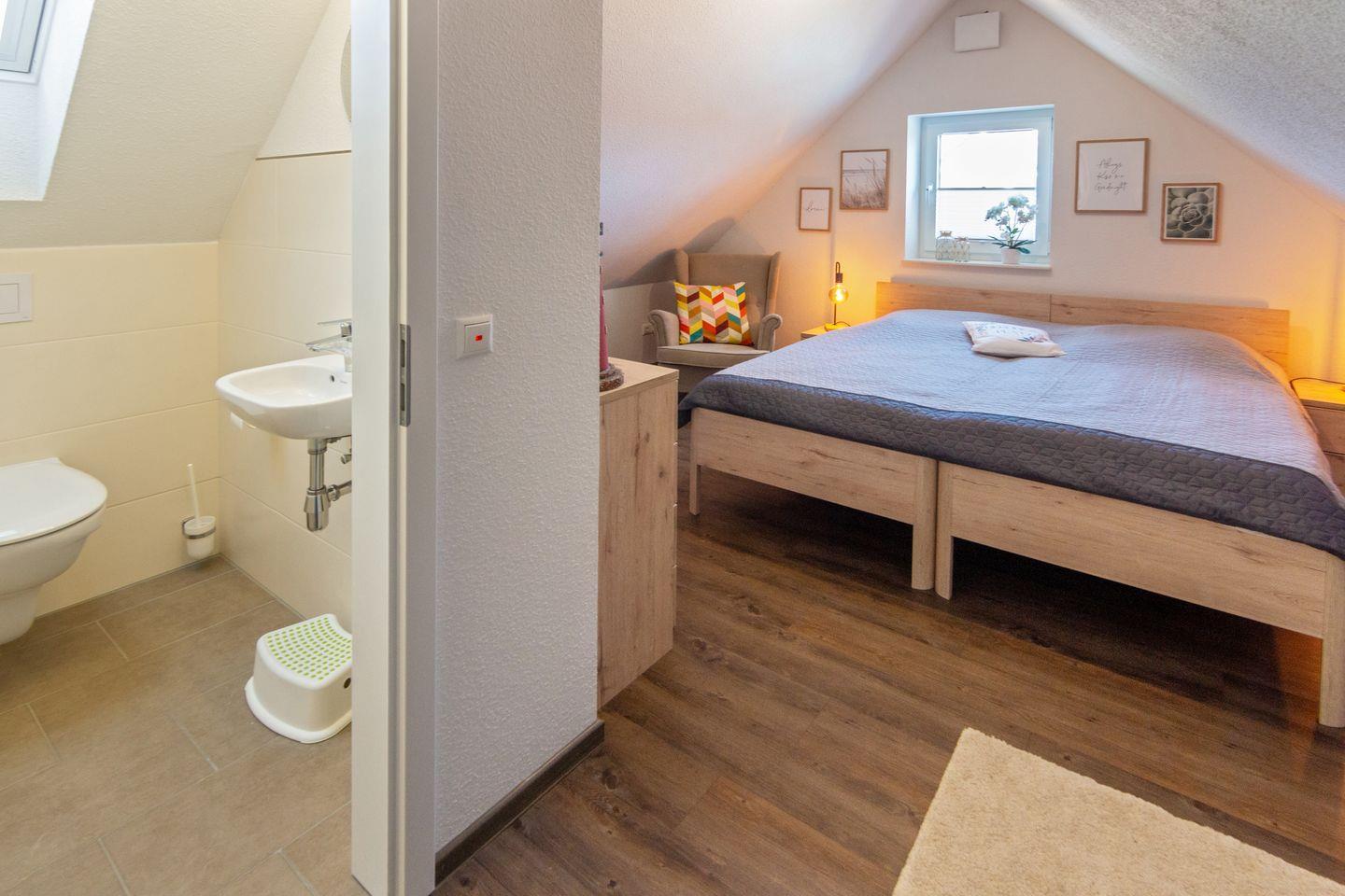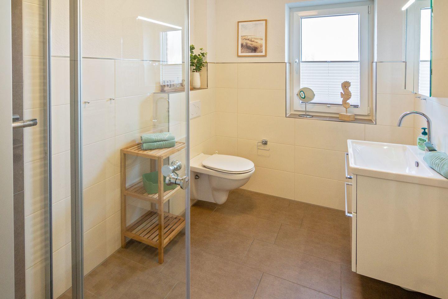 Ein weiteres Highlight dieser Unterkunft ist das Badezimmer mit bodengleicher Dusche, Waschbecken und WC. Hier finden Sie alles, was Sie für Ihr tägliches Wohlbefinden benötigen. Zudem stehen Ihnen bei Bedarf eine Waschmaschine und ein Trockner zur Verfügung, während Sie nach einer aufregenden Radtour oder einem Tag am Strand Ihre Wäsche frisch und sauber halten können.