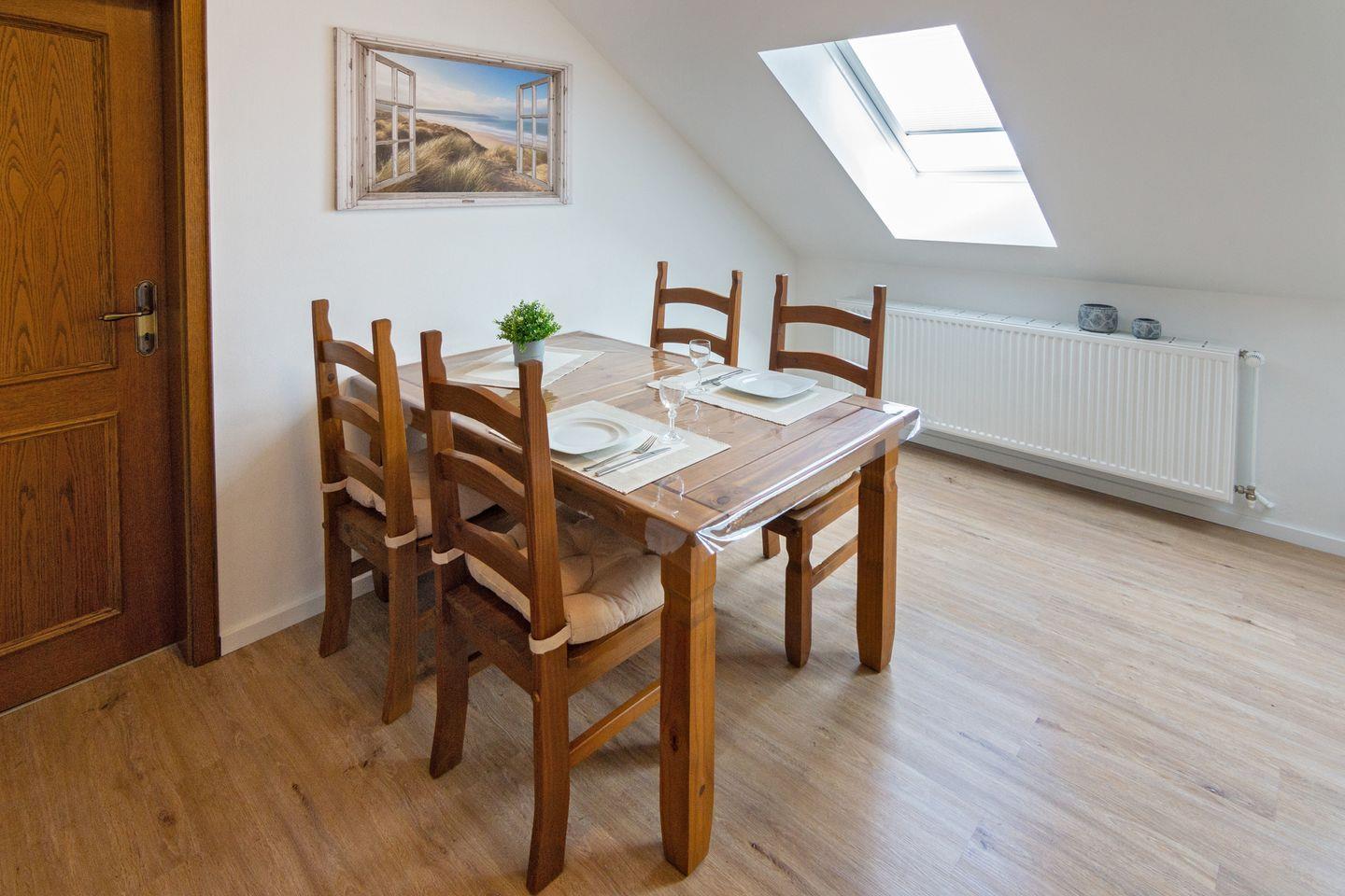 Die voll ausgestattete Küche lässt keine Wünsche offen: Cerankochfeld, Backofen, Spülmaschine, Kaffeemaschine und alle nötigen Küchenutensilien sind vorhanden. Der angrenzende Essbereich lädt zu gemeinsamen Mahlzeiten ein.