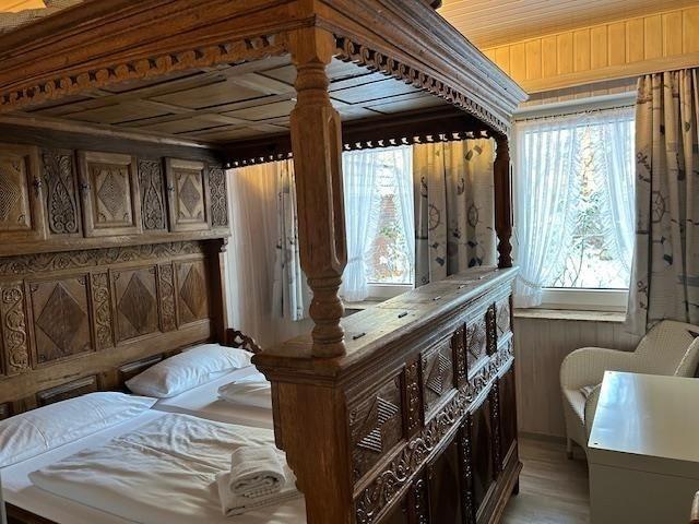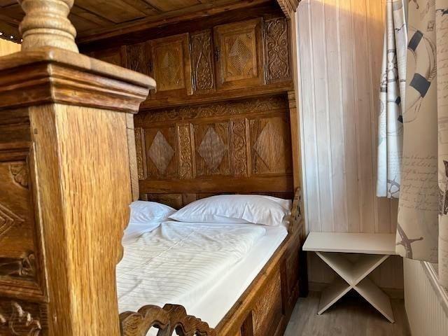 Die lichtdurchfluteten Räume zeichnen sich durch weiße Holzvertäfelungen aus. Sie bietet zwei getrennte Schlafzimmer: eines mit einem Doppelbett, Schrank, Spiegel und Kommode, das andere mit einem Himmelbett.