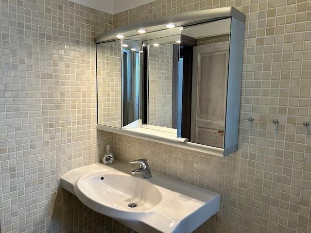 Die offene Küche im Landhausstil ist mit einem 4-Platten-Herd und einem Backofen ausgestattet, jedoch ohne Spülmaschine. Das Badezimmer verfügt über WC und eine Dusche mit einem Einstieg von 30 cm.