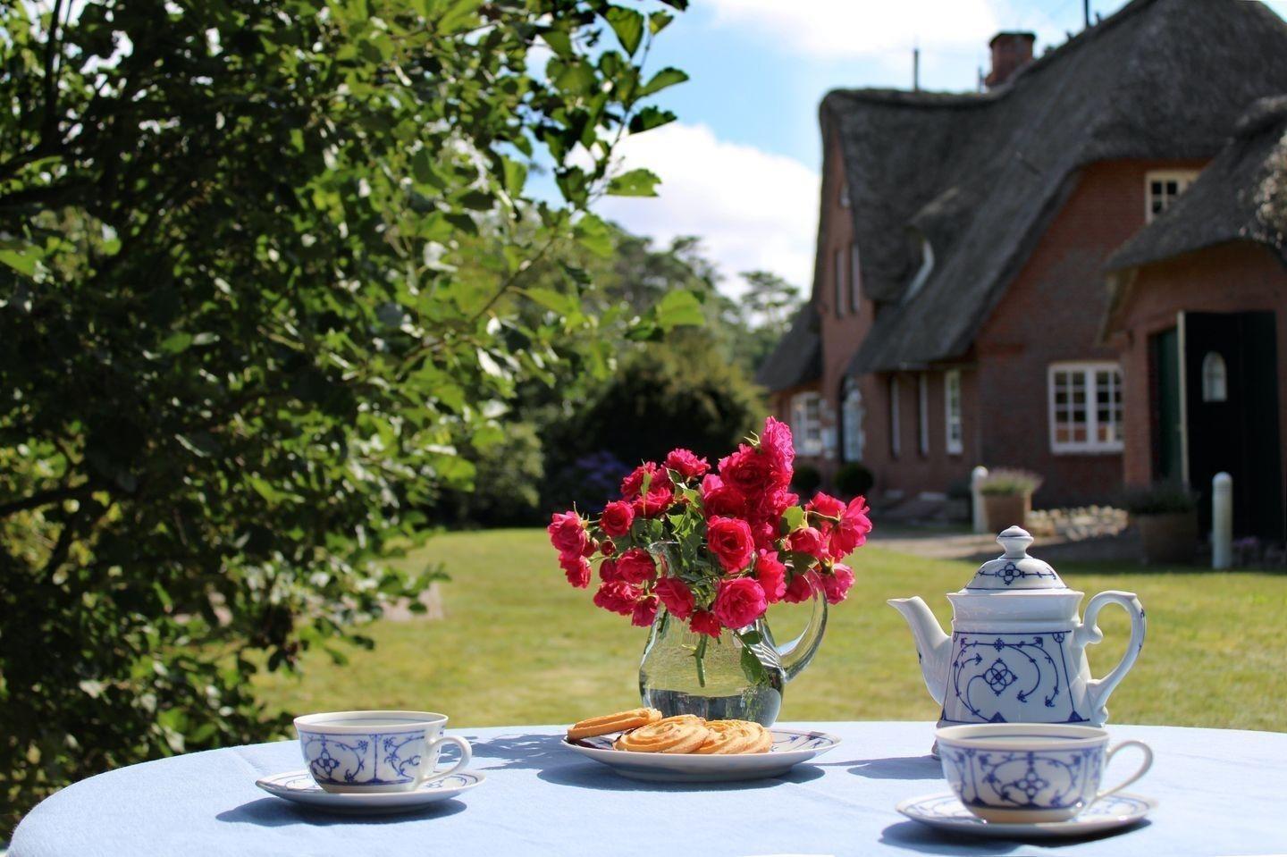 Das freistehende Reetdachhaus befindet sich auf einem sonnigen 3000 m² großen Gartengrundstück, das den Gästen der vier Ferienwohnungen ein ideales Ambiente für Entspannung bietet. Jede Wohnung verfügt über eine eigene Terrasse, ausgestattet mit einem Strandkorb, Gartenmöbeln und einer Sonnenliege, die zum Verweilen einladen. Inmitten der Ruhe der Umgebung kann man die Natur genießen und die nahegelegenen Strände sowie den historischen Ortskern von Nebel in wenigen Minuten erreichen. Für zusätzlichen Komfort stehen Parkplätze und Fahrradständer direkt am Haus zur Verfügung. Im Untergeschoss sind eine Münzwaschmaschine und ein Münztrockner zur gemeinschaftlichen Nutzung vorhanden. Haustiere sind erlaubt, jedoch gegen Aufpreis. Die nächste Bushaltestelle ist in etwa 5 Minuten fußläufig erreichbar.